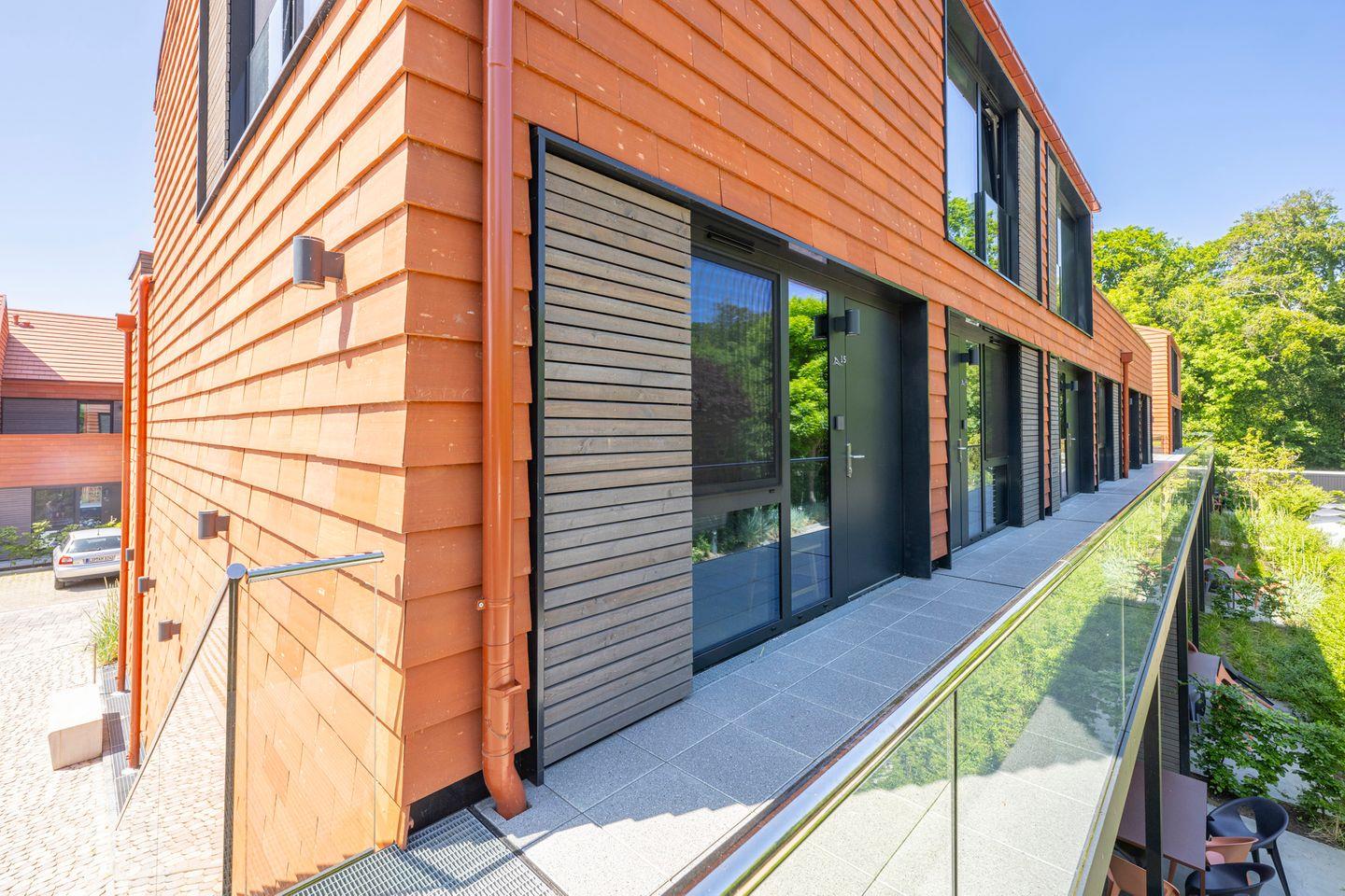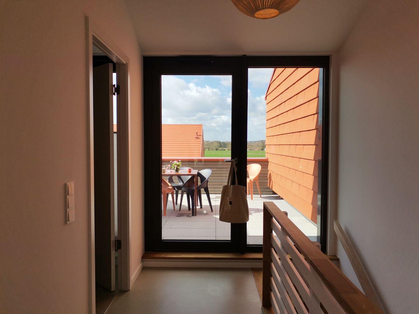 De ole School - nachhaltige Ferienwohnung mit Hygge-Feeling an der Ostsee. Zwei Geschosse mit Dachterrasse sorgen in dieser stilvollen Maisonette-Ferienwohnung für viel Freiraum. Ein separater Wohnbereich, der auch als Schlafzimmer genutzt werden kann, und ein extra Gäste-WC machen diesen Wohnungstyp besonders vielseitig und komfortabel. In der oberen Etage befinden sich ein Schlafzimmer mit einem Doppelbett, die Dachterrasse und ein schickes Badezimmer mit Dusche und WC. Der Wohn- und Essbereich, der durch eine Schiebetür abgetrennt ist, die offene Küche, das Gäste-WC und eine Abstellkammer mit Waschmaschine befinden sich in der unteren Etage. Die Ferienwohnung hat kostenloses schnelles WLAN, einen Smart-TV, eine komplette Küchenausstattung und eine Dachterrasse mit Weitblick aufs Quartier und die Felder. Ein intelligentes Schließsystem mit PIN-Code macht den Check-In flexibel. Jedes Apartment verfügt außerdem über zusätzlichen Stauraum im Keller (inkl. Fahrradkeller).