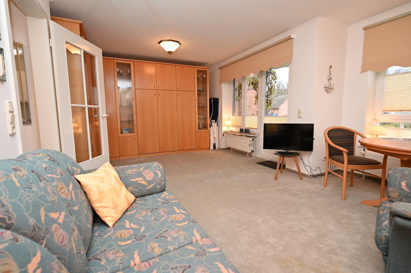 Wohnzimmer mit Schrankbett: Der Wohnbereich lädt zum Verweilen ein. Genießen Sie gemütliche Stunden, sei es beim Lesen, Fernsehen oder einfach nur beim Entspannen. Das Schrankbett fügt sich nahtlos in das Ambiente ein und bietet Flexibilität in der Raumnutzung.