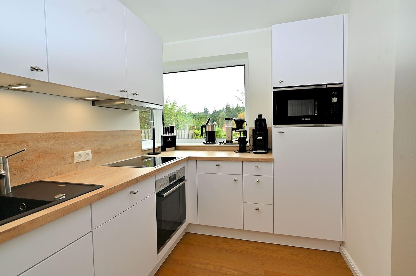 Die offene Küche ist voll ausgestattet mit hochwertigen BOSCH-Geräten: Induktionsherd, Backofen, Kühlschrank, Mikrowelle, Toaster, Wasserkocher, Mixer und Kaffeemaschine sowie allem nötigen Koch- und Essgeschirr. Hier macht das Kochen genauso viel Freude wie das Genießen.