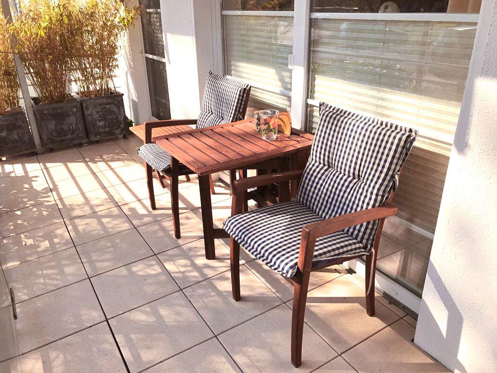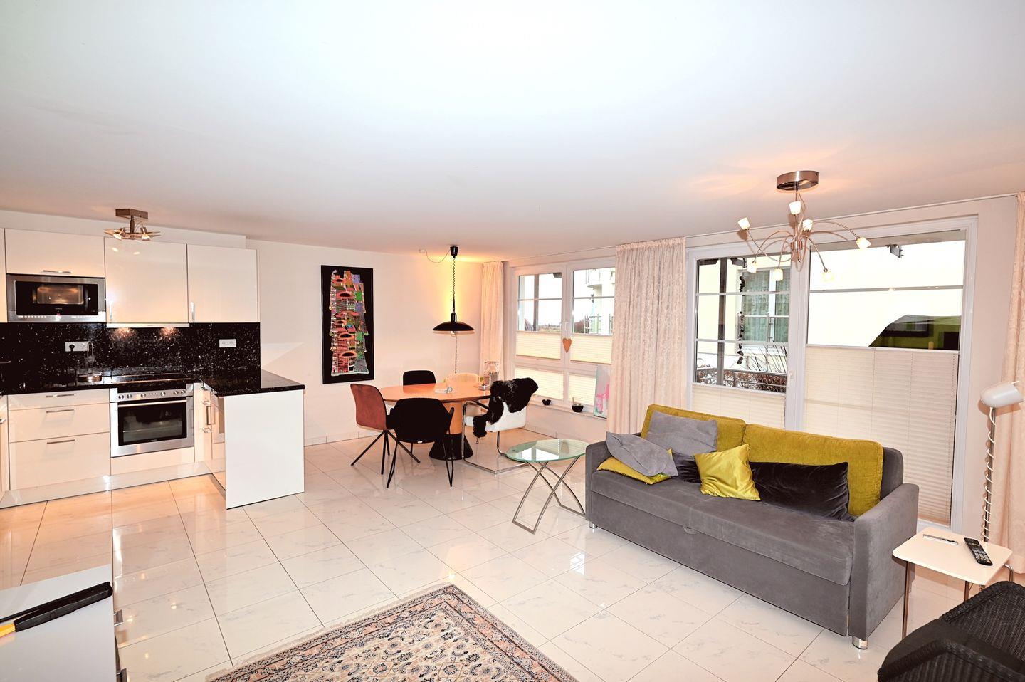 Genießen Sie die Morgensonne auf dem großzügigen Eckbalkon (Süd-Ost-Lage), ausgestattet mit bequemen Balkonmöbeln. Die offene, voll ausgestattete Küche mit Essbereich lädt zum gemeinsamen Kochen und Genießen ein.