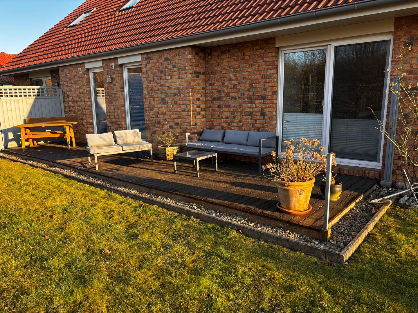 Die großzügigen zwei Terrassen laden dazu ein, die frische Luft zu genießen und bietet einen Sichtschutz für zusätzlichen Komfort. Gartenmöbel, ein Strandkorb und ein Sonnenschirm sind ebenfalls vorhanden, damit Sie die sonnigen Tage in Ruhe genießen können. Für Ihre Annehmlichkeiten sorgt die moderne Küche mit Ceranherd, Backofen, Mikrowelle und Geschirrspüler. Hier sind keine Wünsche offen, wenn es darum geht, ein köstliches Urlaubsmahl zuzubereiten.