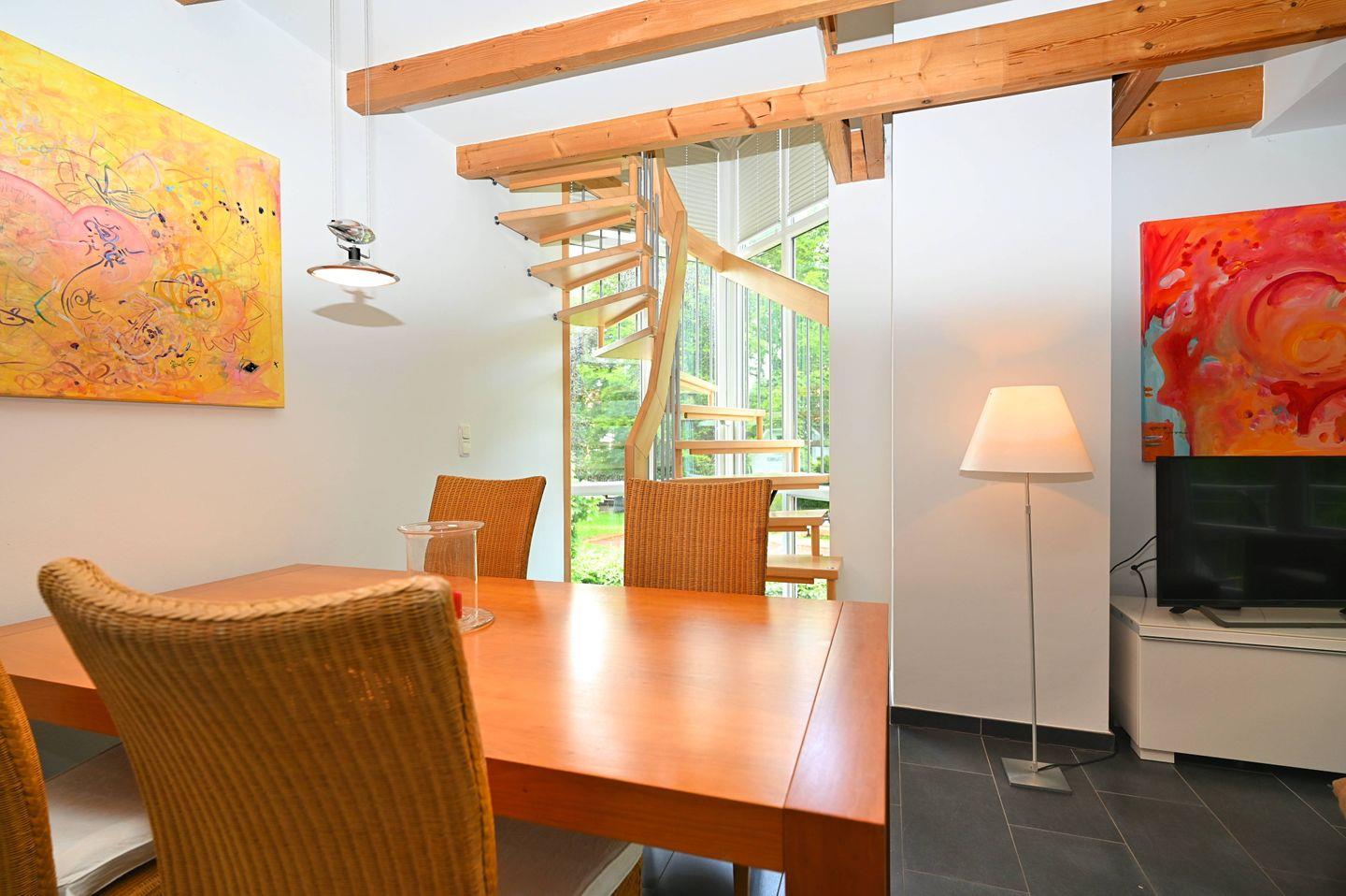 Die gut ausgestattete Küche ist mit einem modernen Ceranherd, einem Backofen, einem Kühlschrank und einer Spülmaschine versehen, sodass Sie auch während Ihres Urlaubs keine kulinarischen Wünsche offenlassen müssen. Dazu kommen praktische Küchenutensilien, eine Kaffeemaschine und ein Wasserkocher, die Ihren Aufenthalt erleichtern. Der angrenzende Essbereich mit einem Esstisch bietet genügend Platz für gesellige Mahlzeiten und zum gemeinsamen Spielen.