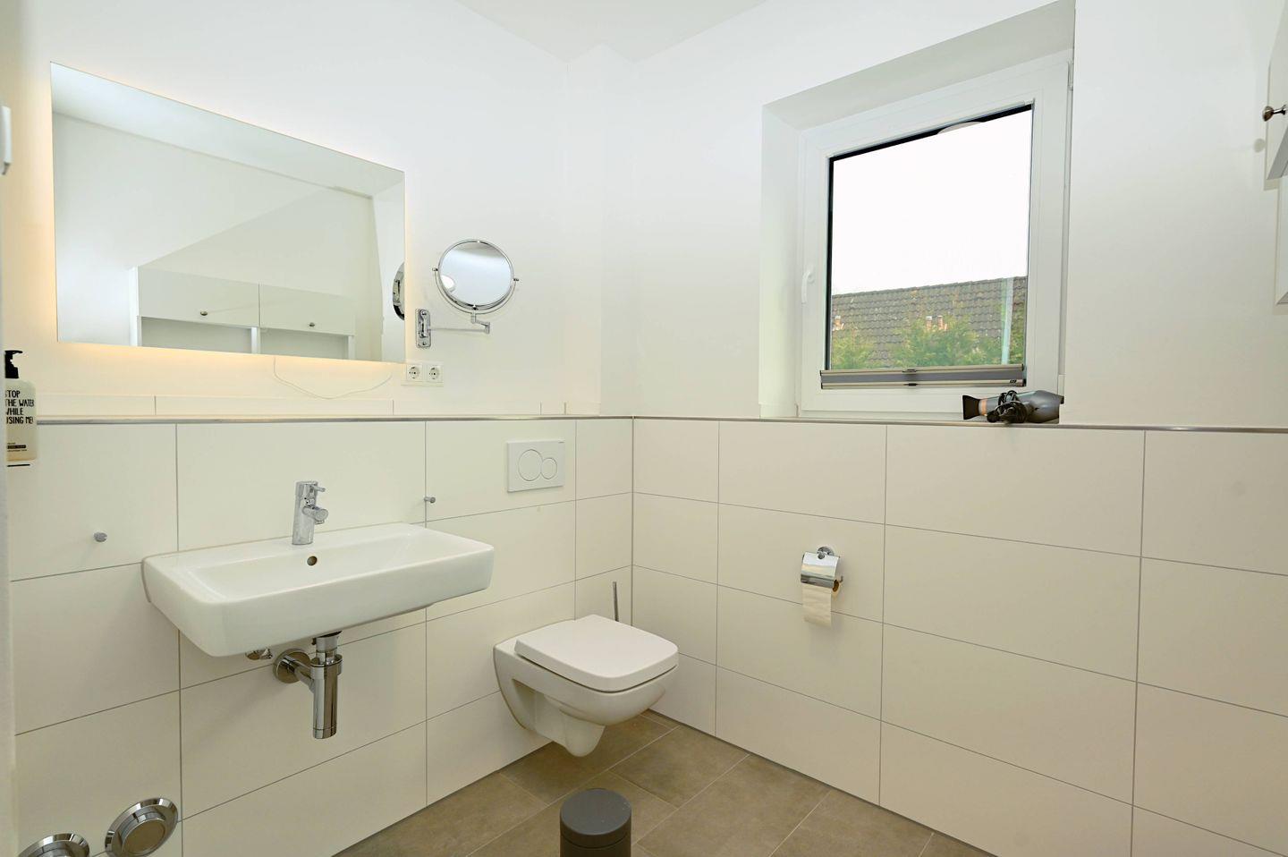 Im Badezimmer erwartet Sie eine bodengleiche Dusche, WC und Waschbecken. Ein Fenster sorgt für natürliche Belüftung. Zusätzlich stehen Spiegel und Kosmetikspiegel sowie ein Haartrockner zur Verfügung.
