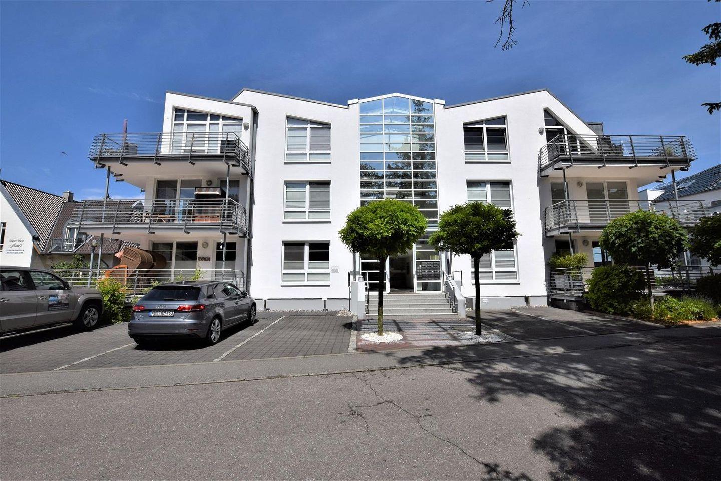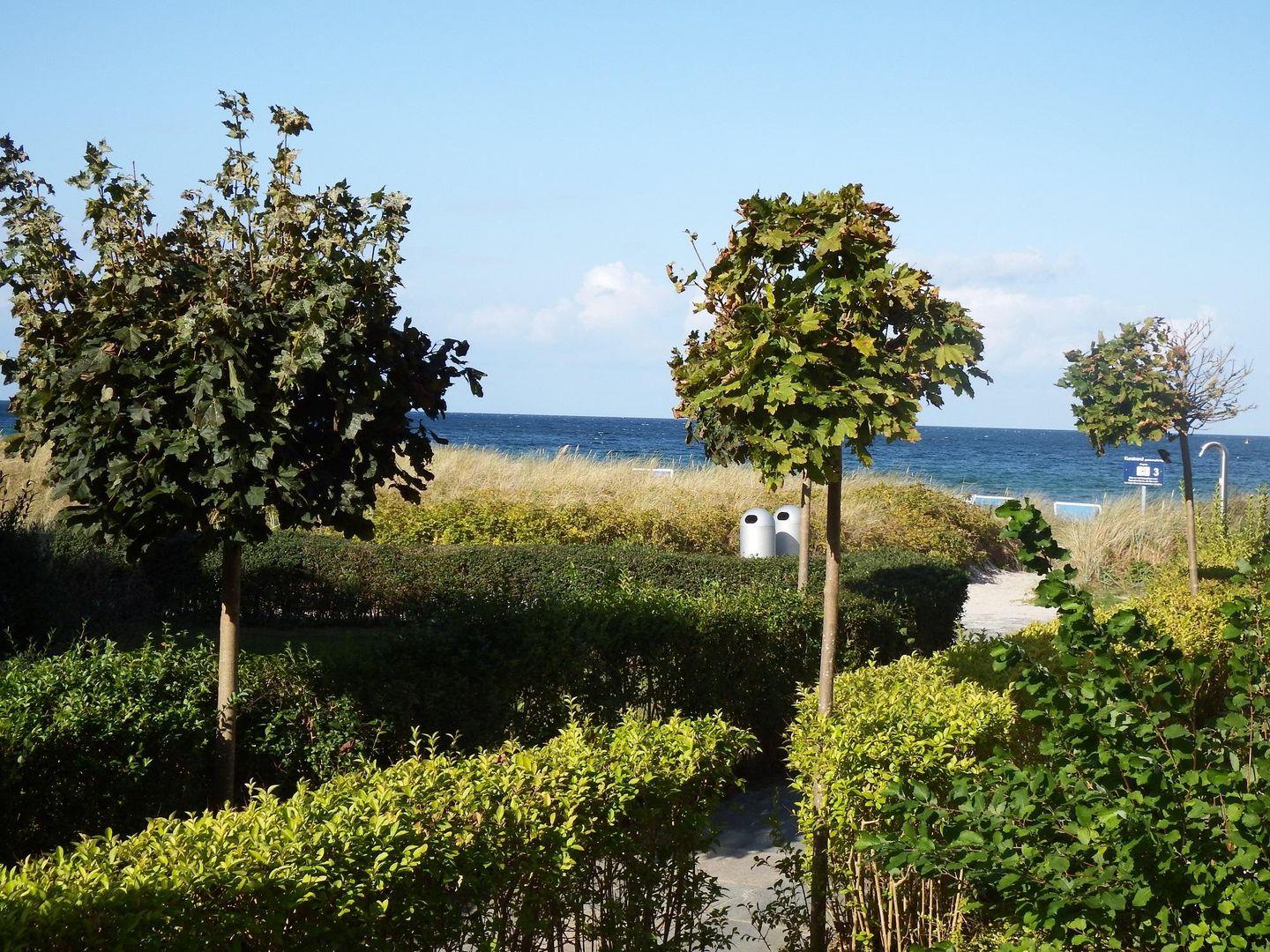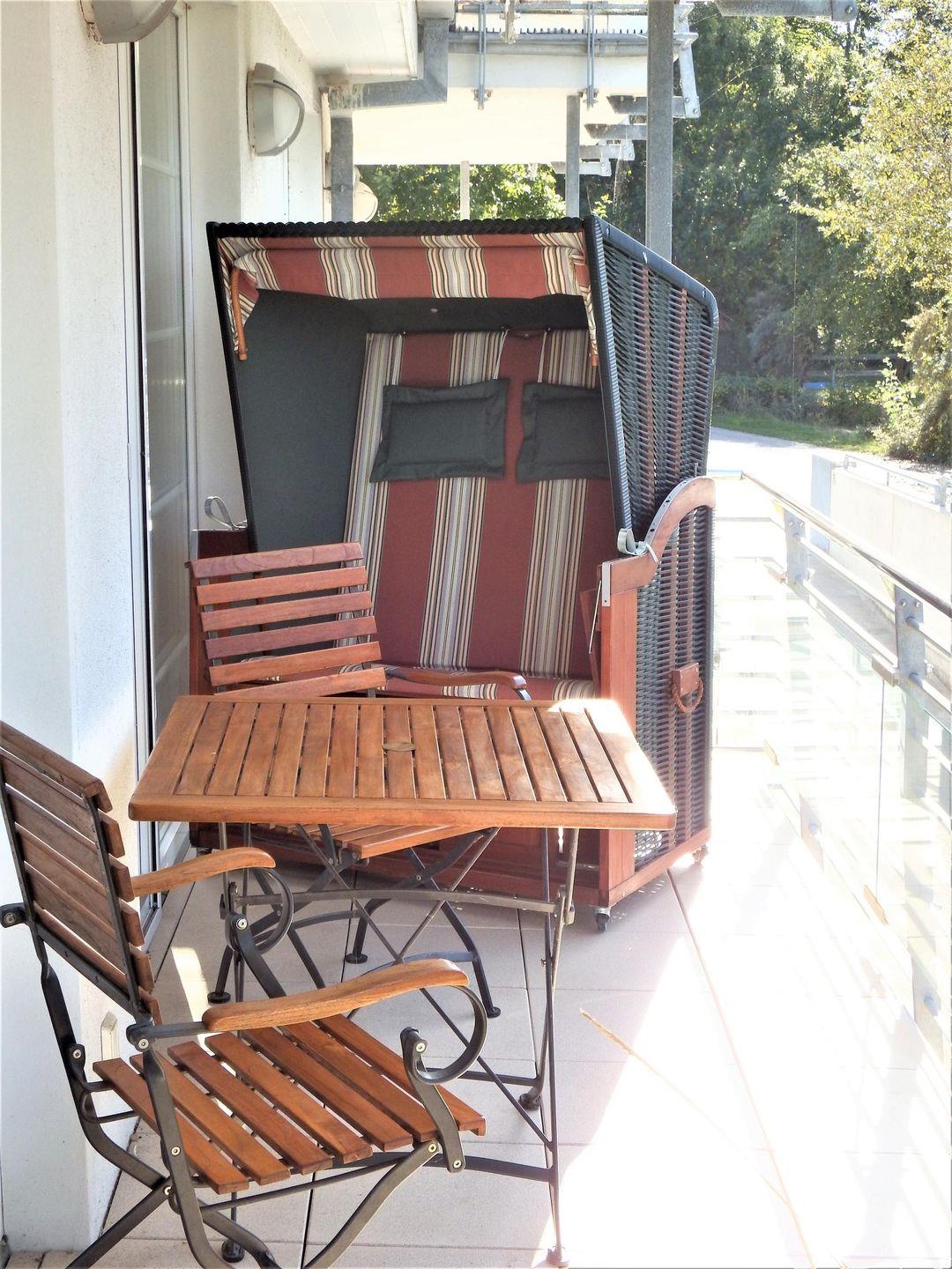 Der große Balkon mit eingeschränktem Meerblick ist ein weiteres Highlight dieser Wohnung. Genießen Sie Ihr Frühstück mit Blick auf die Wellen oder entspannen Sie sich nach einem ereignisreichen Tag an der frischen Luft. Besondere Details wie ein Strandkorb am Strand sowie Gartenmöbel auf dem Balkon laden zum Verweilen ein.
