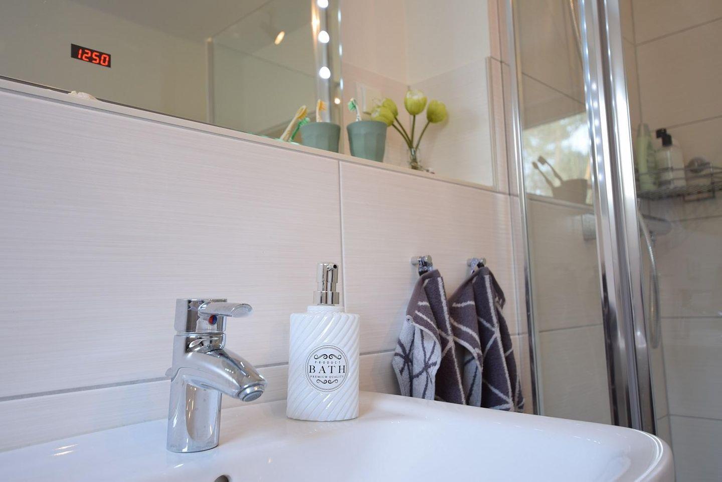 Die Wohnung verfügt über zwei Schlafzimmer, das erste Schlafzimmer ist mit einem komfortablen Doppelbett (1,80 x 2,00 m), einem großen Kleiderschrank und einem TV ausgestattet, während das 2.Schlafzimmer ein über Etagenbett (Strandhaus-Spielbett) verfügt. Eine Schlafcouch im Kinderzimmer und im Wohnbereich erweitert die Möglichkeit der Schlafplätze.