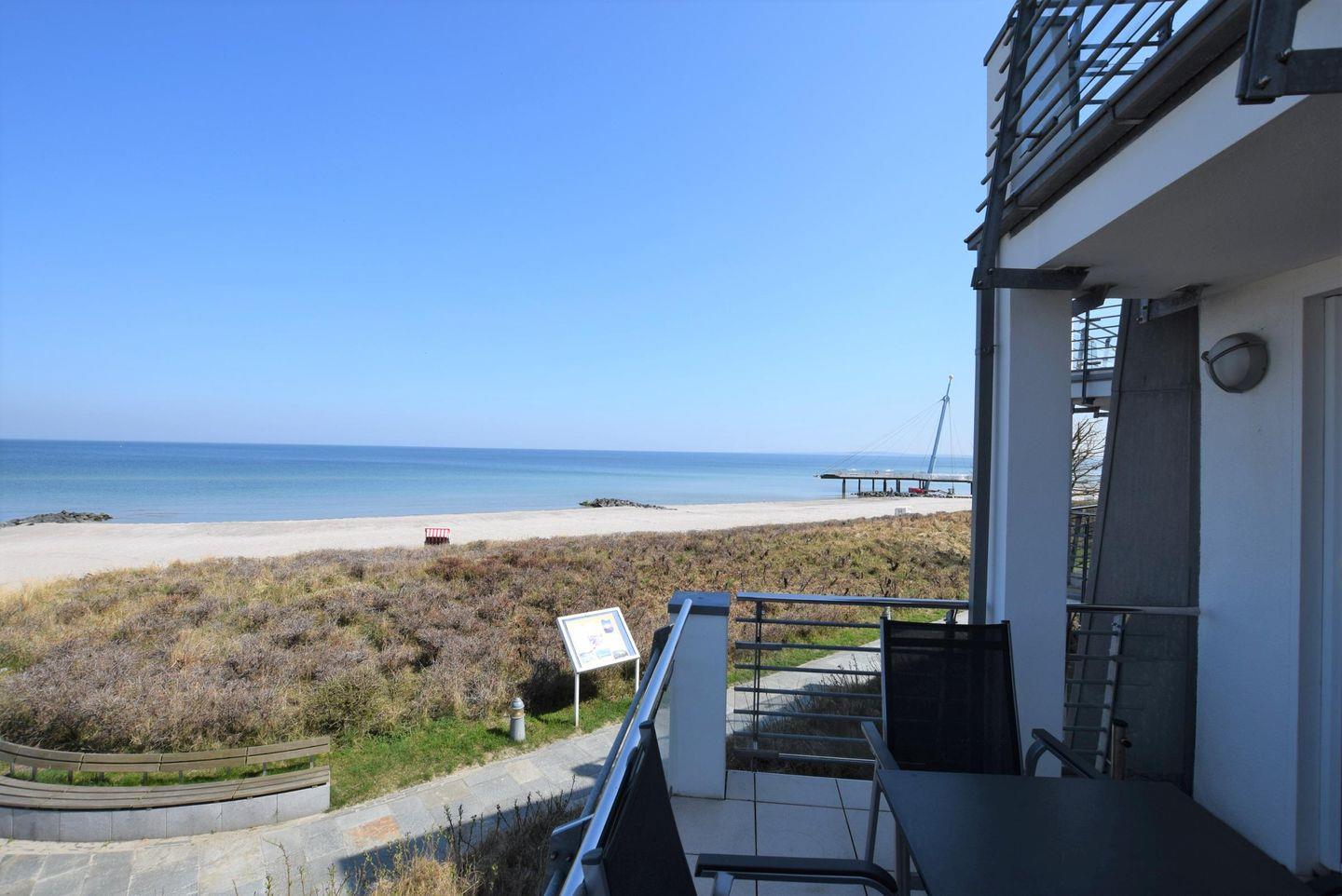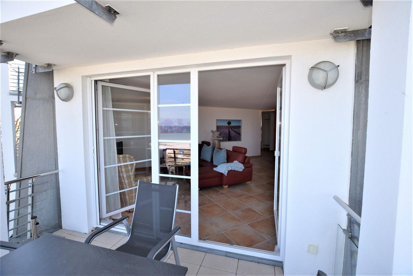 Direkt ans Wohnzimmer grenzt der große Balkon mit Meerblick welcher zum Verweilen einlädt.
