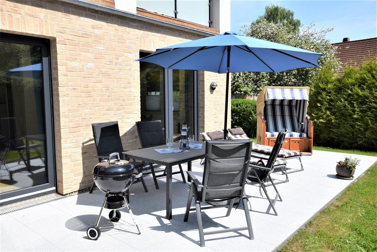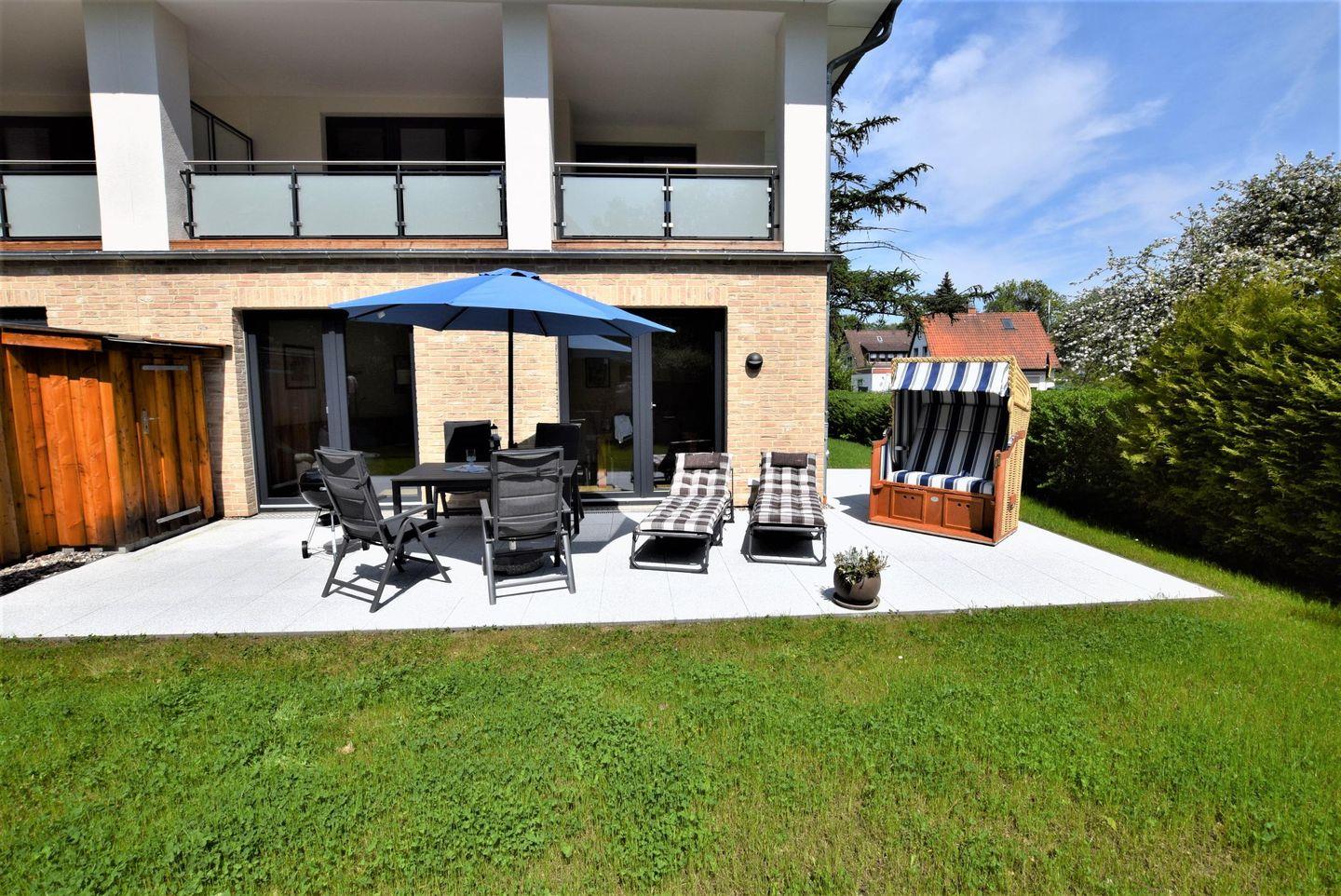 30 qm Südterrasse mit Gartenmöbeln,Strandkorb und Grill