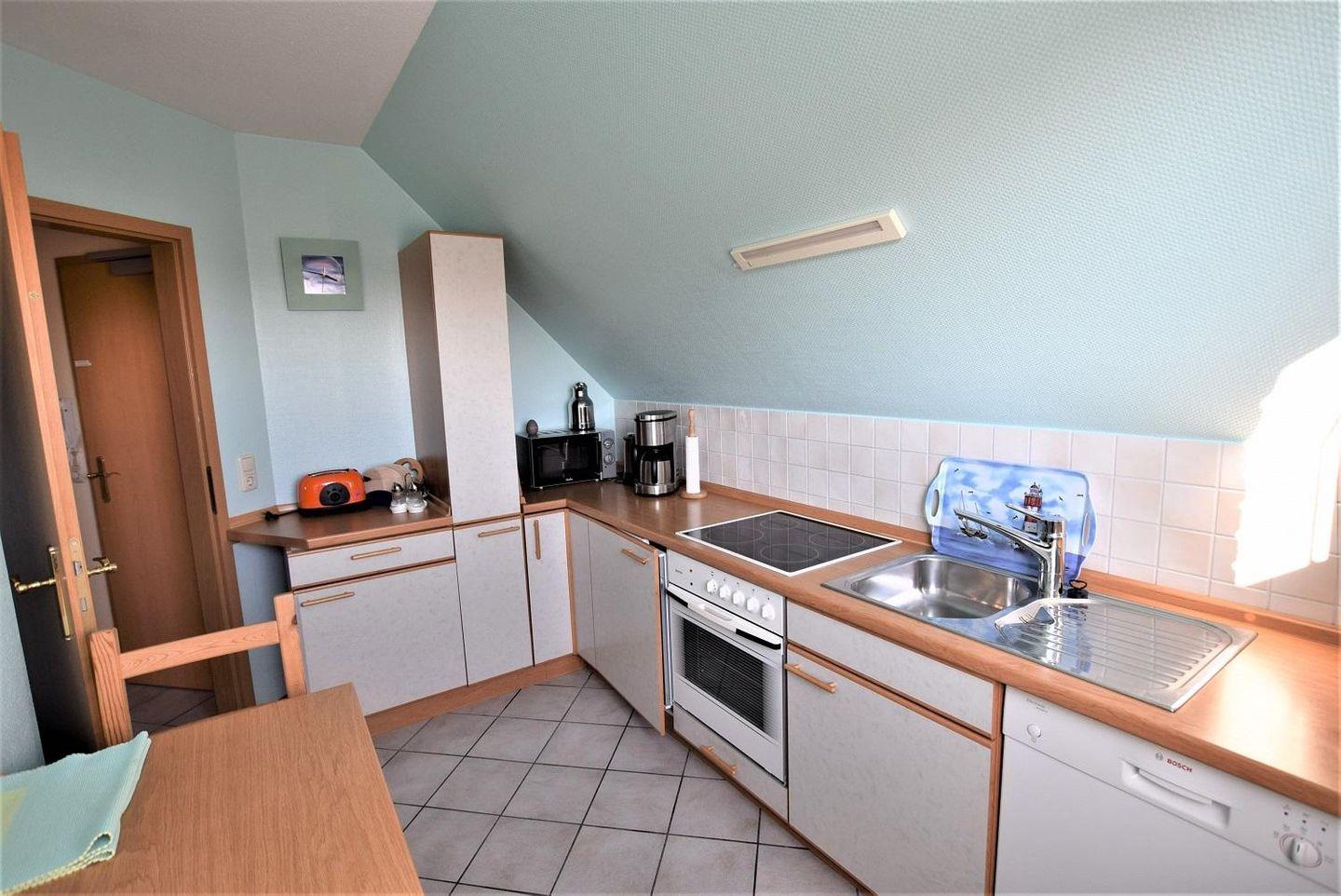 In der voll ausgestatteten Küche bleibt kein Wunsch offen: Cerankochfeld, Backofen, Mikrowelle, Geschirrspüler, Kühlschrank und Gefrierfach stehen für Sie bereit. Hier können Sie mühelos Ihre Lieblingsgerichte zubereiten. Der einladende Esstisch ist der perfekte Ort für gemeinsame Mahlzeiten.