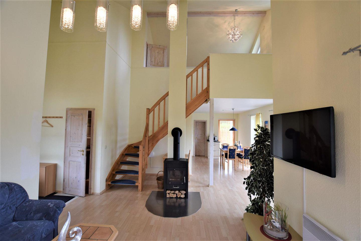 Wohnraum: Couchecke, Kamin, TV, Essbereich