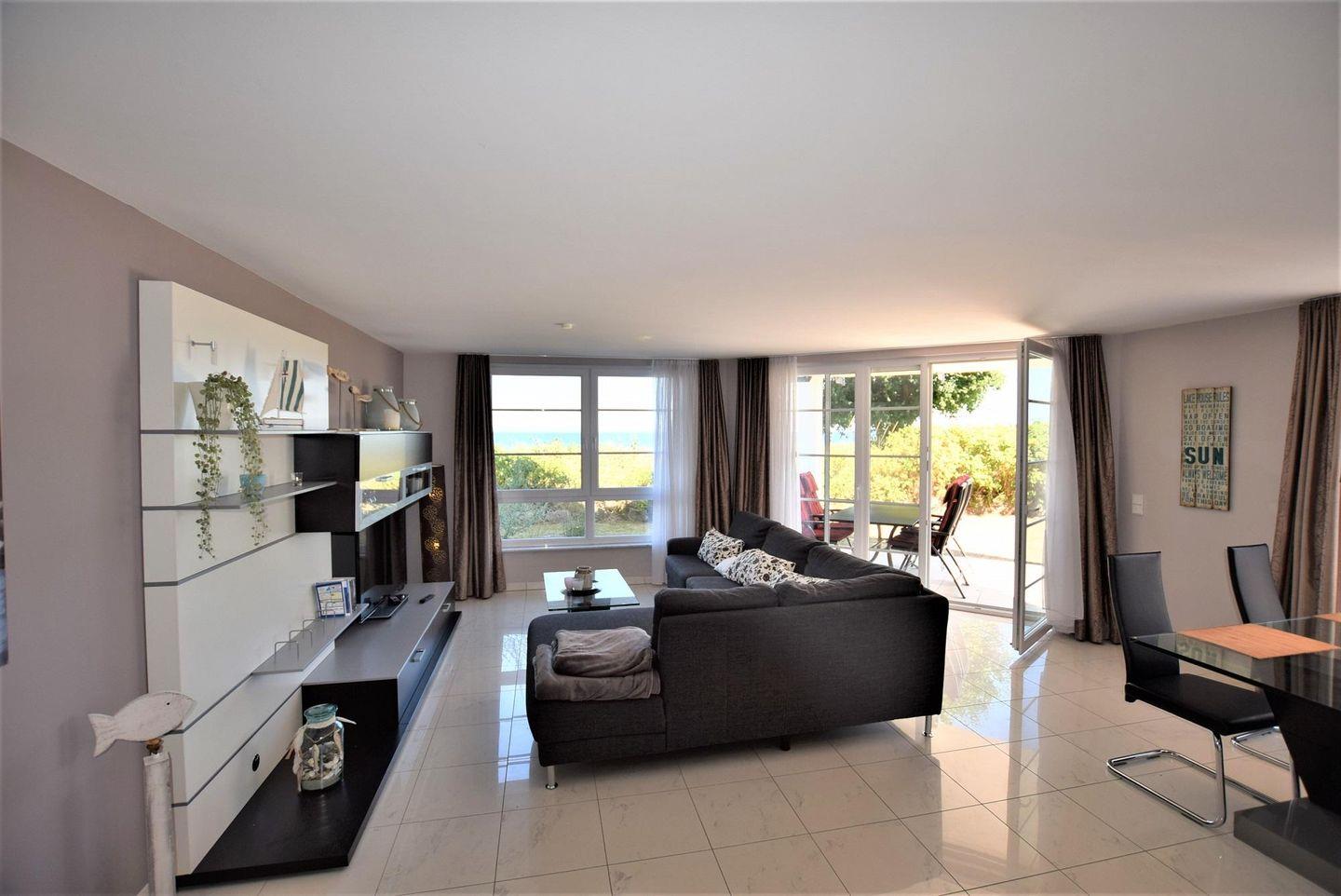 Die Nichtraucher-Unterkunft ist bequem per Aufzug erreichbar (vom Stellplatz in der Tiefgarage) und verbindet großzügiges Wohnen mit einer komfortablen Ausstattung. Im Wohnzimmer erwarten Sie eine Sofaecke mit Sofa und Sesseln, ein Essbereich mit Esstisch sowie eine offene Küche, die direkt an den Wohnraum anschließt. Die Fußbodenheizung sorft zu jeder Jahreszeit für ein angenehmes Raumklima. Sichtschutz an allen Fenstern und Fliegengitter tragen zusätzlich zum Wohnkomfort bei.