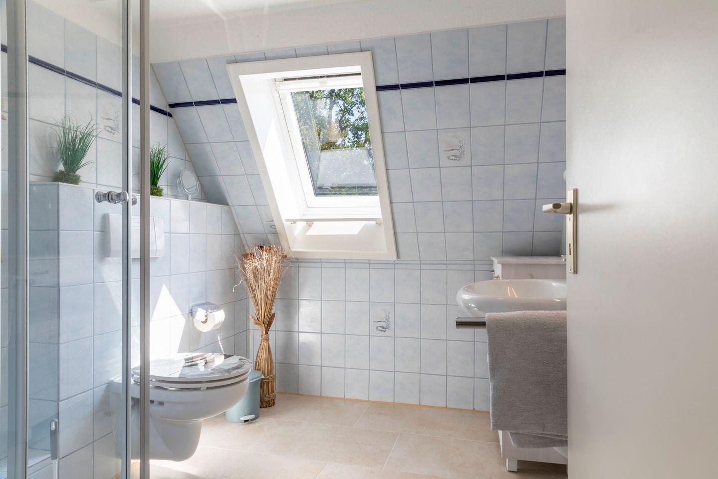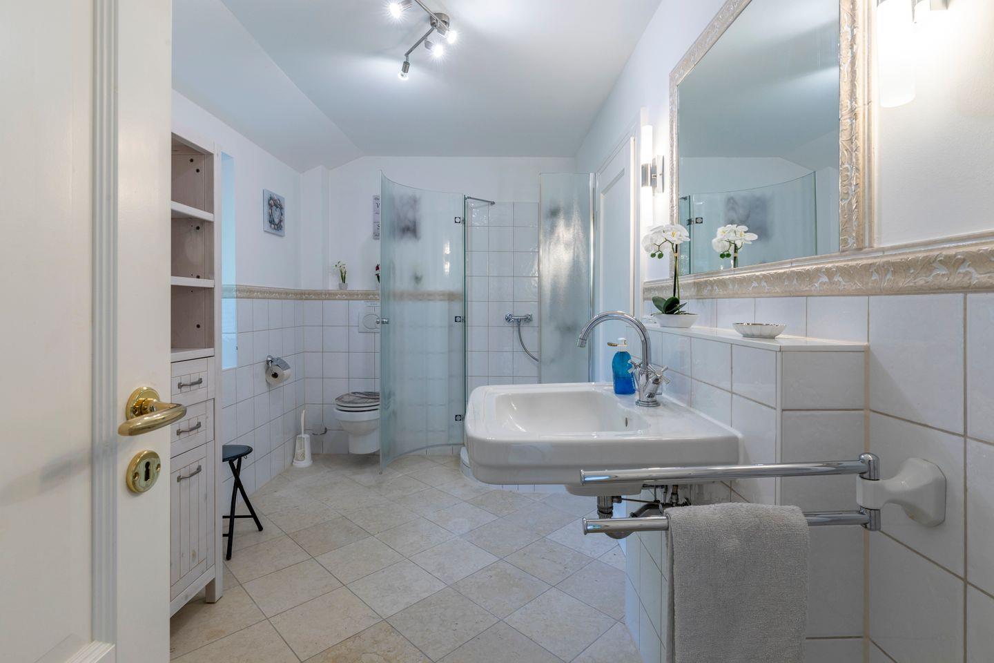 Neben den genannten Räumlichkeiten befinden sich im Erdgeschoss 2 Schlafzimmer. Eines der Schlafzimmer ist mit einem großen Doppelbett ausgestattet (200x200 cm). Das zweite Schlafzimmer verfügt über ein Einzelbett (90x200 cm). Zudem befindet sich unmittelbar angrenzend an die beiden Schlafzimmer ein großes Badezimmer mit Dusche, Badewanne, WC und Waschbecken. Zusätzlichen Komfort bietet das Gäste-WC im Erdgeschoss des Hauses.