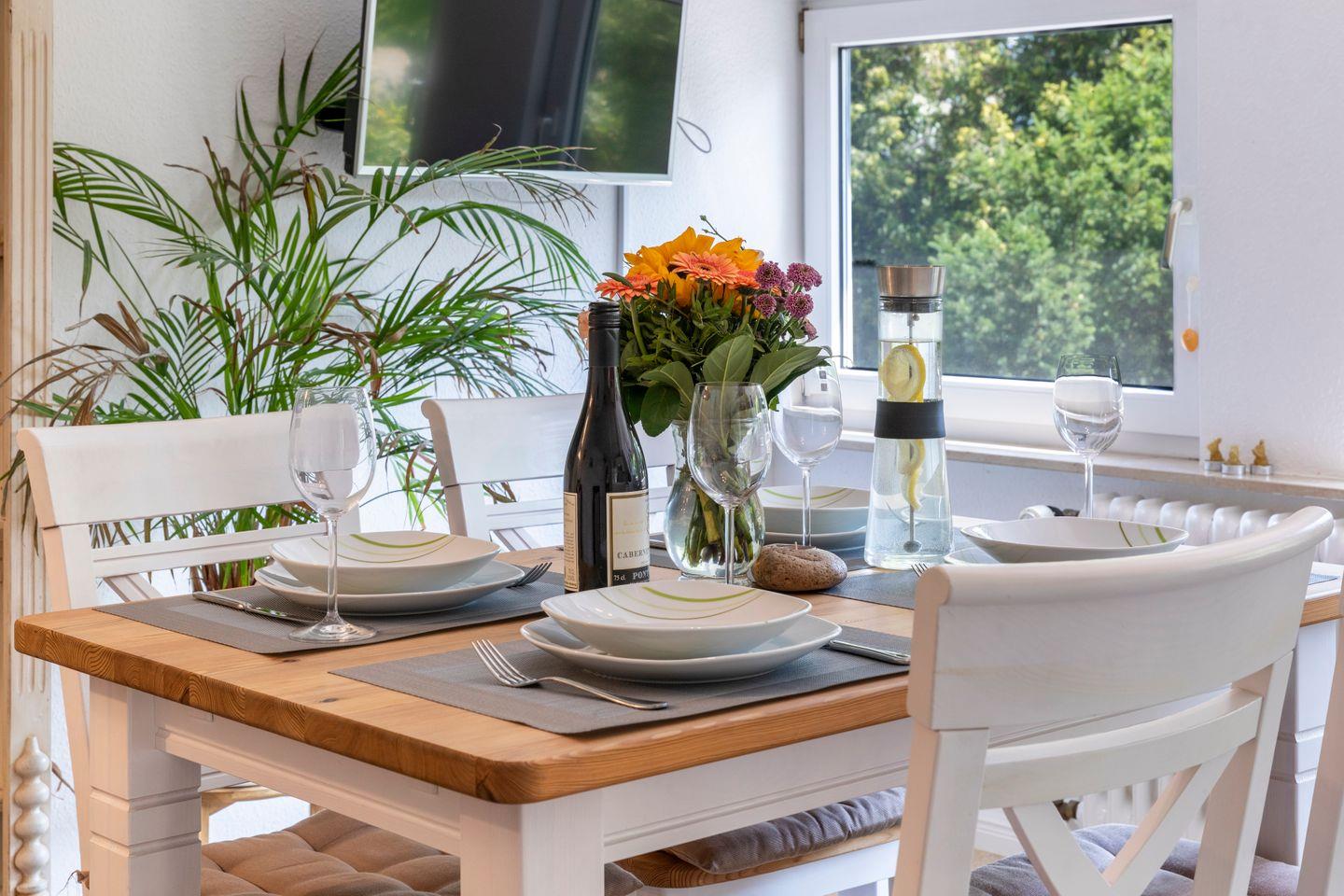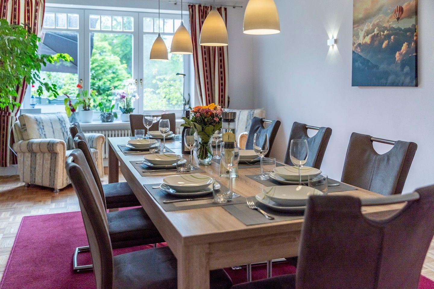 Im Erdgeschoss des Hauses begrüßt Sie der große Wohn- und Essbereich, welcher mit einer, großen Couch, einem großen TV, ausreichend Sitzgelegenheiten, einem Kaminofen sowie einem Esstisch für bis zu 10 Personen ausgestattet ist. Durch die großen Fenster zum Garten der Villa wirken die Räumlichkeiten noch größer und freier.