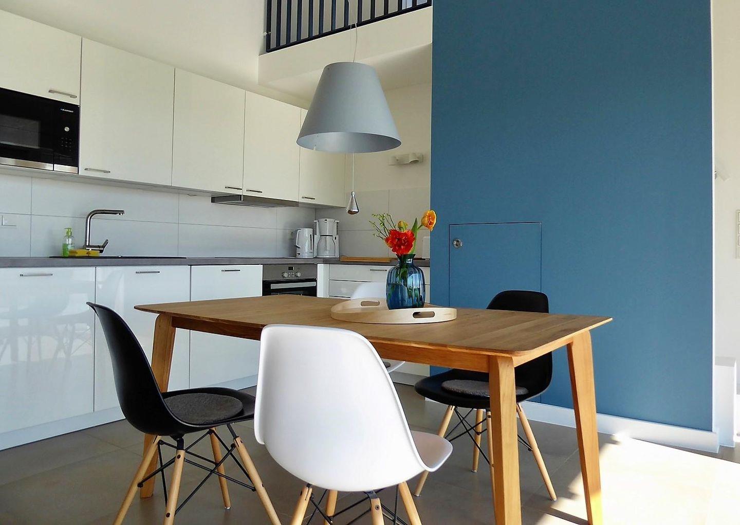 Der großzügige Wohnbereich ist mit einem Couchbereich, TV und Kaminofen ausgestattet. Die offene Küche verfügt über eine Spülmaschine, Backofen mit Induktionsherd, Mikrowelle uvm sowie einem angrenzenden Essbereich.