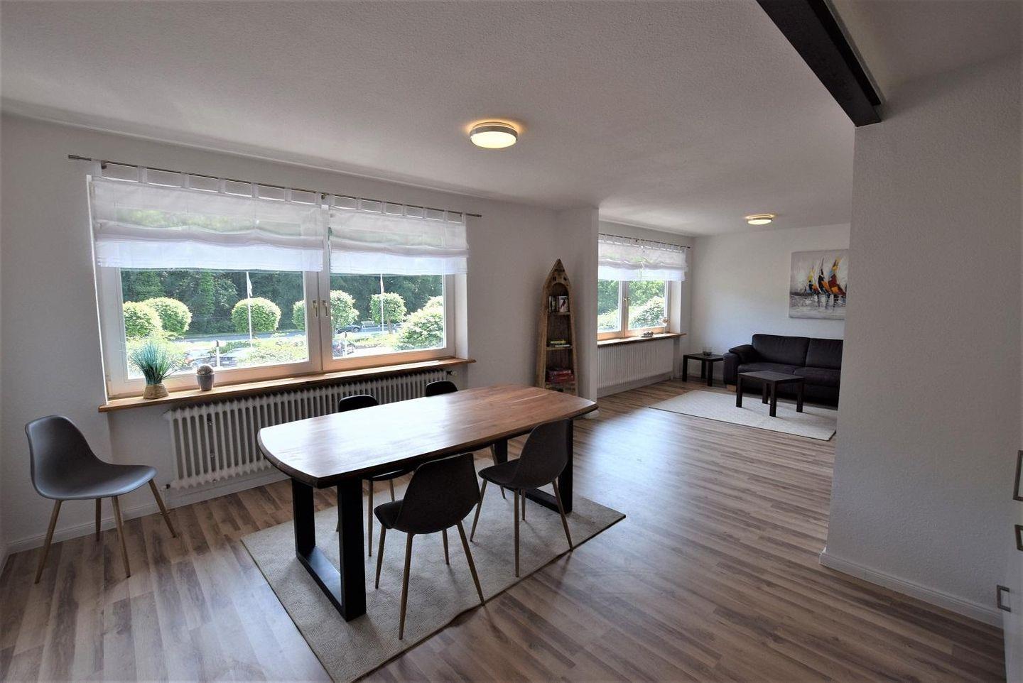 Der Blick vom Wohn-Esszimmer mit offener Küche ermöglicht nicht nur eine Übersicht über den Berliner Platz sondern auch zum nahe gelegenen Wald.