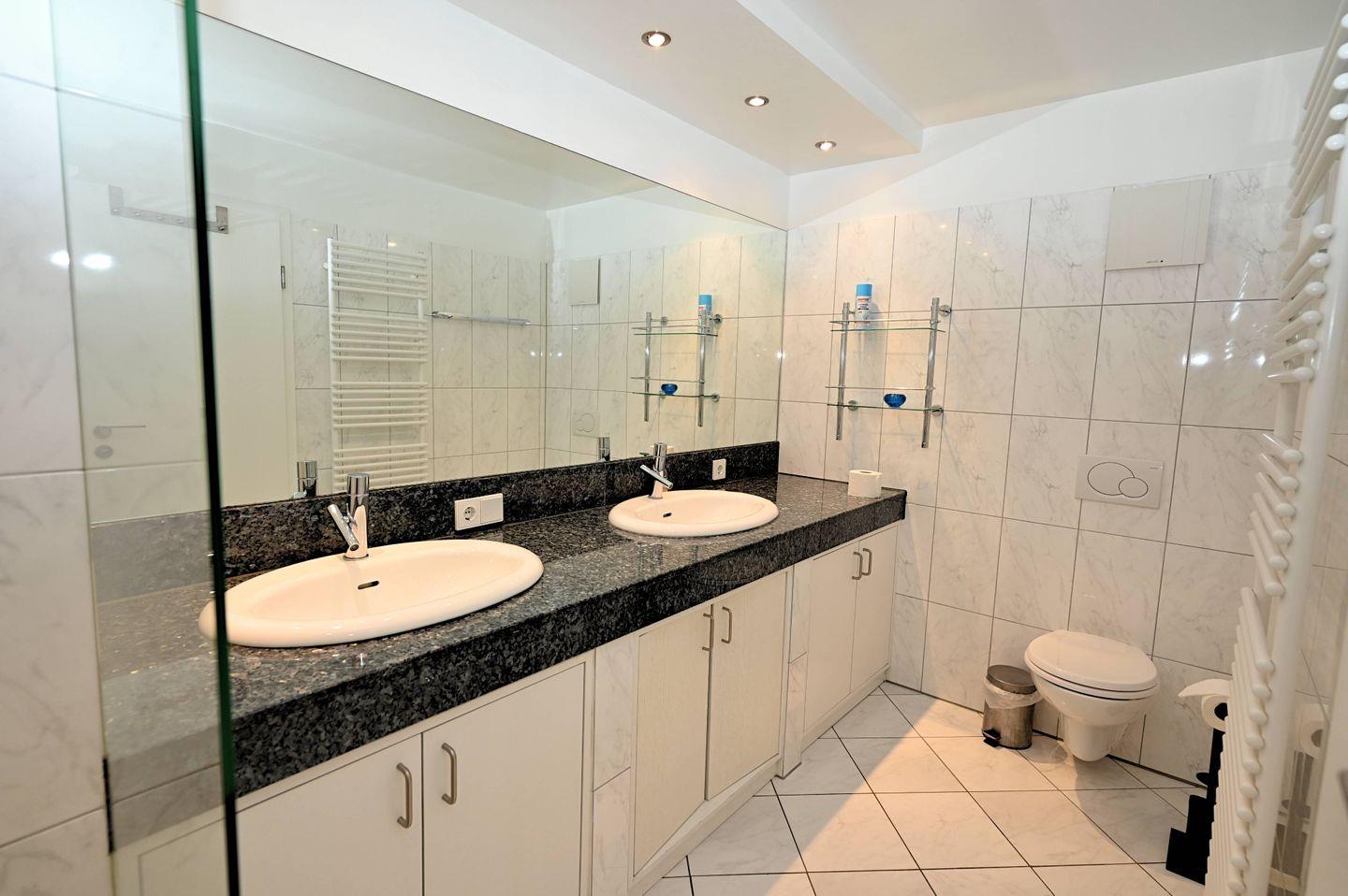 Diese Unterkunft verfügt sowohl über ein Vollbad, als auch über ein Gäste WC. Im Badezimmer sorgt der große Doppelwaschtisch gleichzeitig für reichlich Ablagefläche. Die Beleuchtung mit Deckenspots und der Handtuchhalter sorgen für modernen Komfort. Eine große Dusche ist hier vorhanden. Das Gäste WC ist im gleichen Fliesendesign gehalten und ebenso zeitgemäß ausgestattet.