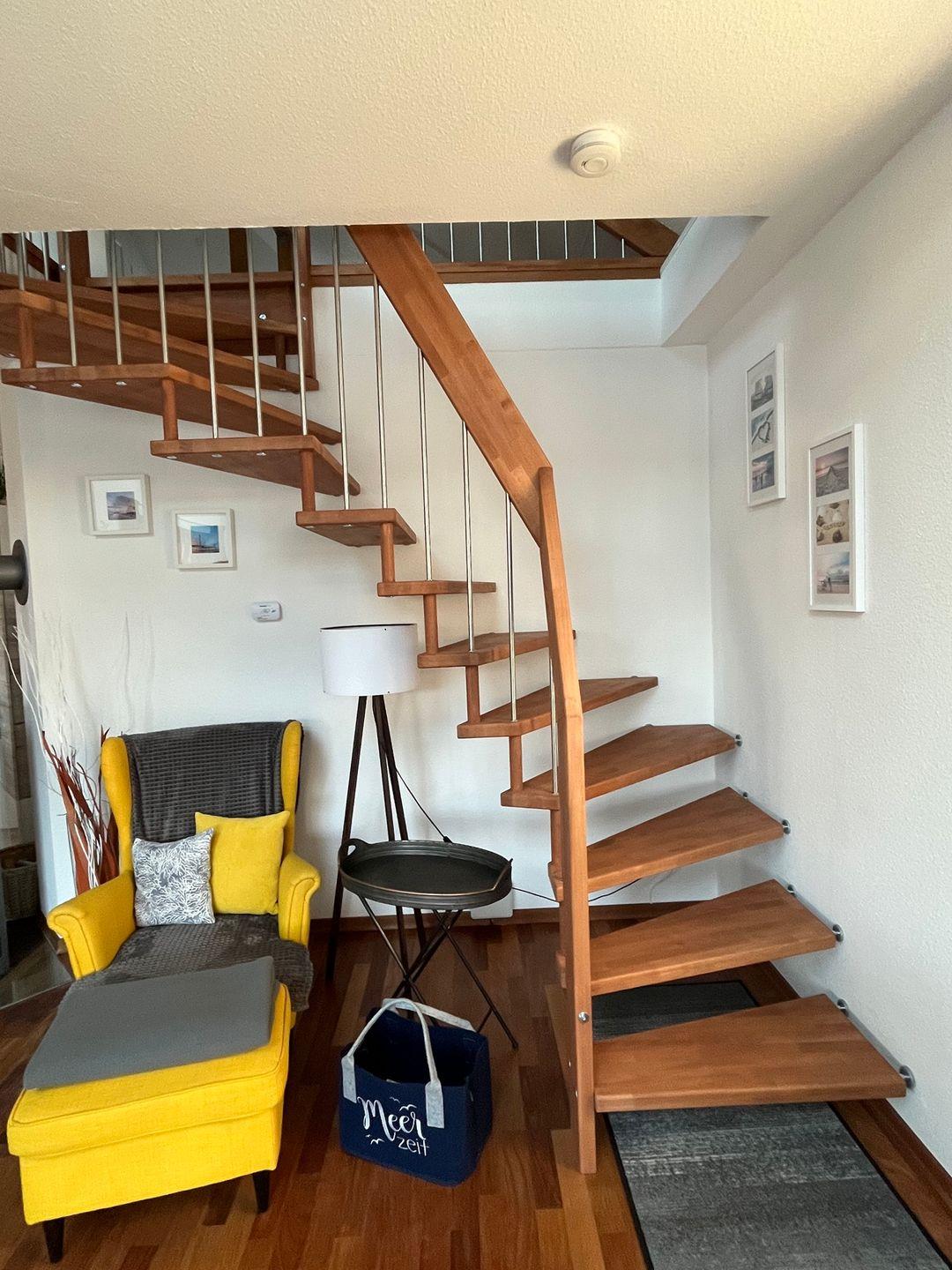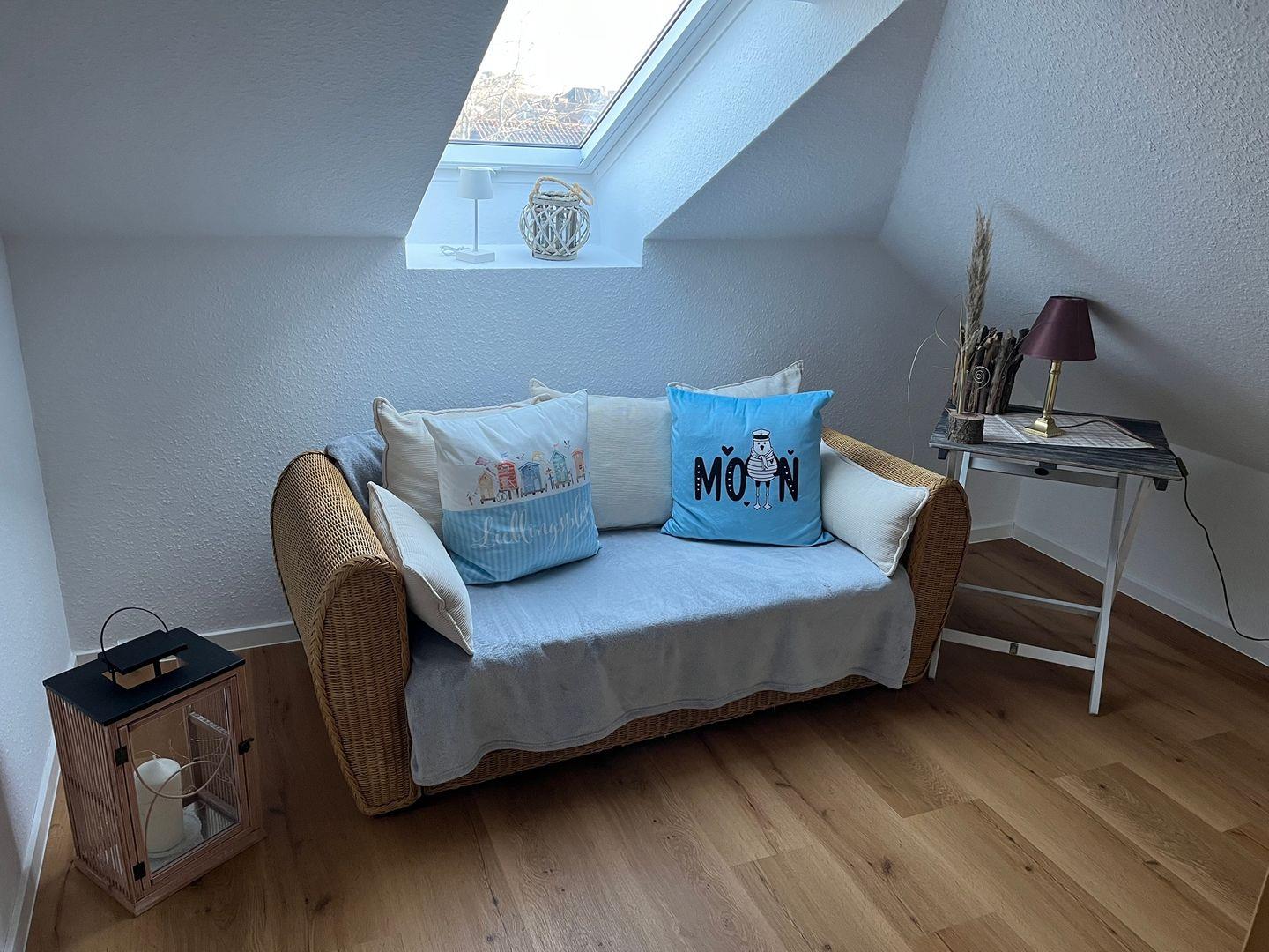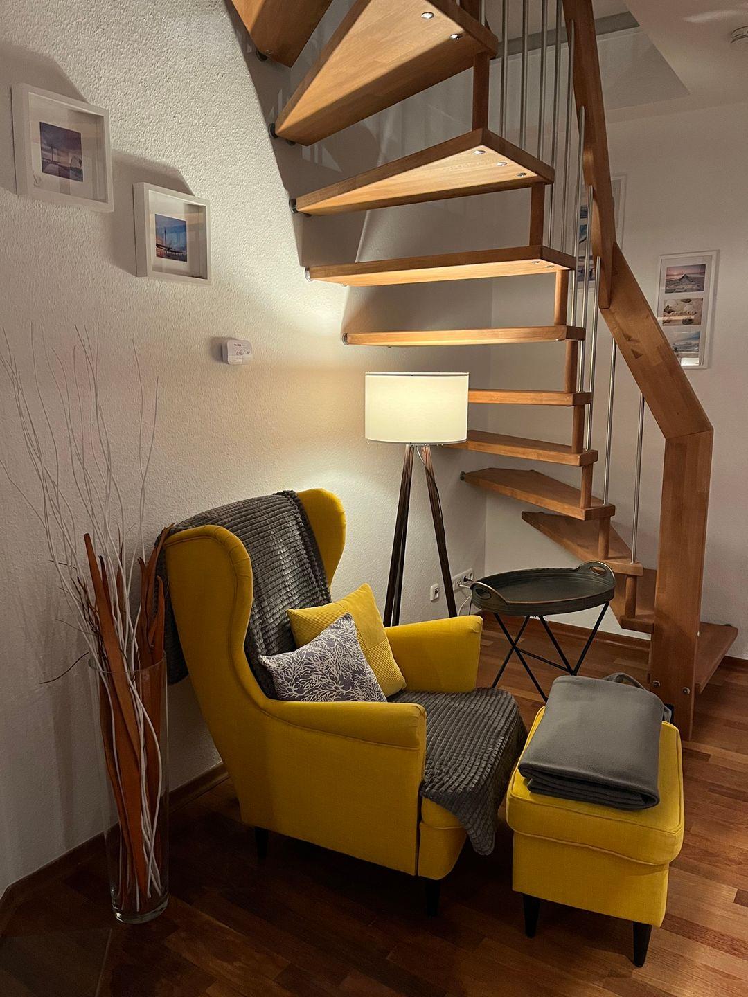 Das Wohnzimmer ist gemütlich und einladend. Große Fenster lassen viel Licht in den Raum fallen. Im Sommer bieten lichtundurchlässige Gardinen Schutz vor der Sonne, bei Dunkelheit und im Winter die Möglichkeit des Sichtschutzes. Auf den ansprechenden Couchmöbeln können alle Gäste zum Entspannen zusammenkommen. Auch ein gemütlicher Sessel mit Hocker lädt zum Verweilen ein. Modernes Design trifft hier ebenso wie im Rest des Hauses auf eine gemütliche und wohnliche Atmosphäre, durch welche sich die Gäste im Urlaub wie zu Hause fühlen können. Der Flachbildfernseher sorgt für moderne Unterhaltungsmöglichkeiten, während ein Kaminofen besonders in der kälteren Jahreszeit behagliche und wohltuende Wärme spendet. Selbstverständlich sorgt WLAN im gesamten Haus für Zugang zum Internet.