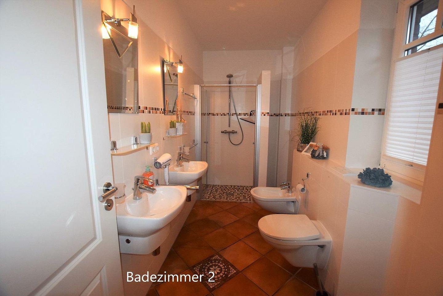 Zwei Bäder mit fußbodengleichen Duschen, Toiletten, Bidets, je zwei Waschbecken und eines mit schöner Badewanne geben mehreren Gästen gleichzeitig die Möglichkeit der Nutzung, was besonders nach einem Standbesuch geschätzt wird. Ansprechende Fliesen, genügend Handtuchhalter und Abstellflächen runden die Badezimmer ab. Selbstverständlich gehören jeweils ein Fön mit Zubehör und ein Schminkspiegel zur Ausstattung der Bäder.