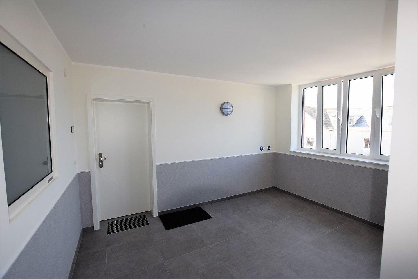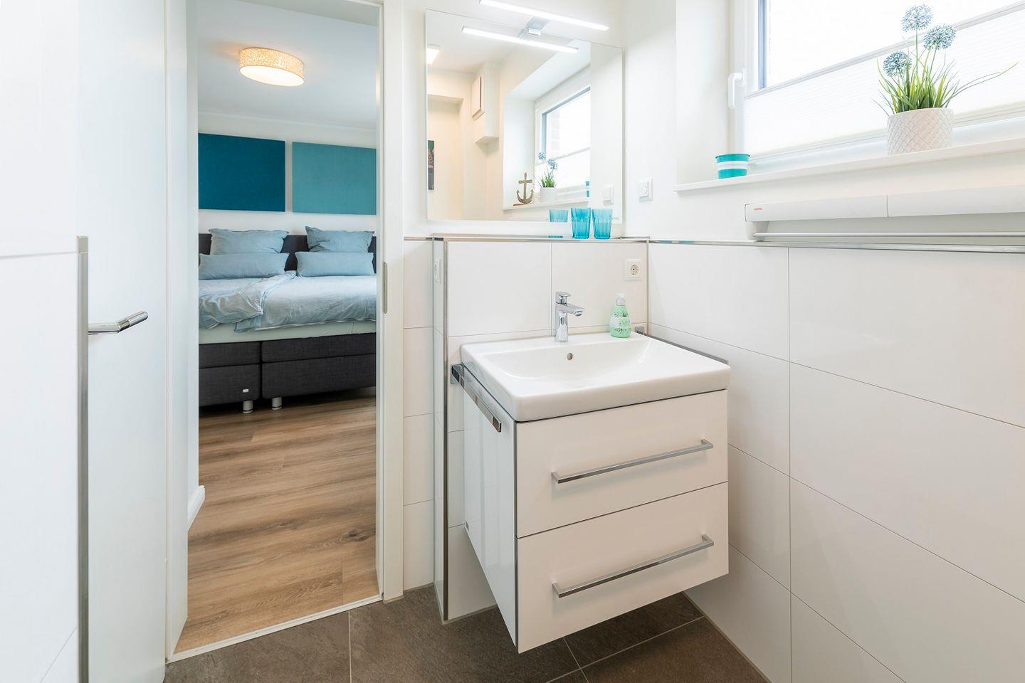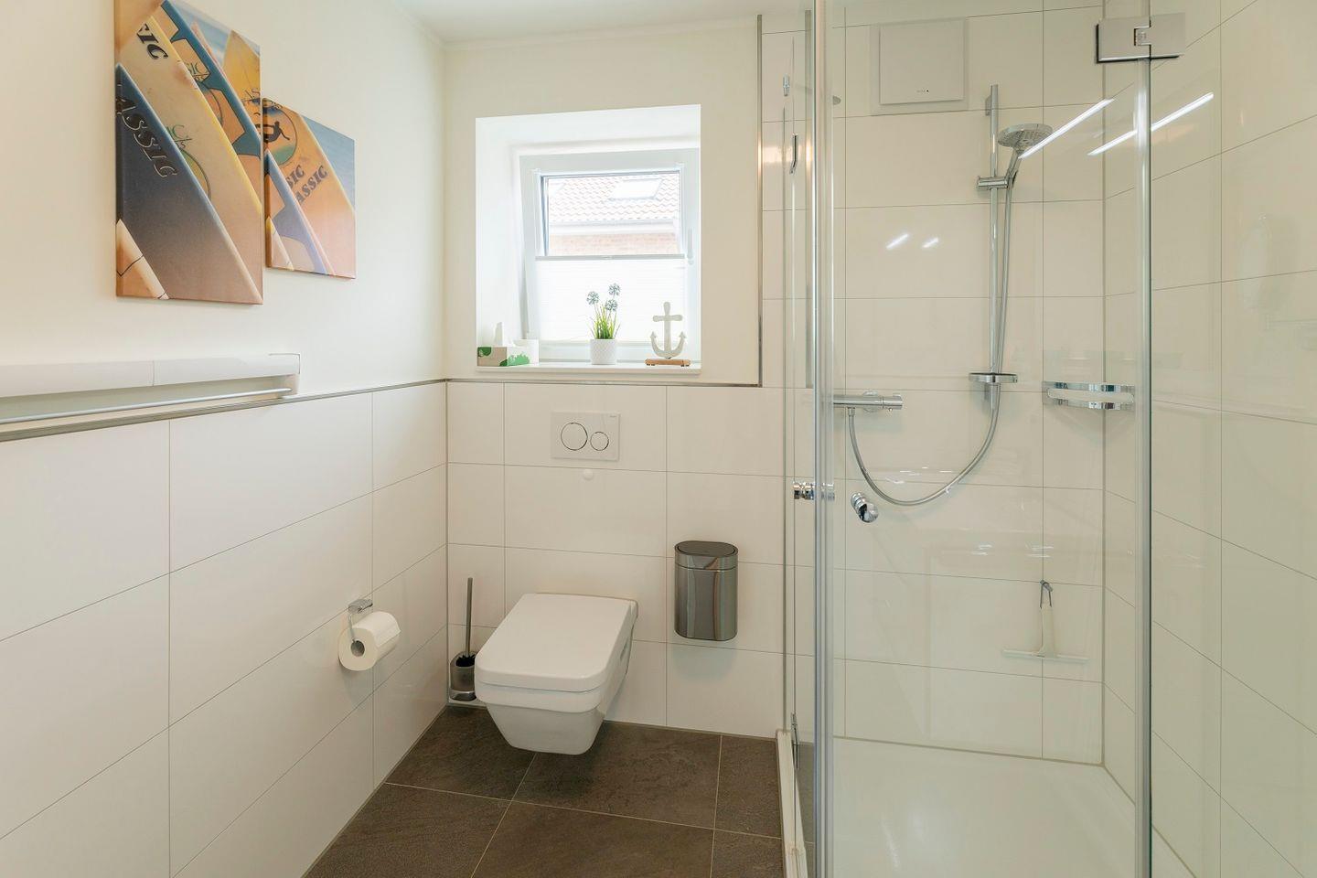 Die Duschen sind bodentief und lassen sich mit einer Glastür verschließen. Helle Fliesen sorgen für einen modernen Gesamteindruck. Deckenspots, ein Waschtisch mit großem Spiegel und ein Fön sind hier ebenso vorhanden wie ein Handtuchwärmer.