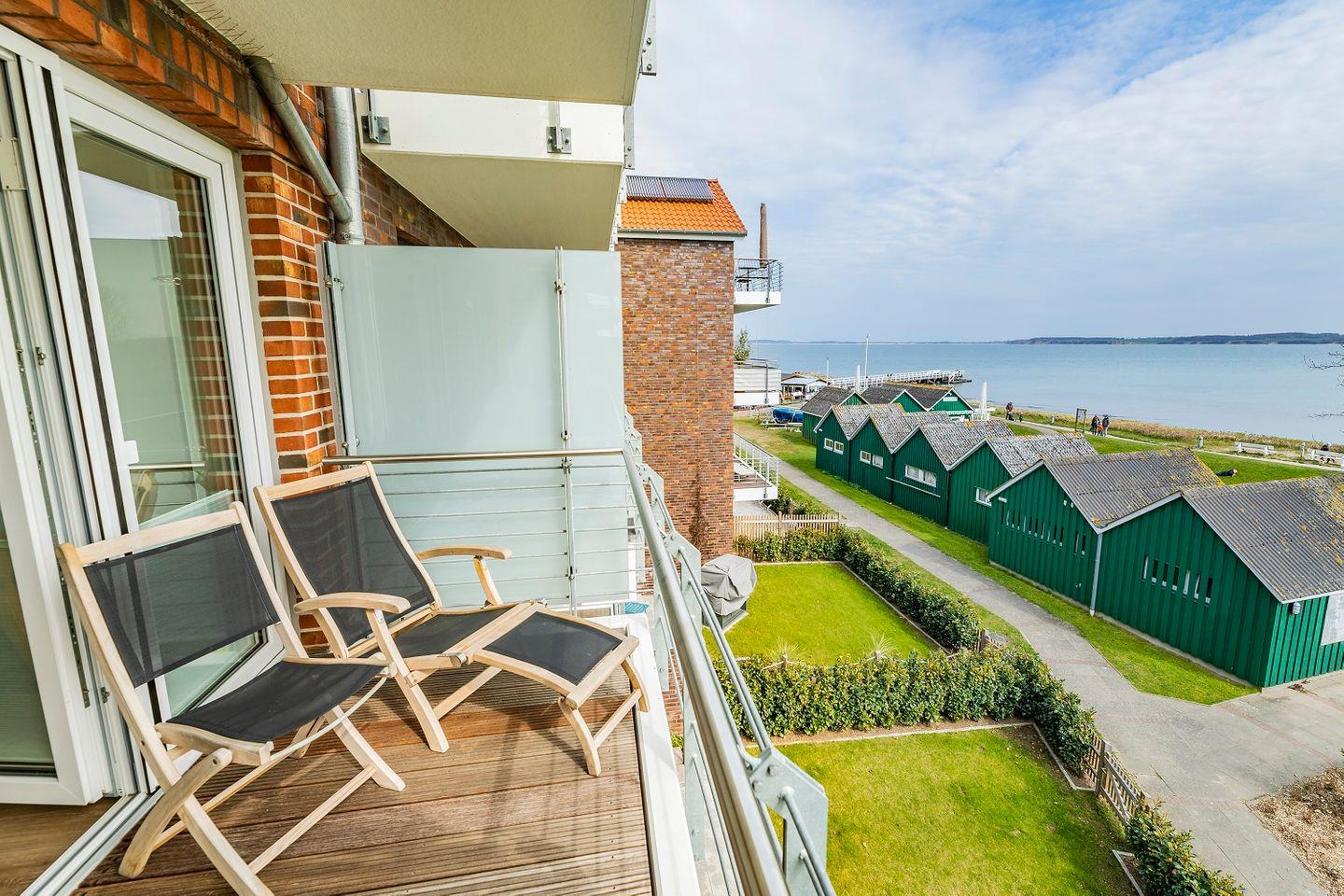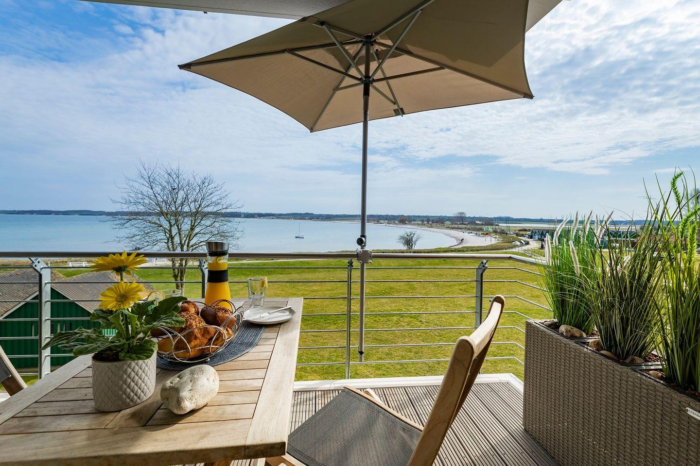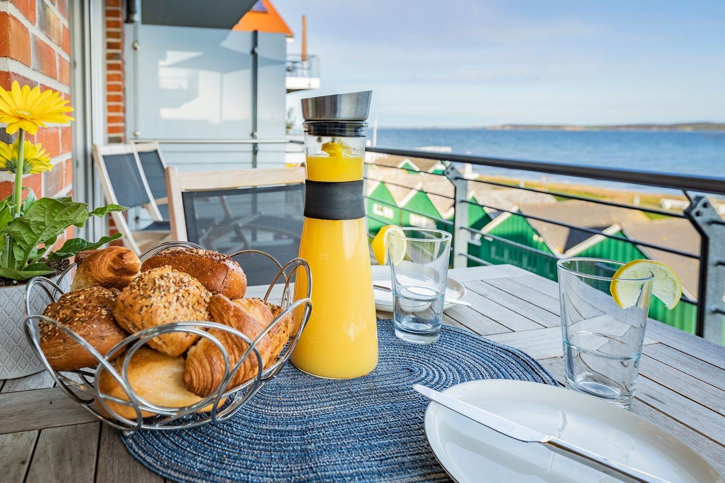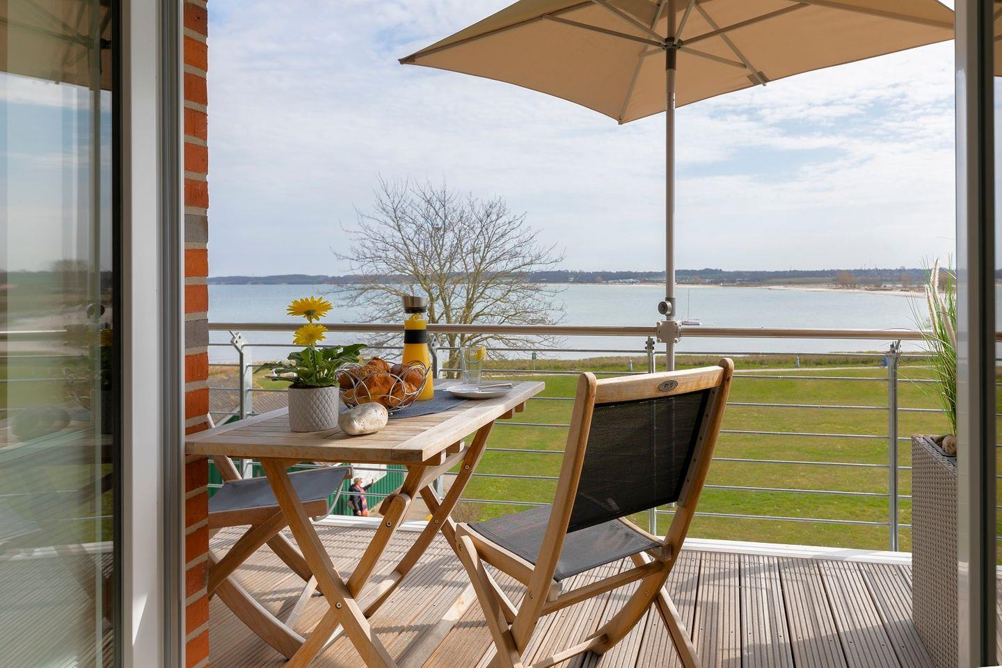 Direkt vom Wohnraum aus kann der schöne Balkon der Wohnung betreten werden. Hier kann nicht nur die Aussicht auf die mal ruhige, mal schäumende See genossen werden, sondern auch ein fantastischer Panoramablick . Durch seine Lage bietet der Außenbereich pünktlich zum Frühstück Sonne, die sich den ganzen Tag über hält.