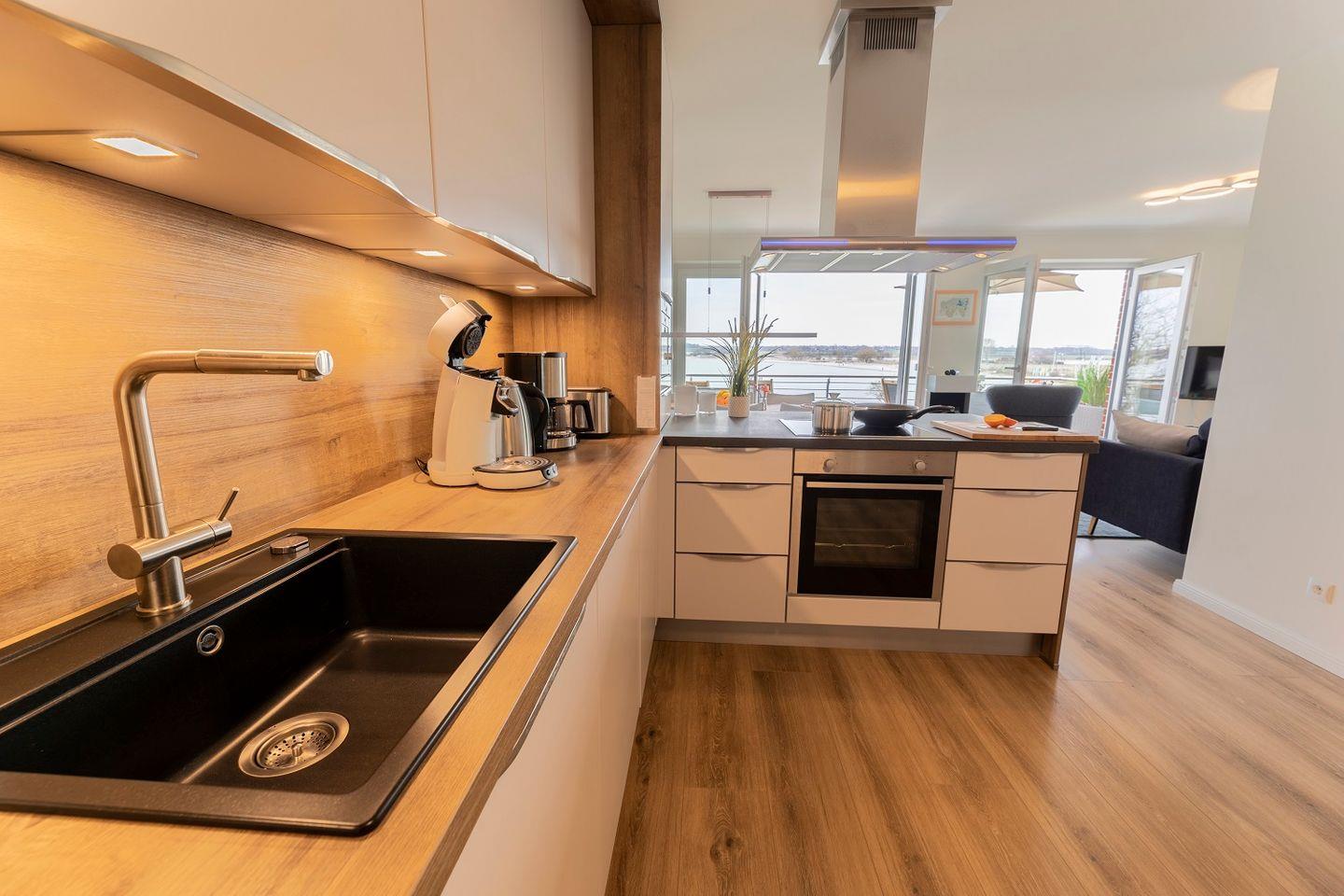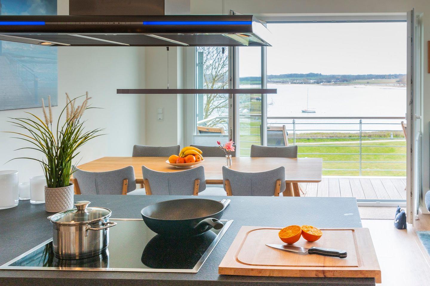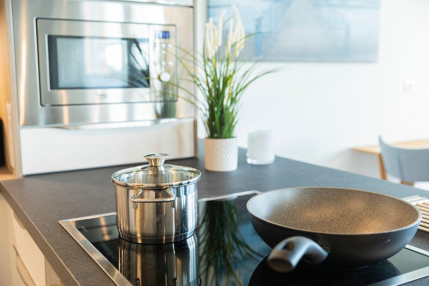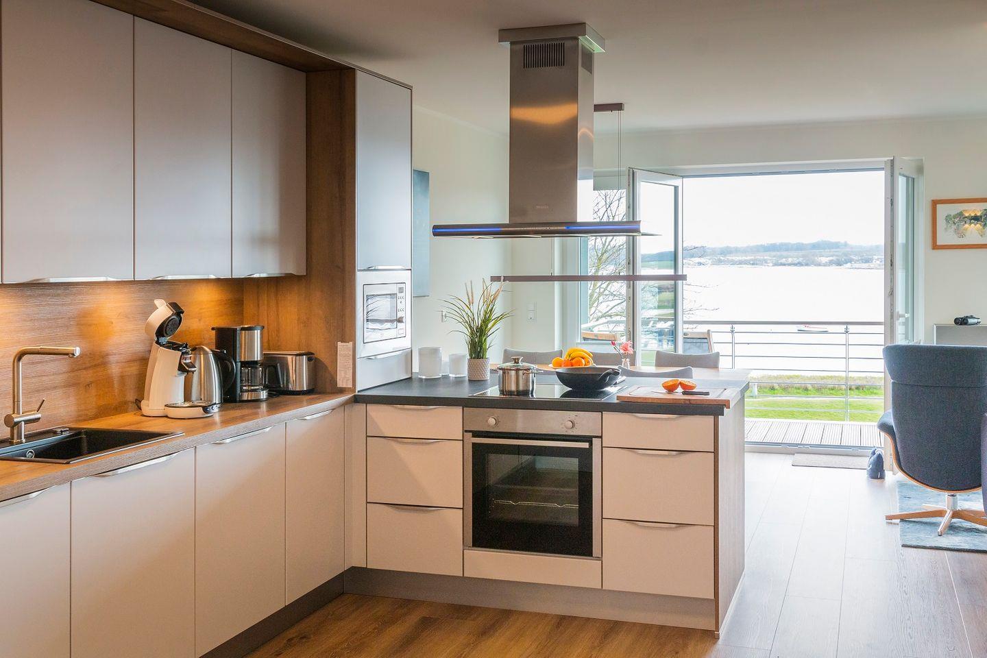 Die Küche ist umfassend ausgestattet und bietet ausreichend Arbeitsfläche, um im Urlaub auch mal anspruchsvoller zu kochen.