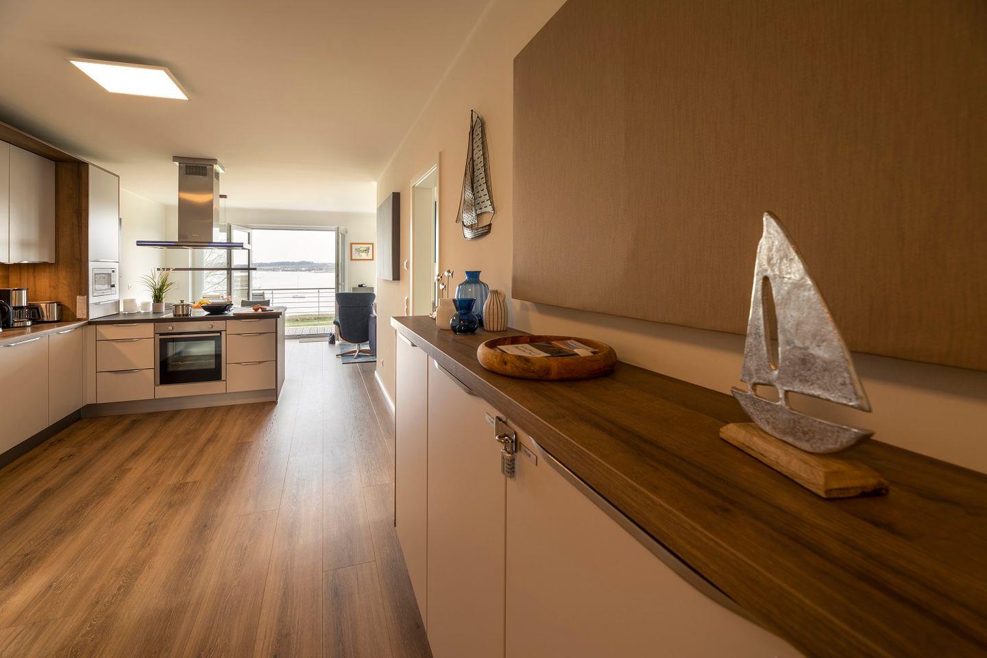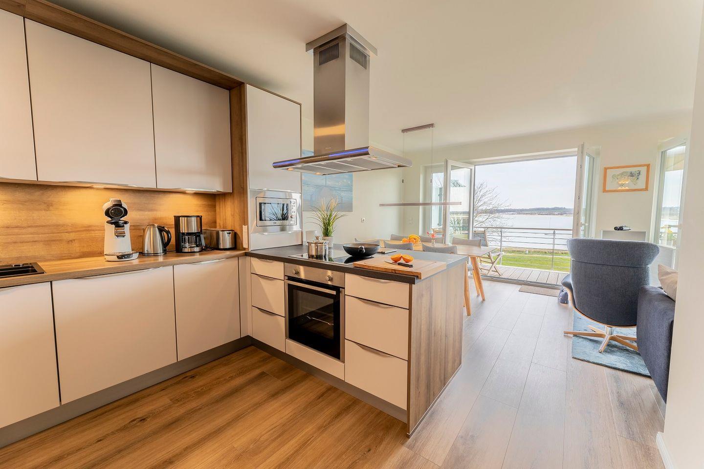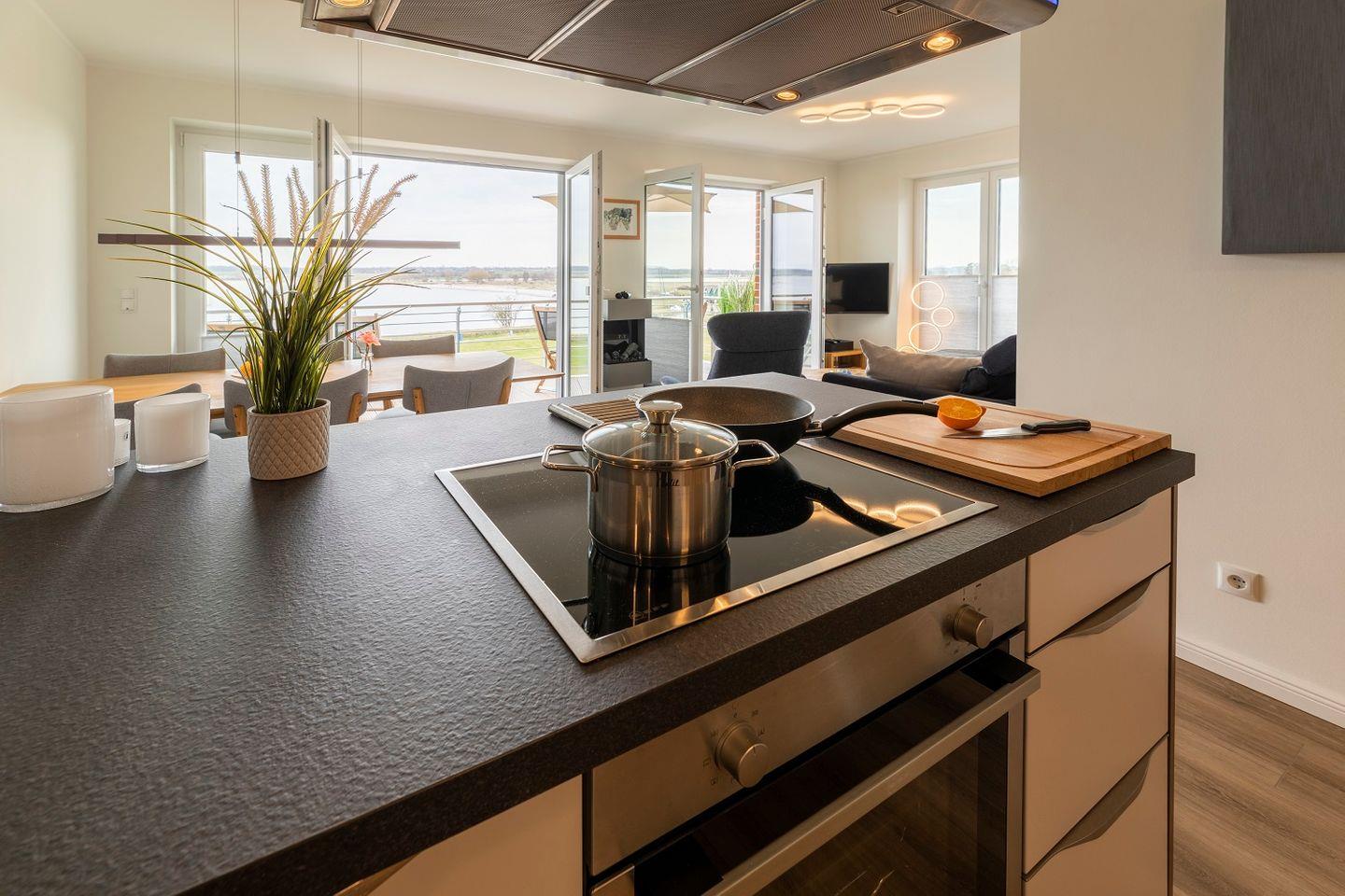 Ebenfalls in dem Wohnraum integriert sorgt die offene Küche mit Koch-Insel für eine moderne Raumaufteilung.