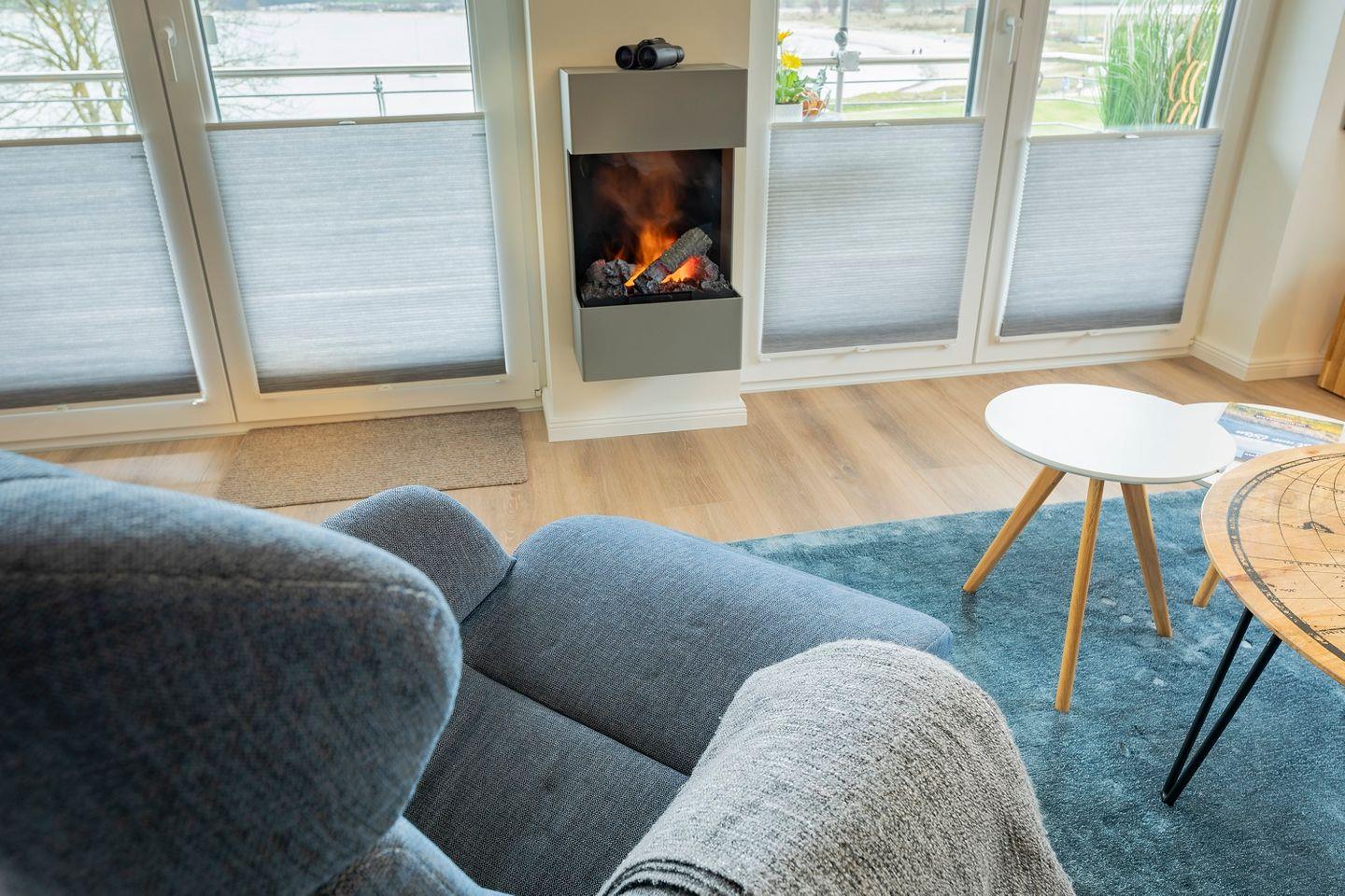 Der helle Wohnraum der Ferienwohnung "Schöne Aussicht" verfügt über eine große Fensterfront, hinter welcher sich der schöne Balkon der Wohnung erstreckt. Direkt davor befindet sich das gemütliche Sofa und Esstisch, die nach einem langen Tag am Meer zum Entspannen einladen. Ein großer Fernseher sorgt für Unterhaltung wenn gewünscht. Ein Elektro-Kamin sorgt am Abend für zusätzliche Gemütlichkeit.