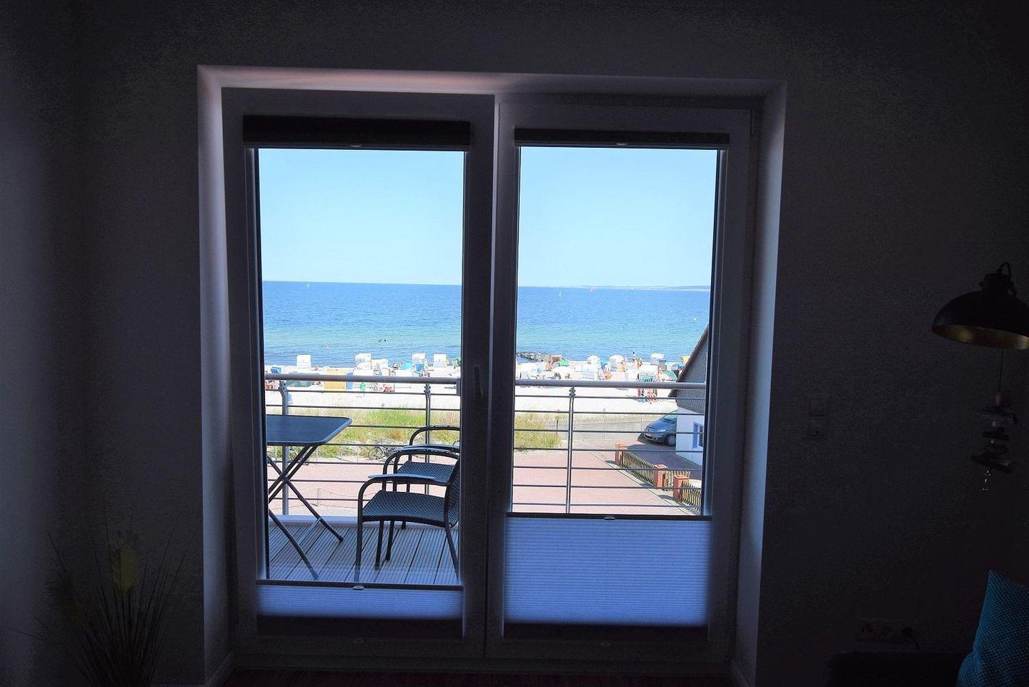 Vom großen Balkon aus kann der Blick direkt auf die Ostsee fallen. Dieser kann direkt vom Wohnzimmer aus betreten werden und überzeugt durch seine Ost-Lage. Durch seine Möblierung mit einem Tisch und -stühlen kann der Balkon vor allem in der warmen Jahreszeit als zweites Wohnzimmer fungieren.