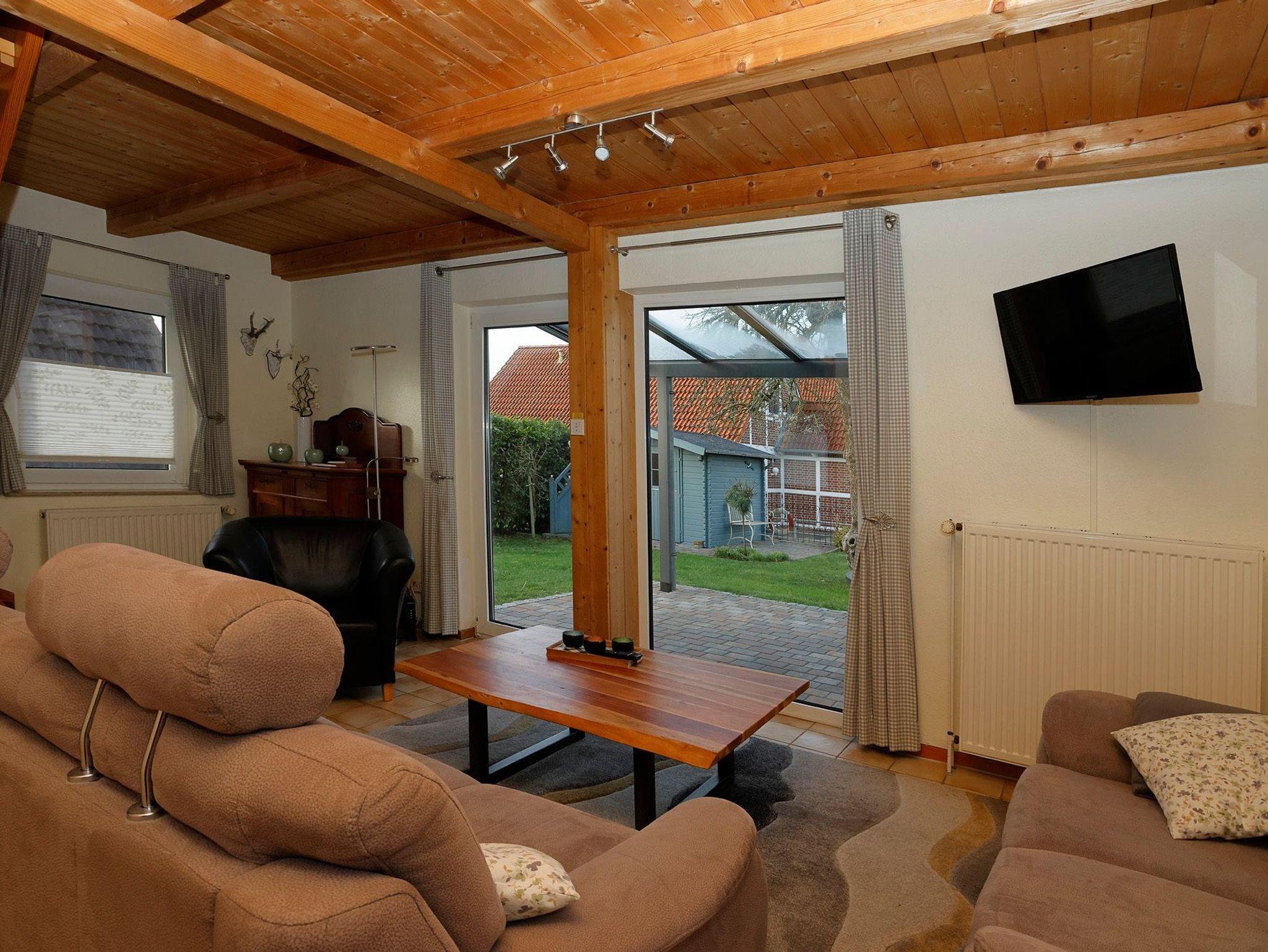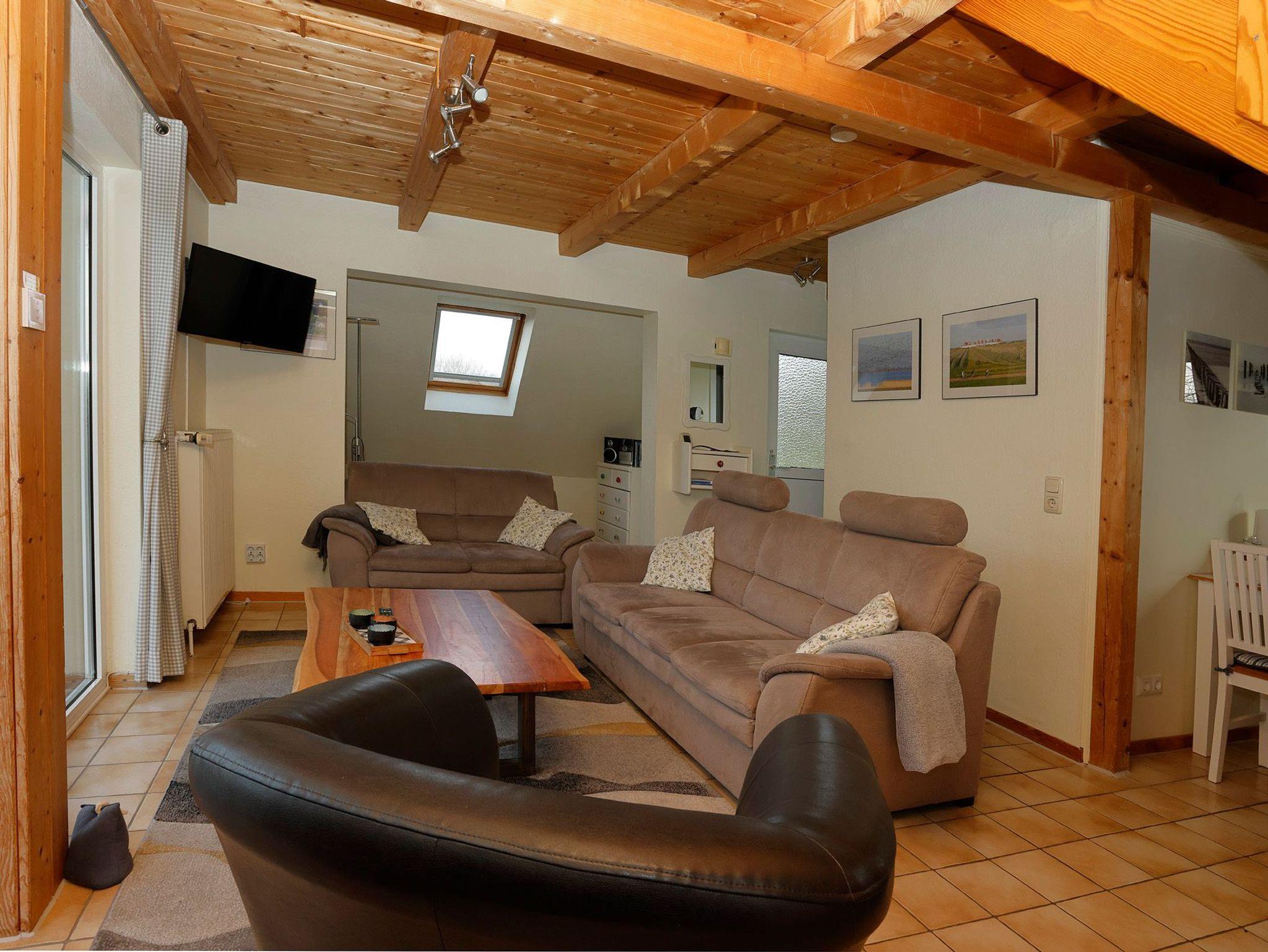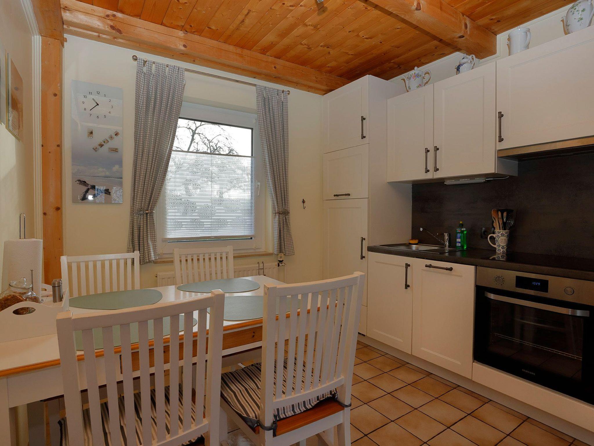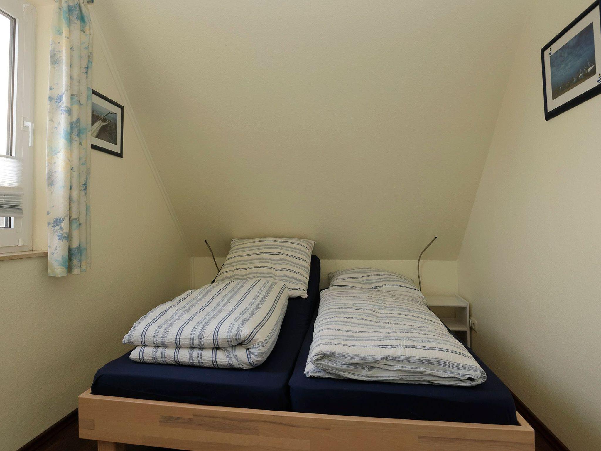 Das massiv errichtete Ferienhaus 128, vom Typ Scout 60 (Herbstprinz), verfügt über ca. 60 m² Wohn-/Nutzfläche auf 2 Etagen und kann mit bis zu 4 Personen (+ 1 Kleinkind im Kinderreisebett - 1 Kinderreisebett und 1 Hochstuhl im Haus vorhanden) belegt werden. Im Erdgeschoss befindet sich das Badezimmer (Dusche/WC), das Wohnzimmer mit angrenzender offener Küche mit Essplatz (Ceran-Kochfeld/Backofen - Kühlschrank/Gefrierfach, Mikrowelle und Spülmaschine) und einem kleinen Erker mit Lesesessel. Zugang zur überdachten und möblierten Terrasse und zum außenliegenden Abstellraum vom Wohnzimmer. Über die offene Treppe im Wohnbereich gelangt man zu den beiden Schlafräumen (ein Schlafraum mit einem Doppelbett und ein Schafraum mit zwei Einzelbetten) im Obergeschoss. Das zum Haus gehörende Gartenhäuschen bietet zusätzliche Abstellfläche (für Fahrräder etc.). Nichtraucherhaus - kostenloses WLAN - Haustiere erlaubt (mobiler Hundezaun vorhanden) - Brötchenservice von Ostern bis Oktober!