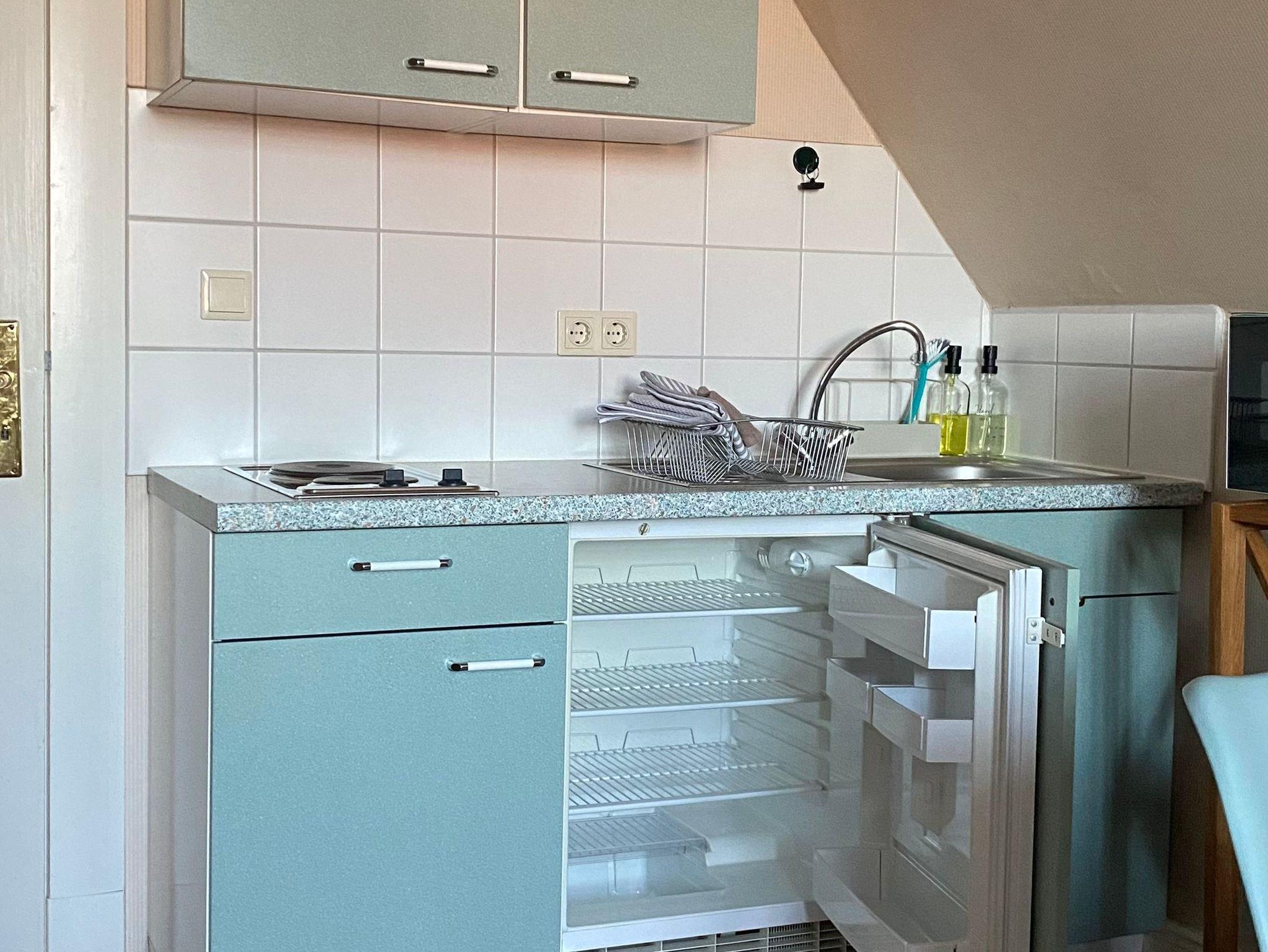 Eine TV Ecke mit Sofo und ein Tisch für 4 Personen bieten Platz und Rückzugsmöglichkeiten gleichermaßen. An einer kleinen Küchenzeile kann ein Imbiss zubereitet werden und das Bad schließt sich dem Schlafzimmer an.