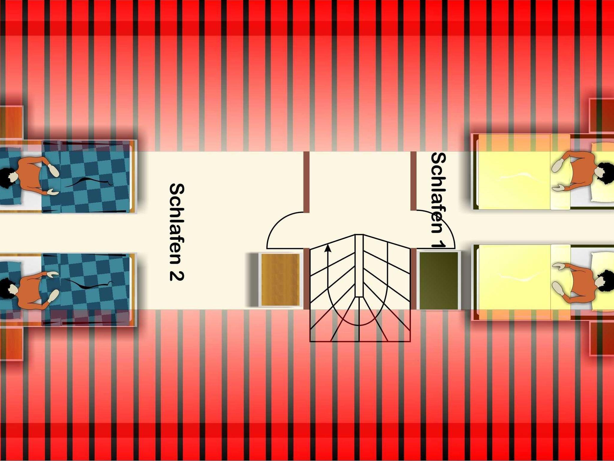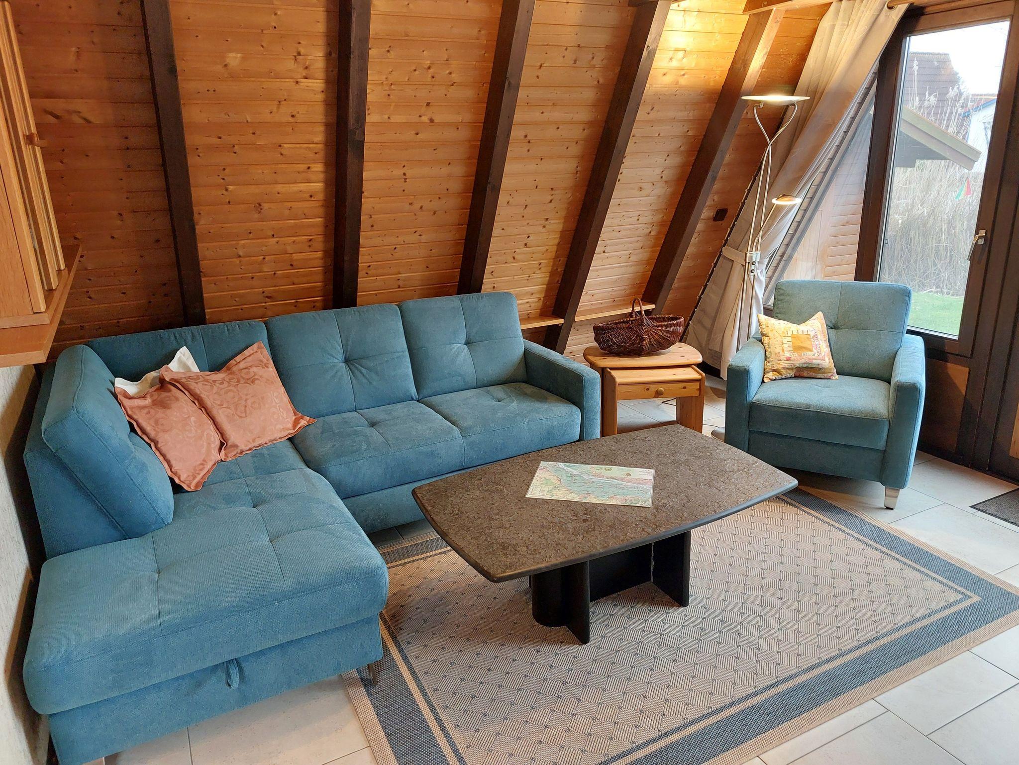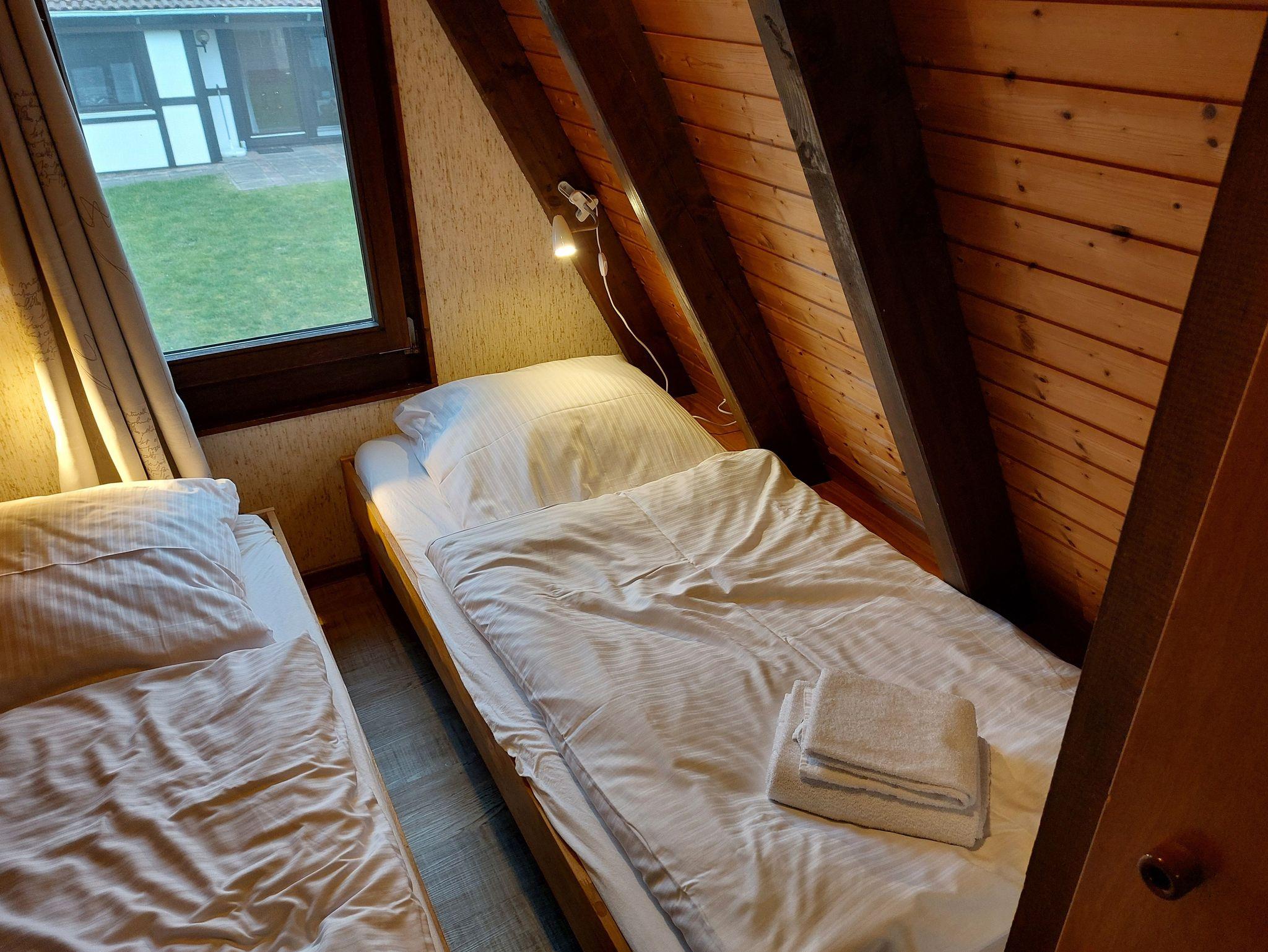 Unser Nurdachhaus 25, Typ Wigwam, verfügt über ca. 53 m² Wohn-/Nutzfläche und kann mit bis zu 5 Personen belegt werden. Im Erdgeschoss befinden sich das Badezimmer (Dusche/WC), eine kleine Abstellfläche (Abseite hinter der Treppe) und der Wohnraum mit Schlafcouch, Essplatz und Durchgang zur Küche (4-Plattenherd, Kühlschrank/Gefrierfach). Zugang zur möblierten Terrasse vom Wohnzimmer. Im Obergeschoss (über eine steile, offene, angewendelte Treppe erreichbar) befinden sich 2 Schlafräume mit jeweils zwei Einzelbetten. Das zum Haus gehörende Gartenhäuschen bietet zusätzliche Abstellfläche (für Fahrräder etc.). Nichtraucherhaus - kostenloses WLAN - Haustiere erlaubt - Brötchenservice von Ostern bis Oktober!