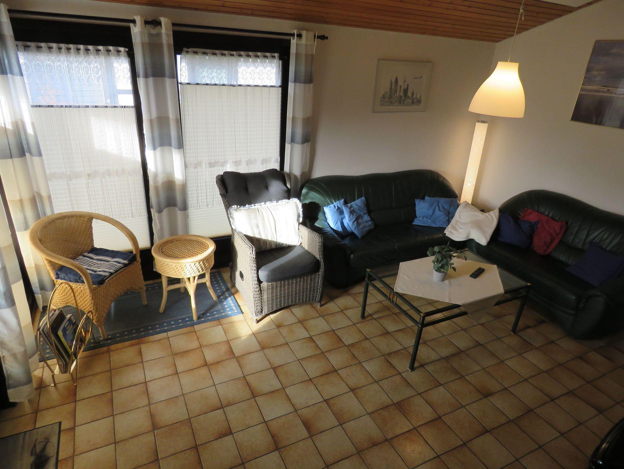 Vom Eingangsbereich (Flur) gelangt man in das Badzimmer (Dusche/WC) und den Wohnraum (Zugang zur möblierten Terrasse und dem außenliegenden Abstellraum. Das Ferienhaus bietet Ihnen einen Schlafraum mit einem Doppelbett, einen Schlafraum mit einem eingebauten Hochbett und 2 Einzelbetten, ein Badezimmer (Dusche/WC), ein geräumiges Wohnzimmer mit offener Küche (4-Plattenherd/ Backofen, Kühlschrank/Gefrierfach) und Essplatz. Zugang zur möblierten Terrasse vom Wohnzimmer. Nichtraucherhaus - kostenloses WLAN - Haustiere nicht erlaubt - Brötchenservice von Ostern bis Oktober!