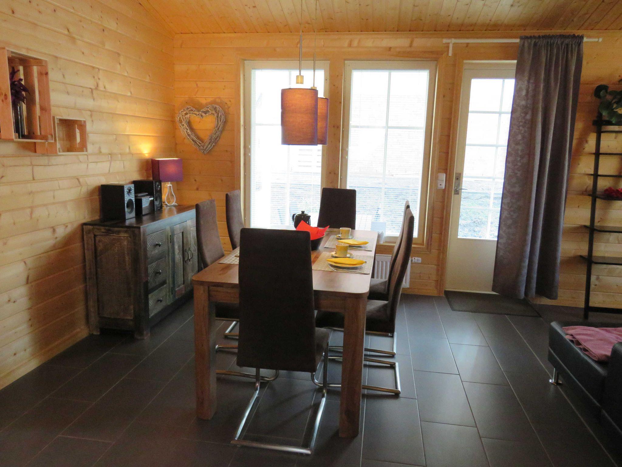 Der hochwertig eingerichtete Wohnraum verfügt über eine gemütliche Sitzecke und Essplatz mit integrierter Küche (Ceran-Kochfeld, Backofen, Kühlschrank/Gefrierfach, Spülmaschine). Das Badezimmer ist mit einer ebenerdigen Dusche und einem WC ausgestattet. Das Haus verfügt über einen Schlafraum mit einem Doppelbett und einen Schlafraum mit einem Etagenbett, über einen SAT-Fernsehanschluss (abweichend von den übrigen Ferienhäusern im Feriendorf) sowie einen kostenfreien WLAN-Anschluss. Ein Abstellraum befindet sich innerhalb des Hauses. Der Hauseingang und die möblierte Terrasse sind überdacht. Nichtraucherhaus - Haustiere erlaubt - Brötchenservice von Ostern bis Oktober!
