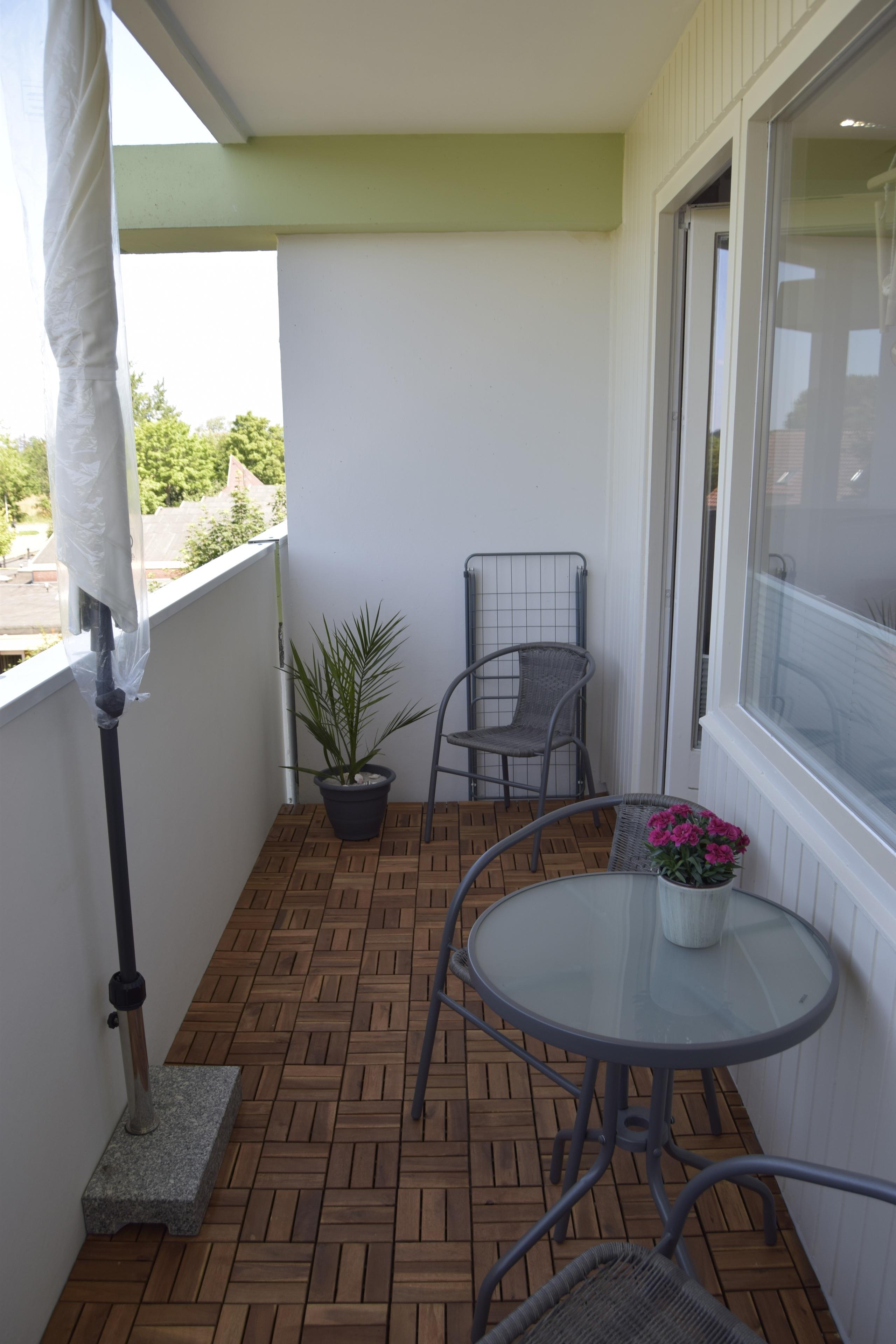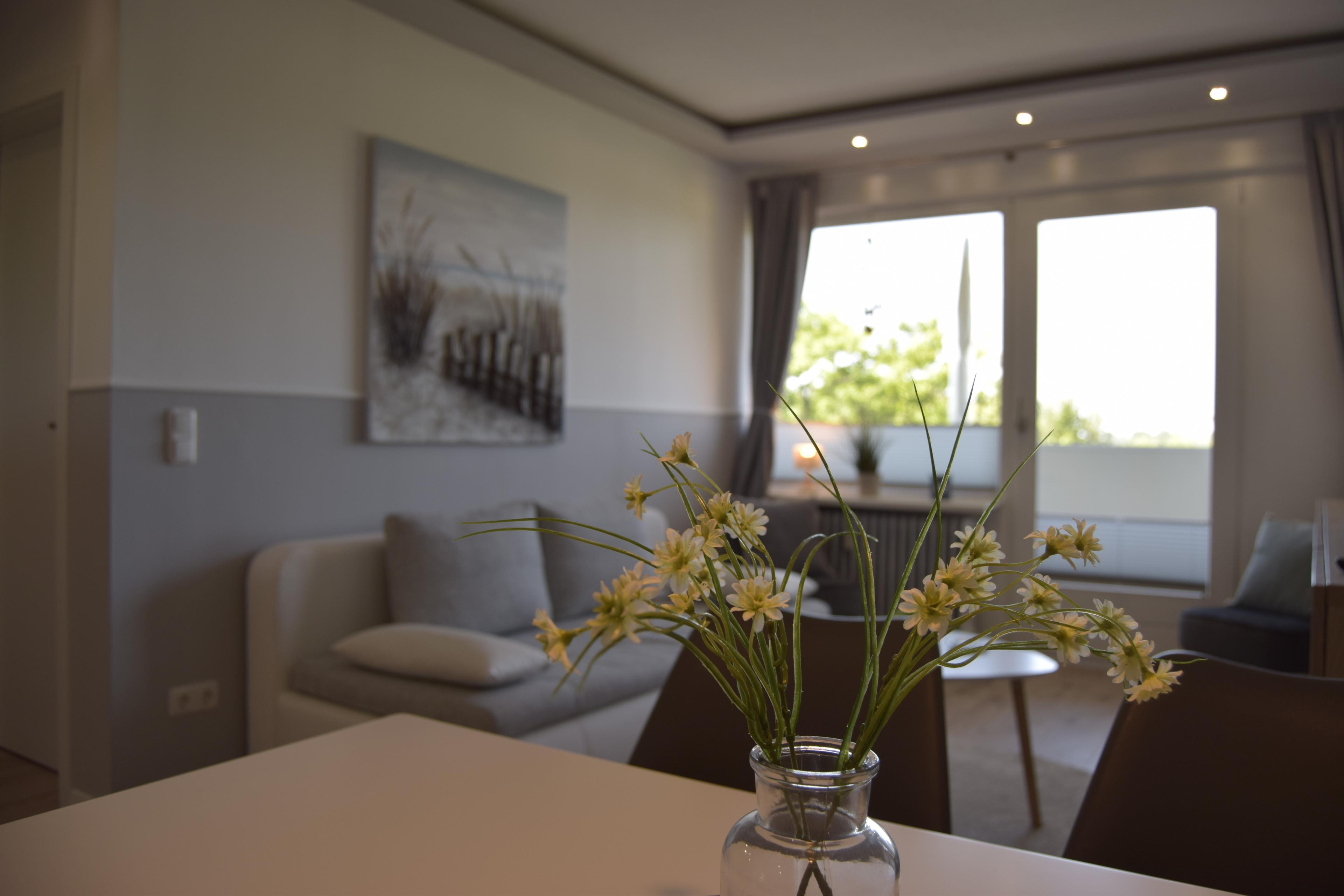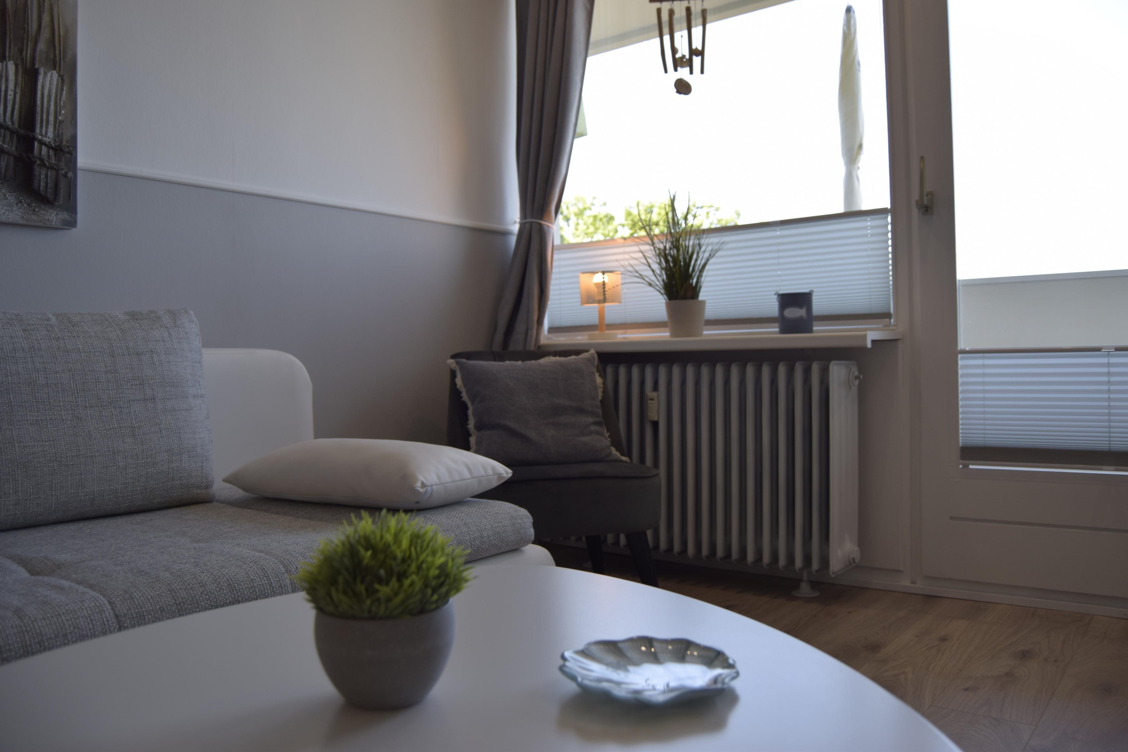 Die Einrichtung ist modern, hell und passend zum Urlaubsziel maritim eingerichtet. Da der Balkon zur Westseite ausgerichtet ist, kann man die Sonnenstrahlen schon gegen Mittag genießen. Am Abend lädt der gemütliche, großzügige Balkon dazu ein, sich den herrlichen Sonnenuntergang über den Salzwiesen bei einem Glas Wein anzuschauen.