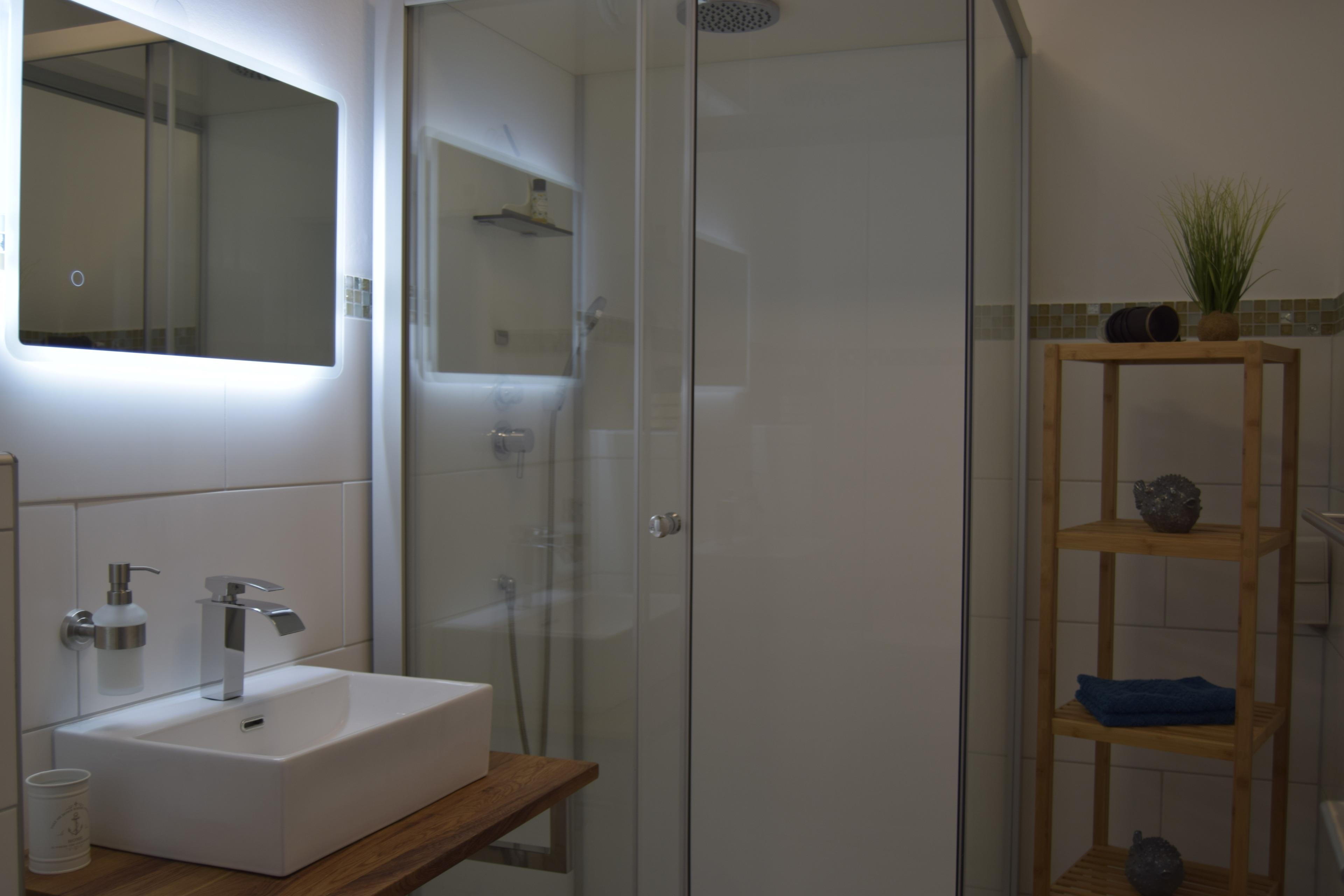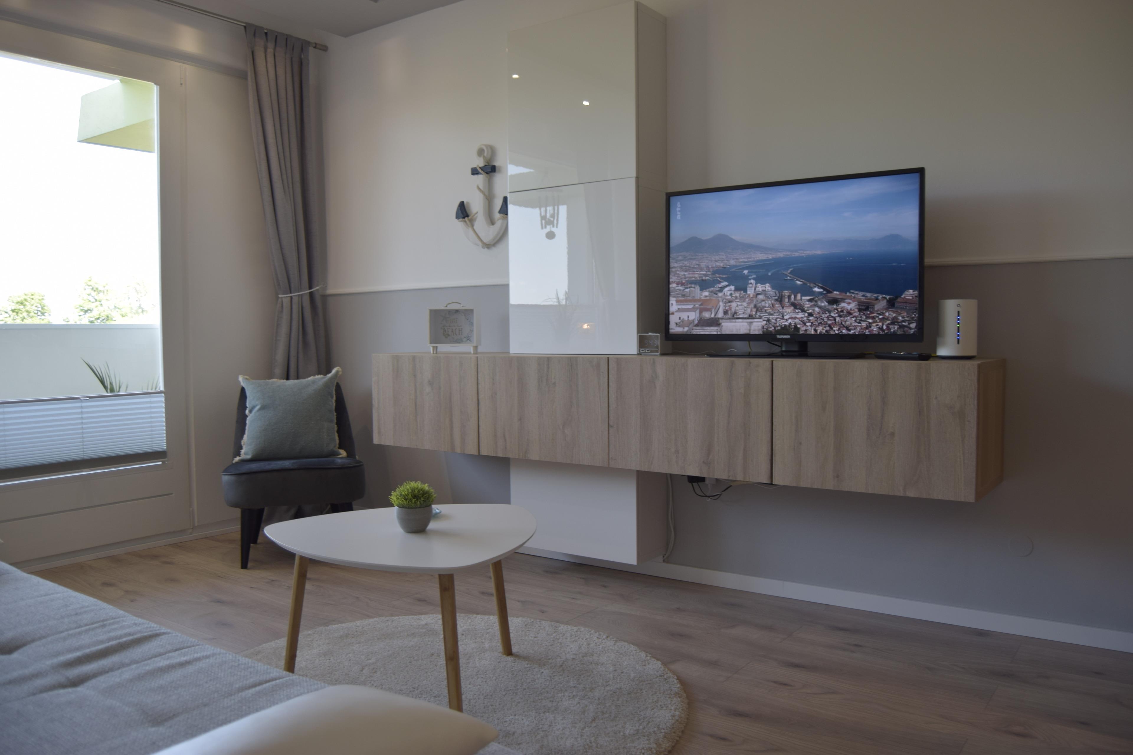 Die Essecke lädt zum gemütlichen Schlemmen ein. Ein Doppelbett steht in einem separaten Schlafraum. Ein geräumiger Kleiderschrank ist im Ankleidebereich zu finden. Die kleine, aber feine Küchenzeile lässt zur Selbstversorgung kaum einen Wunsch offen. Kühlschrank mit einem Eisfach, Backofen, Mikrowelle, Toaster, Wasserkocher und Kaffeemaschine sind vorhanden. Für den entspannten Kaffee am Morgen steht auch eine Nespressomaschine zur Verfügung. Das moderne Badezimmer, mit großzügiger Regendusche, bietet nach heißen Sommertagen die passende Erfrischung. In ca. 6 Gehminuten erreicht man den wunderschönen Strand von Kalifornien. Hier ist für jeden etwas dabei, kilometerlange Fahrradtouren, nicht enden wollende Strandspaziergänge, Wassersport oder einfach nur einen entspannten Strandtag genießen, sind hier kein Problem. Für Groß und Klein bietet der Holmer Marktplatz in den Sommermonaten diverse Angebote. Zum Verwöhnen finden Sie ein Kosmetikstudio, Boutique und einen Friseur auf dem Platz. Ein Spielplatz, Fahrradverleih, sowie einige Minigolf- Anlagen sind auch ganz in der Nähe. Der nahegelegene Ort Schönberg, mit diversen Einkaufsmöglichkeiten, ist in wenigen Autominuten zu erreichen. Vom Appartement aus sind es nur wenige Schritte zum Bus, der in unsere attraktive Landehauptstadt Kiel fährt. Parkmöglichkeiten sind in ausreichender Zahl vor dem Haus für Sie vorhanden. Ein Wäscheständer befindet sich auf dem Balkon.