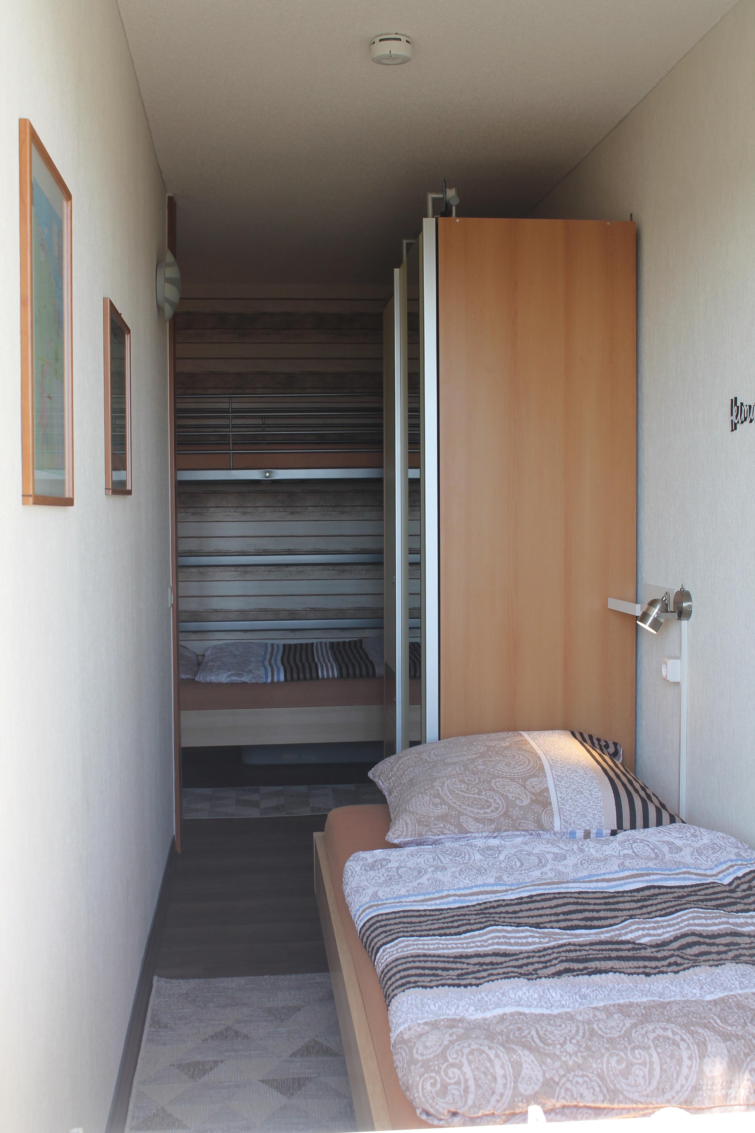 Im separaten Schlafzimmer befinden sich 3 Betten. Neben einem stabilen Etagenbett sowie einem Einzelbett findet man hier auch einen Kleiderschrank mit Spiegel und Schubladen, sowie Unterbettkommoden. Für das mitgebrachte Reisegepäck ist somit ausreichend Platz vorhanden.