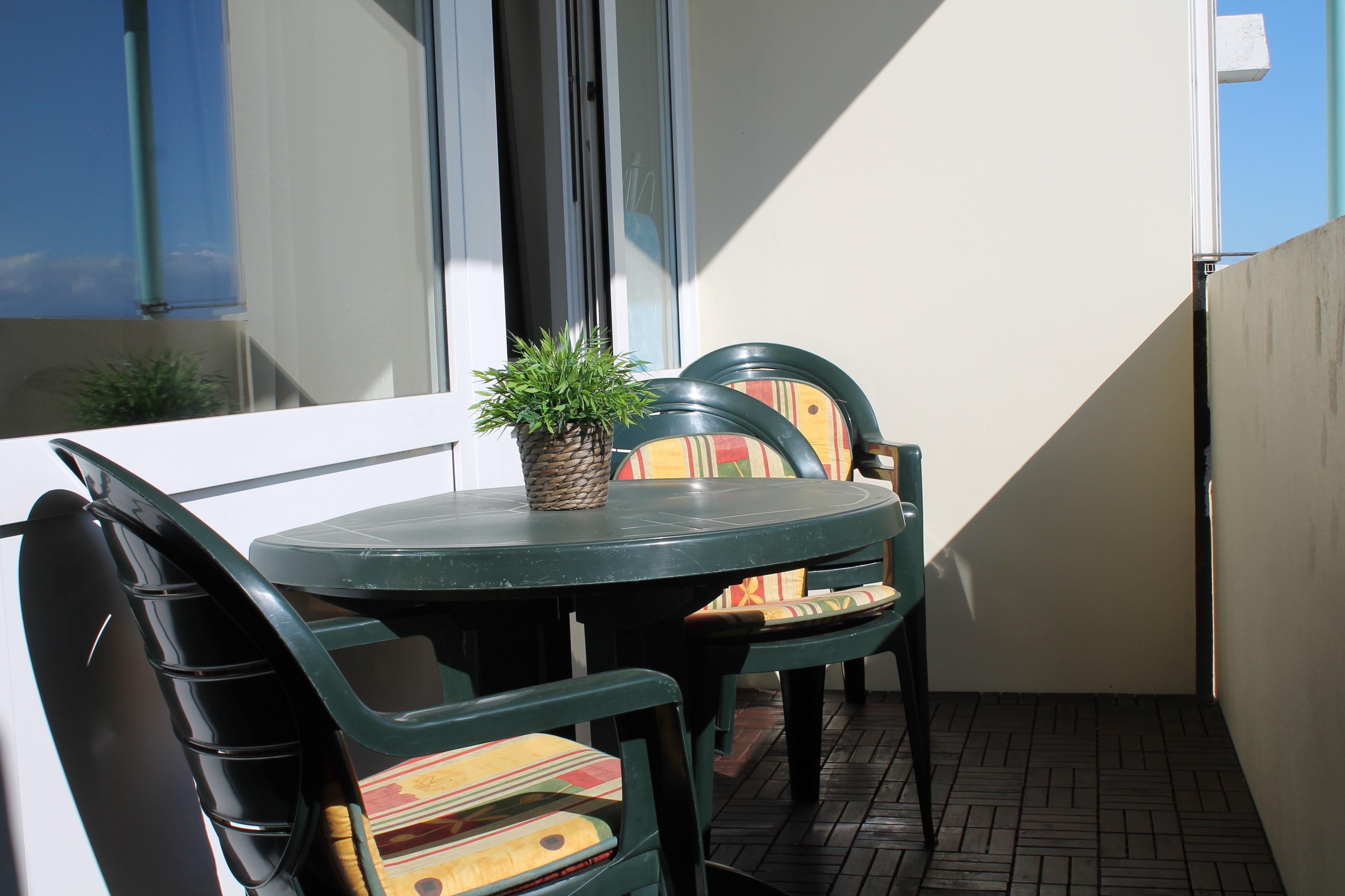 Auf dem großen überdachten Balkon mit Meerblick befindet sich neben einem Tisch mit 4 Stühlen auch ein Strandkorb mit Beleuchtung, auf dem man sich sehr gemütlich machen kann.
