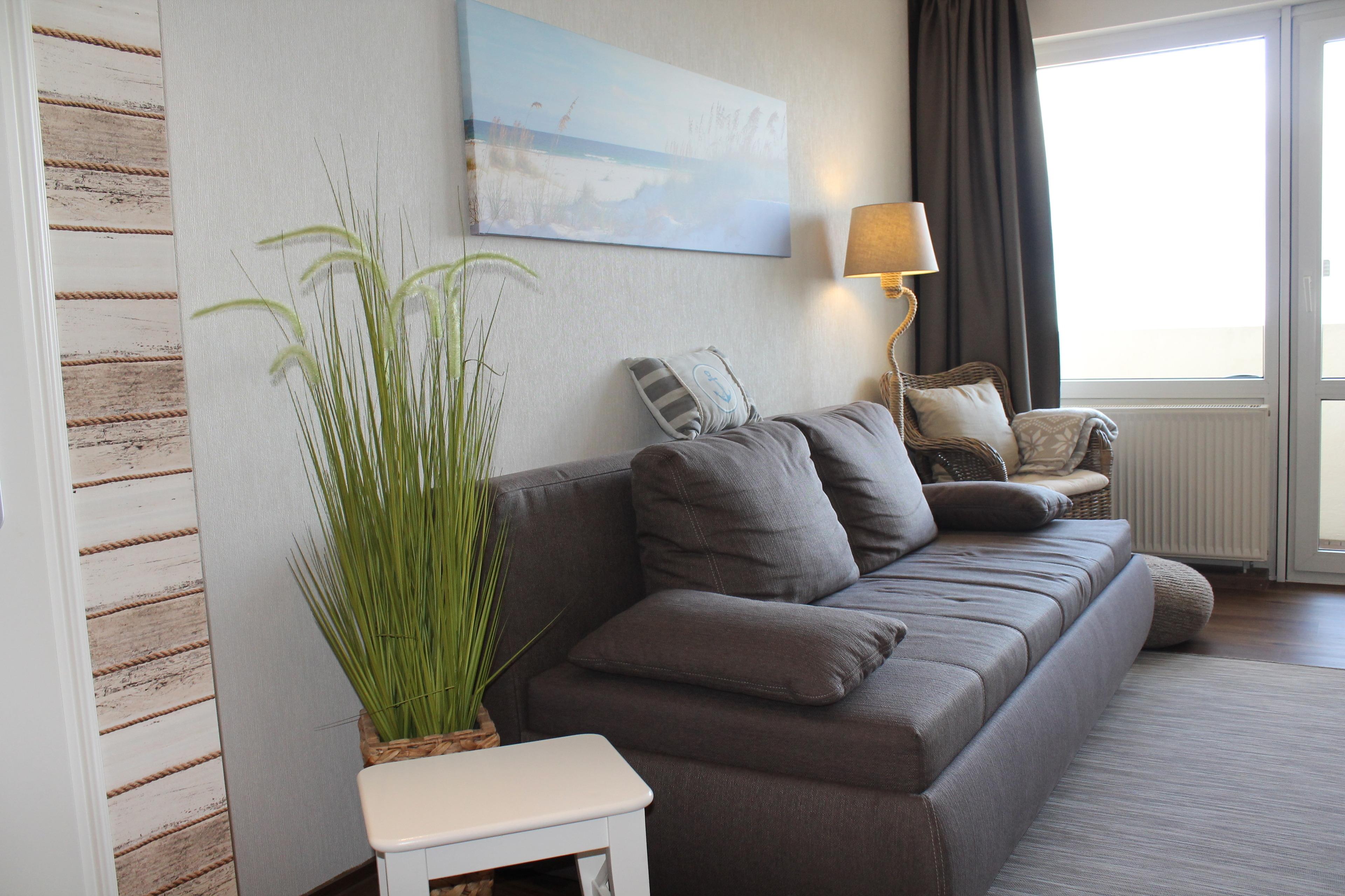 Im Wohnbereich befinden sich ein Sideboard mit Flachbild-Fernseher, DVD- Blu-ray Player, Radio mit CD-Player. Ein breites Sofa lässt sich mit wenigen Handgriffen in eine bequeme 1,60 x 2,00 Meter große Schlafcouch verwandeln.