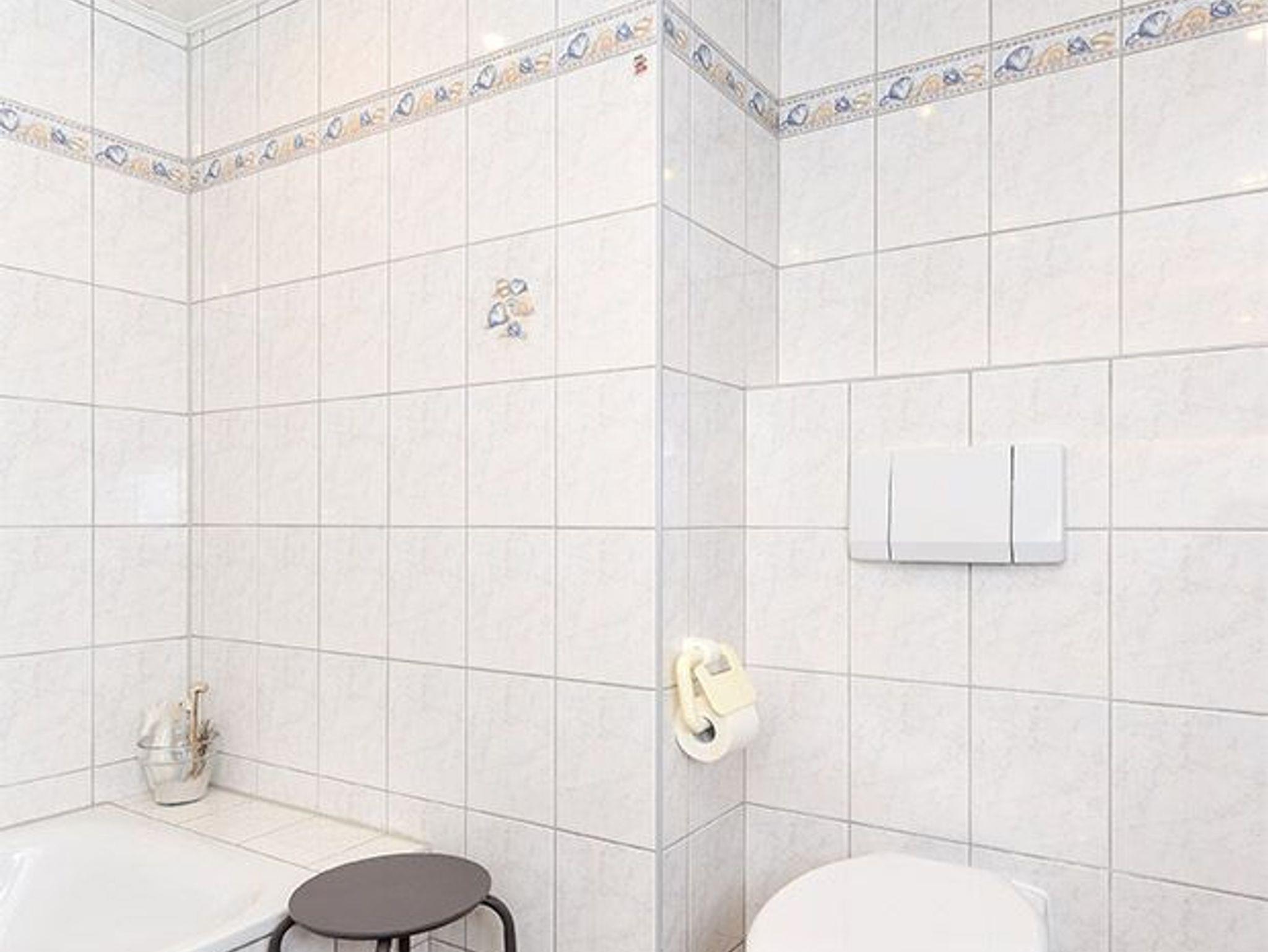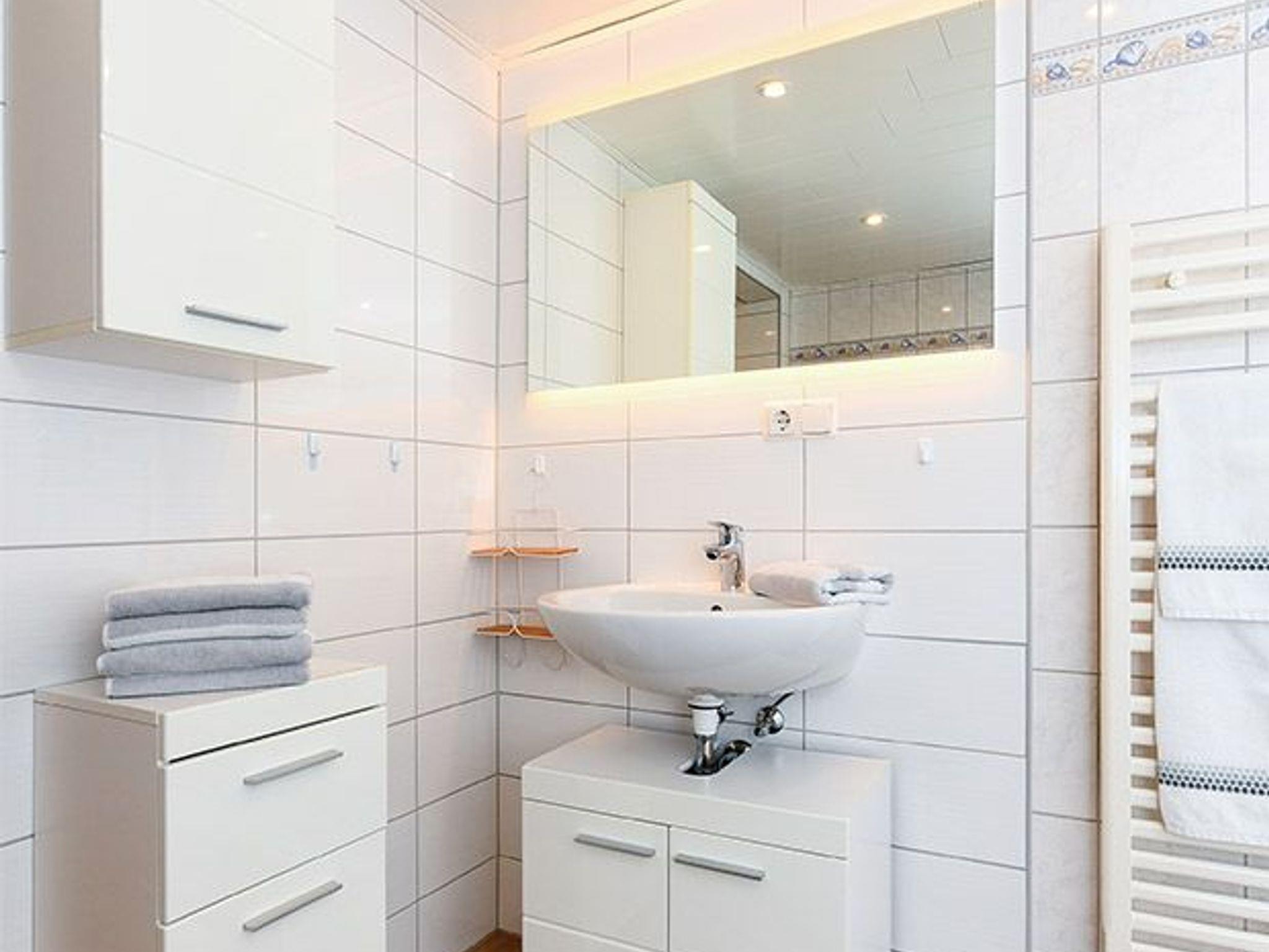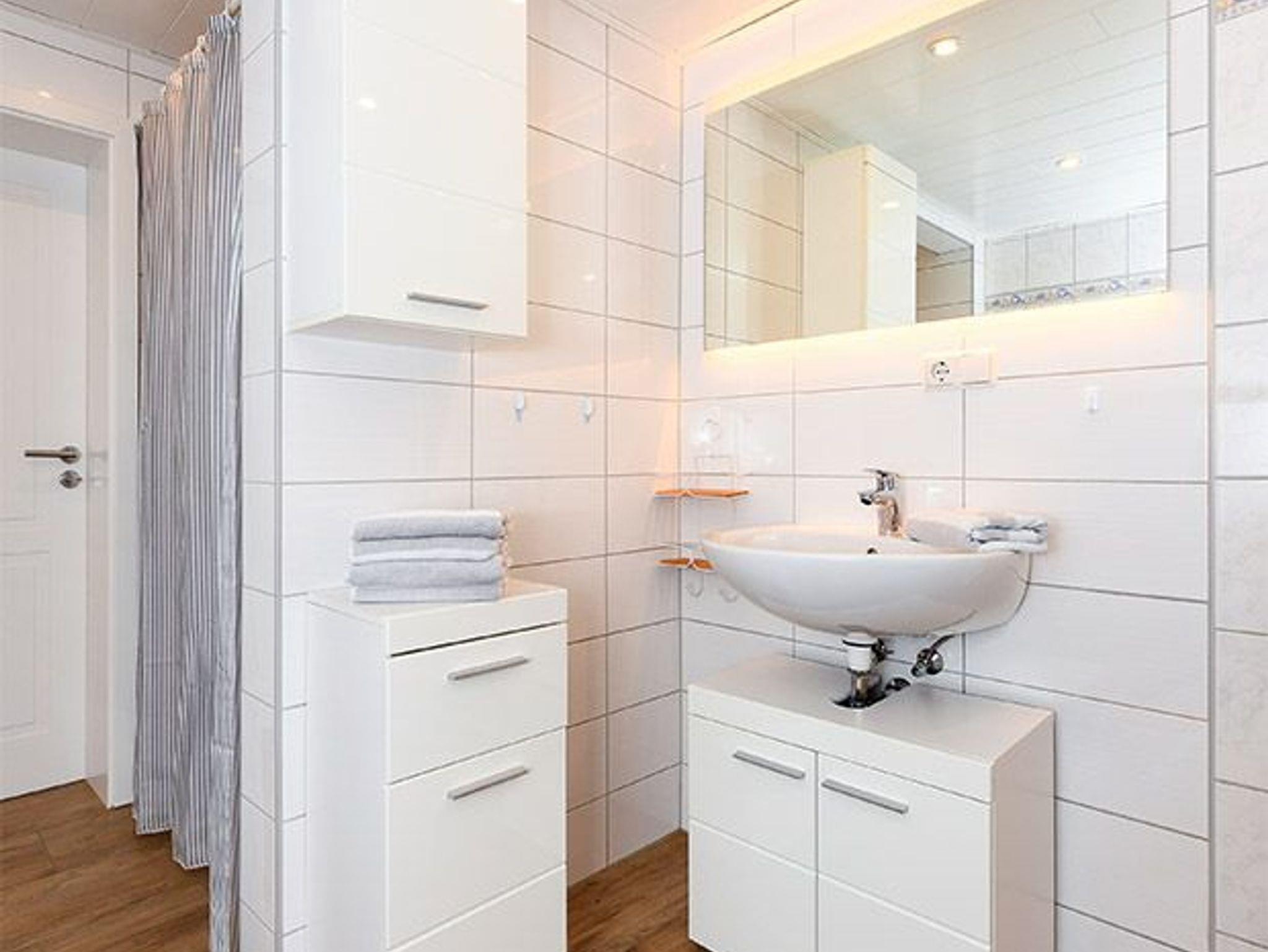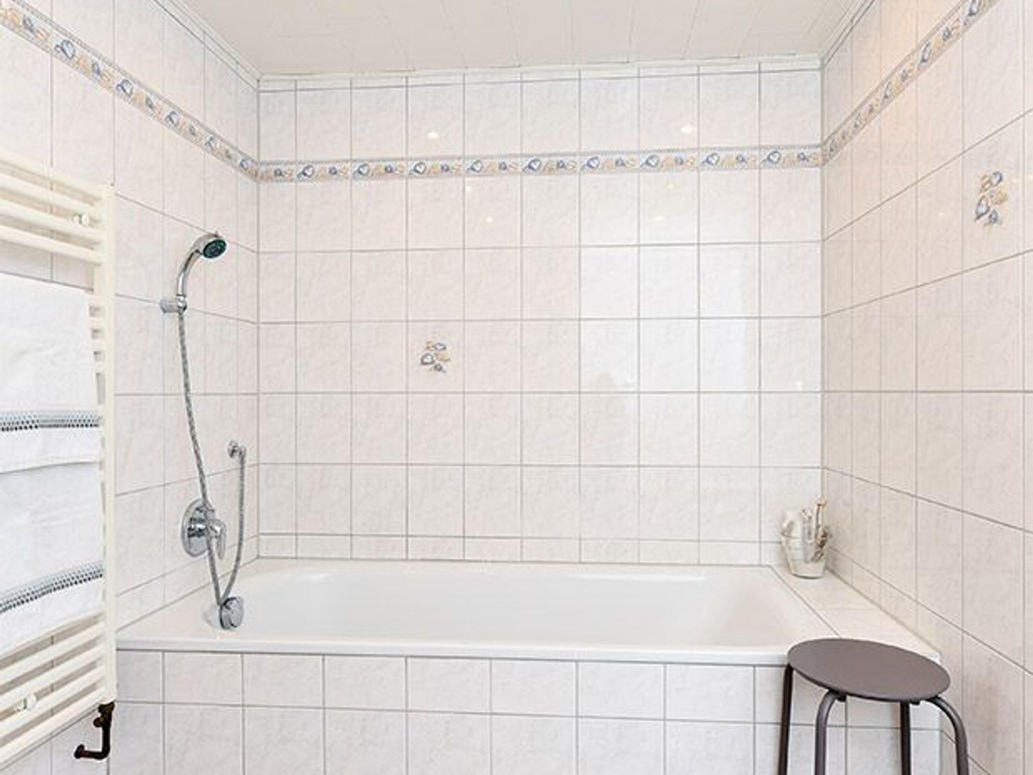 Badezimmer mit Badewanne, Dusche, Waschtisch und WC, Erdgeschoss, überdachte Terrasse, optimal für 2 bis 4 Personen.