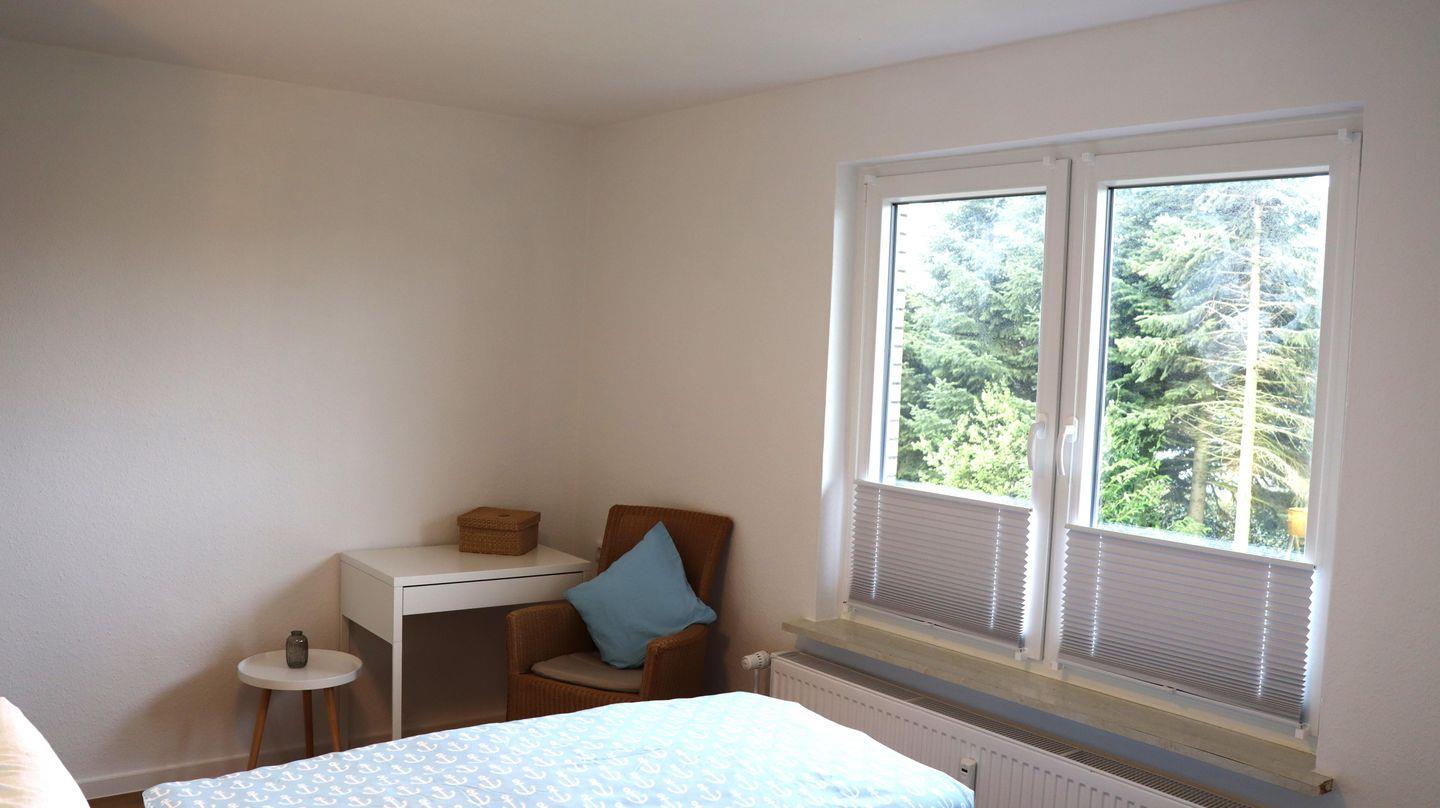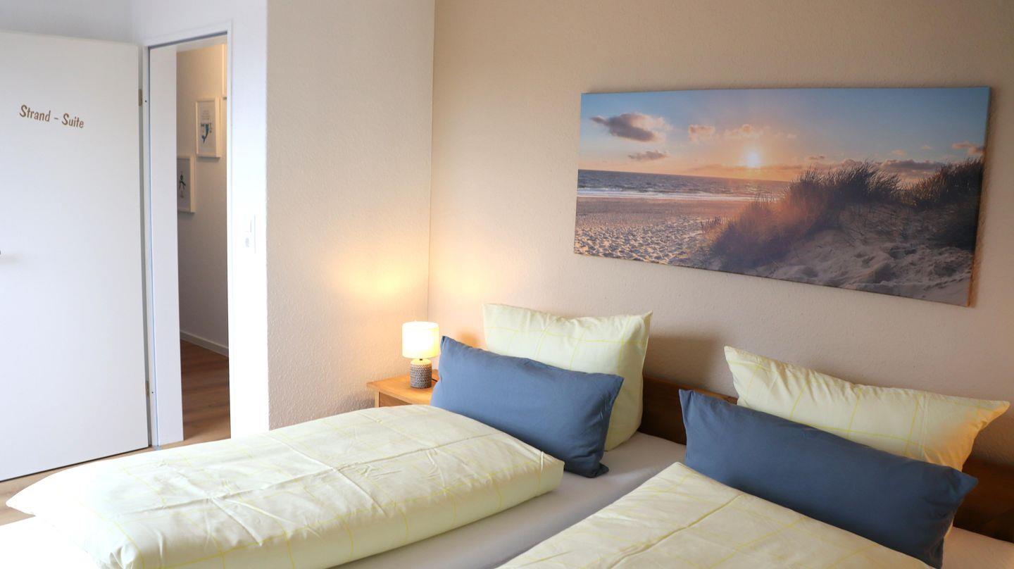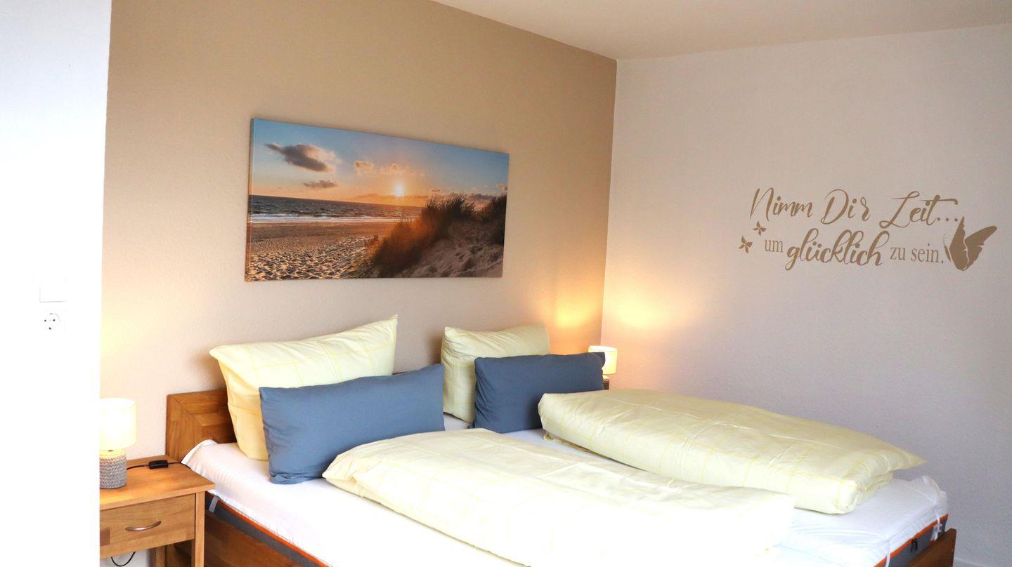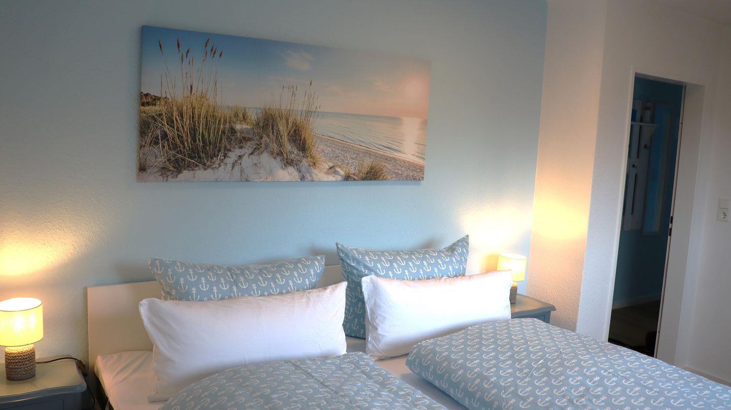 • 1 Schlafzimmer mit zwei Einzelbetten (je 90 x 200 cm), auf Wunsch zusammen– oder auseinanderstellbar