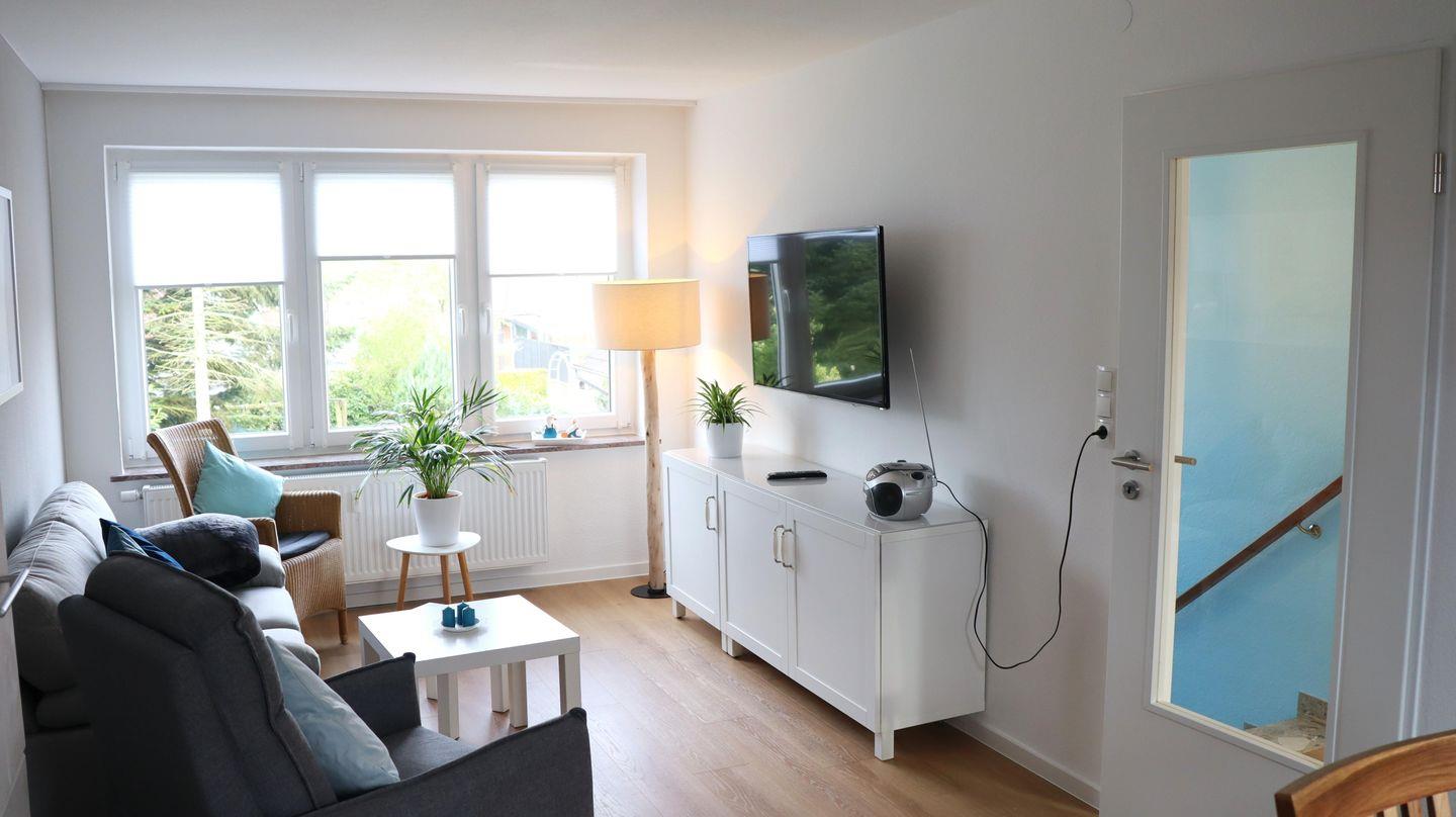 • Wohnzimmer mit Sofa, Relax-Sessel, Korbsessel, TV und Radio