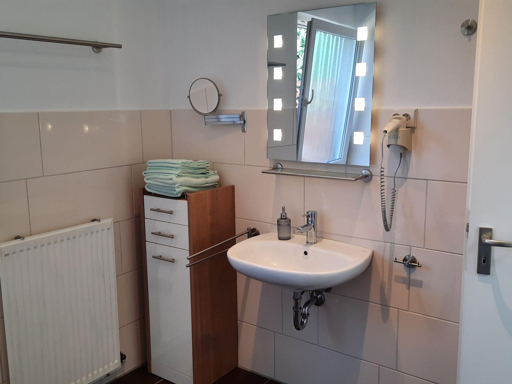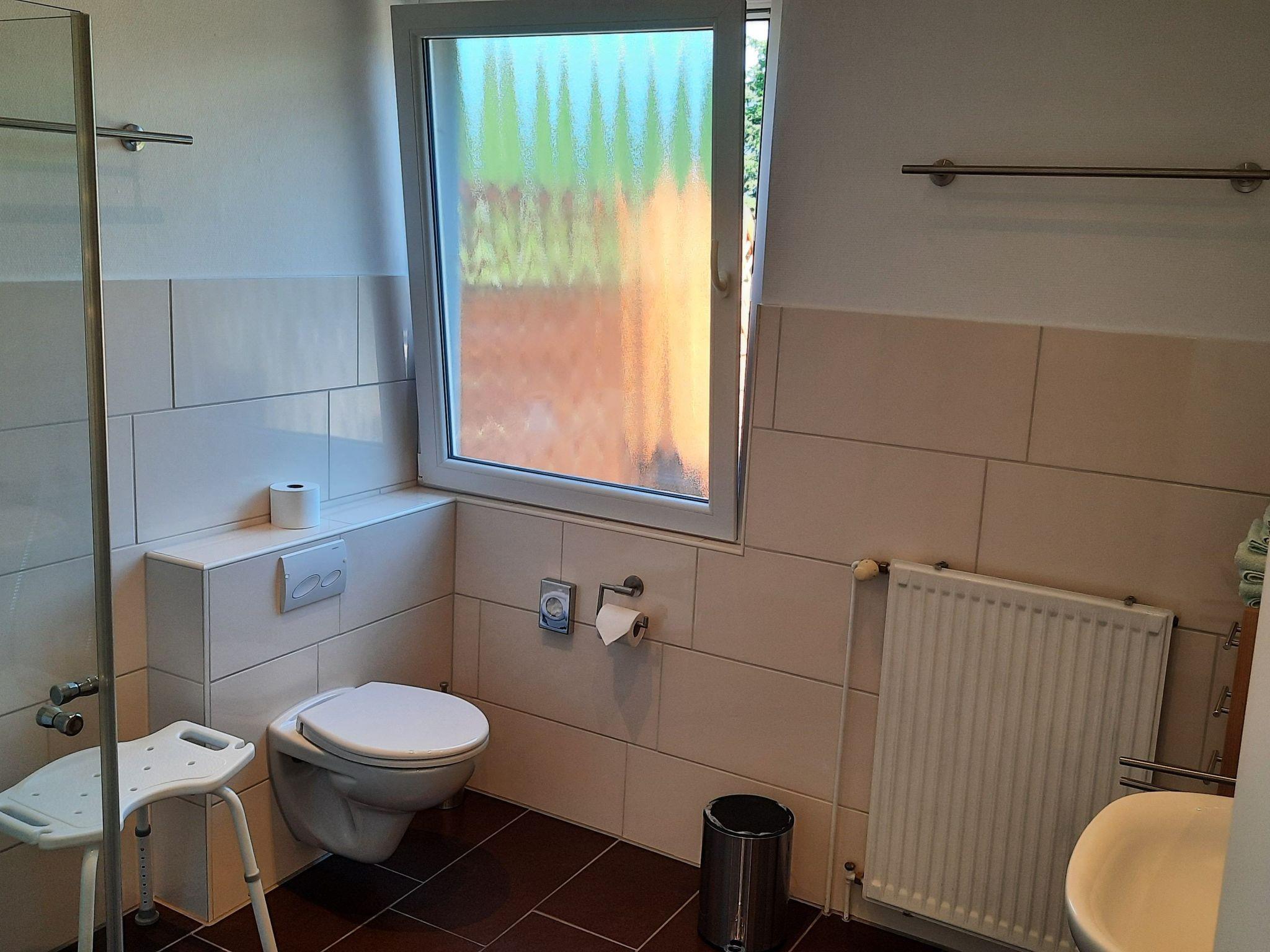 This ground-floor and barrier-free holiday flat is ideal for all age groups and has a living space of approx. 73 m² with two double bedrooms, a spacious daylight bathroom, a hallway with cloakroom and the main room as a living, dining and cooking area. The first bedroom has a spacious double bed measuring 180 cm x 200 cm. In addition, a five-door wardrobe offers plenty of storage space for your luggage. Two large windows let in plenty of natural light and give you a view of the green surroundings before and after going to bed. The second bedroom is furnished with two single beds and is therefore ideal for children. Of course, the two single beds can also be put together. The bedside table with reading lamp next to the bed allows guests to read a good book before going to sleep. A wardrobe is also available in this room. A cot can be ordered additionally for a fee for full occupancy. The heart of the flat is the eat-in kitchen, which is divided into a fully equipped cooking area with modern appliances for your extensive self-catering, a communal dining area and the cosy living area. In the fitted kitchen you will find a dishwasher, a cooker with ceramic hob, extractor bonnet and oven, a fridge with freezer compartment, as well as small electrical appliances such as a coffee machine, kettle, toaster and microwave. The dining area seats four guests together. In the cosy living area, you can relax after a day out on the comfortable leather sofa and two leather armchairs. Entertainment is provided by a flat-screen TV with satellite TV and stereo system. The bathroom is characterised by a floor-level, glazed shower cubicle, a bathroom window, hand basin and WC, make-up mirror and hairdryer. All windows are fitted with insect screens to ensure a good night's sleep. Finally, a separate, lockable bicycle storage room is at your disposal.