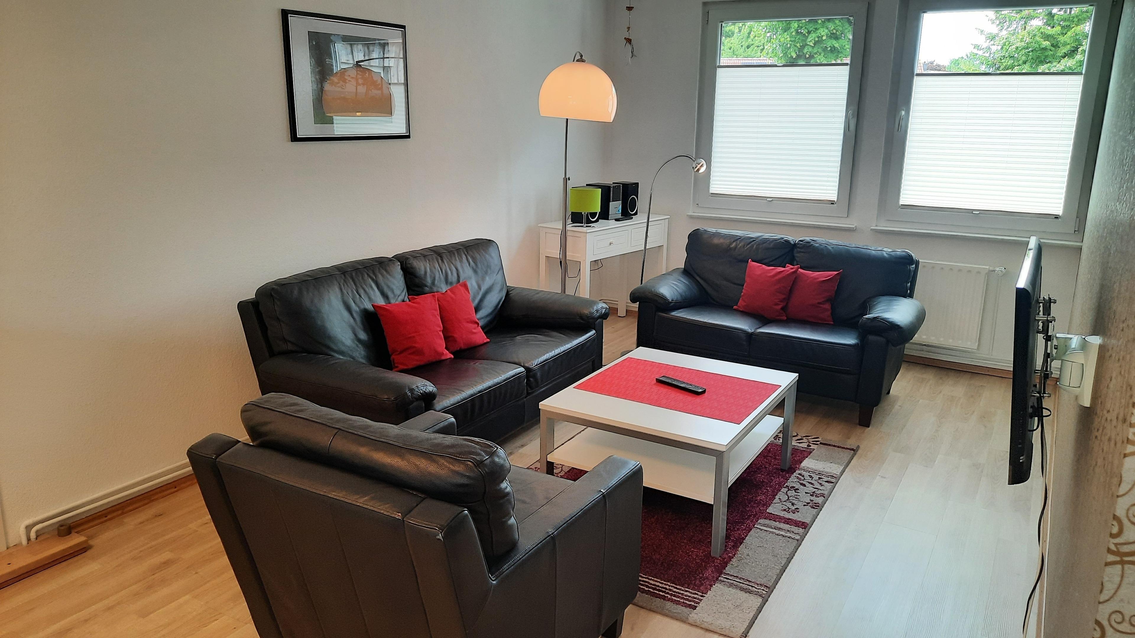 Die Ferienwohnung verfügt über zwei geräumige Schlafzimmer für vier Personen (ein Doppelbett und zwei Einzelbetten) und einen Hauptraum. Dieser unterteilt sich in einen Koch-/Essbereich mit vollwertiger Einbauküche und einen Wohnbereich mit bequemer Sitzecke und Fernseher. Die Wohnung ist ebenerdig und hat einen großen Vorflur. Für Fahrräder steht je Ferienwohnung ein separater abschließbarer Abstellraum zur Verfügung.