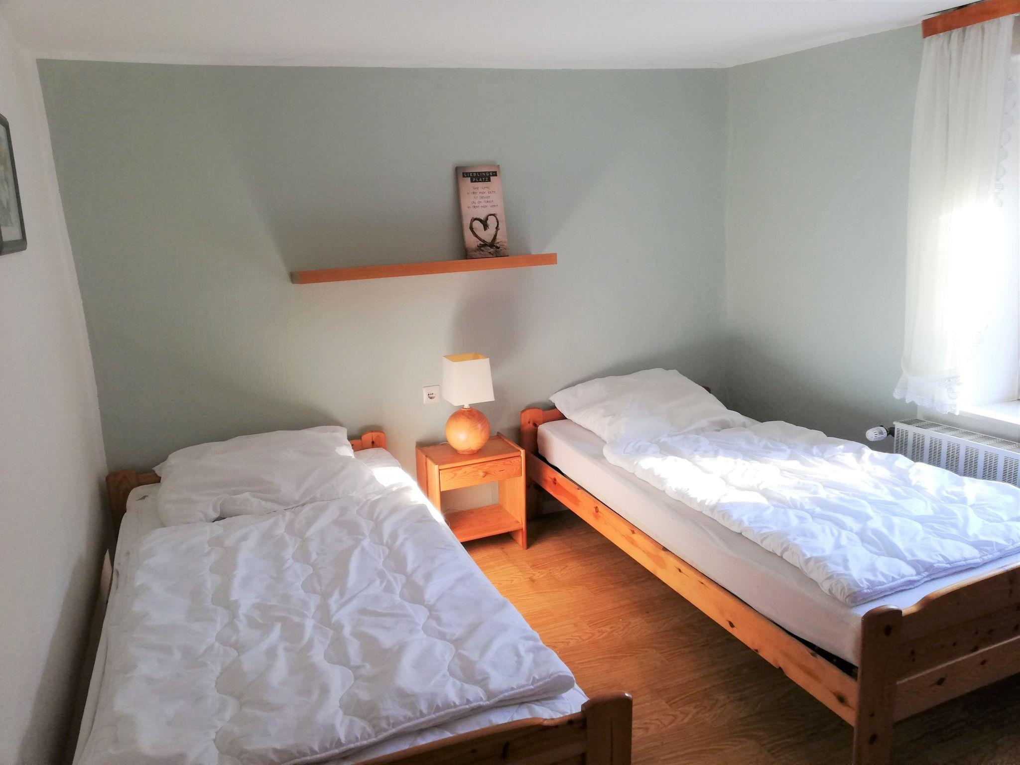 Spacious holiday home in a wooded, idyllic natural setting. The living room, a large eat-in kitchen and a bathroom with shower await you on the lower floor on approx. 120 square metres. Free WLAN is available to guests. A car parking space is also available. There are 4 bedrooms on the upper floor. 2 double rooms and 2 single rooms. One of the single beds can be converted into a double bed using a "large drawer". 3 of the 4 bedrooms are equipped with washbasins. WLAN, washing machine, stereo system, LED satellite TV, cooker with oven, ceramic hob, coffee machine, microwave, toaster, kettle, sufficient crockery, 2x charcoal grill, 2 seating areas, parasol...