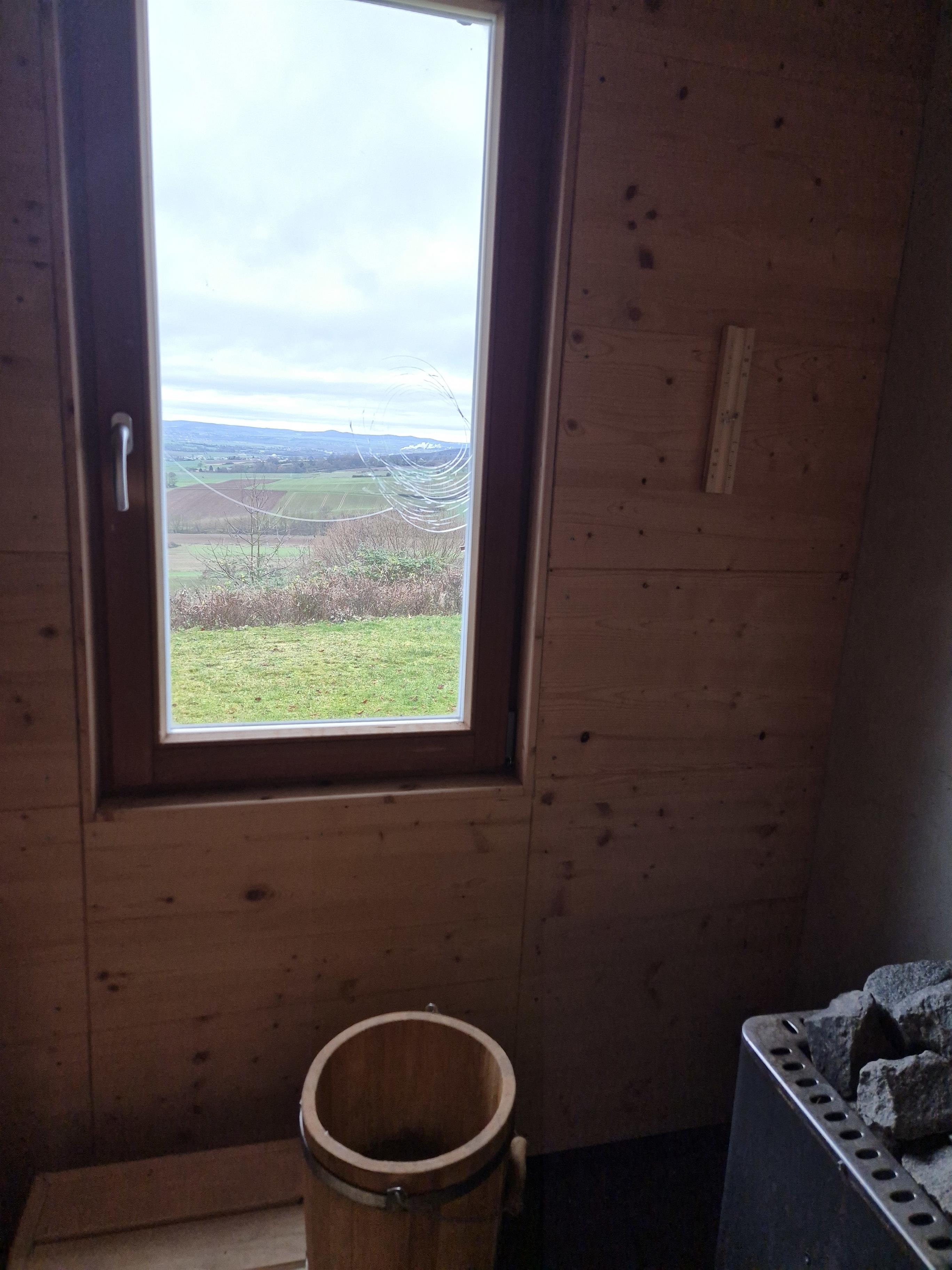- Die Sauna mit einem Fenster und Blick in die Ferne