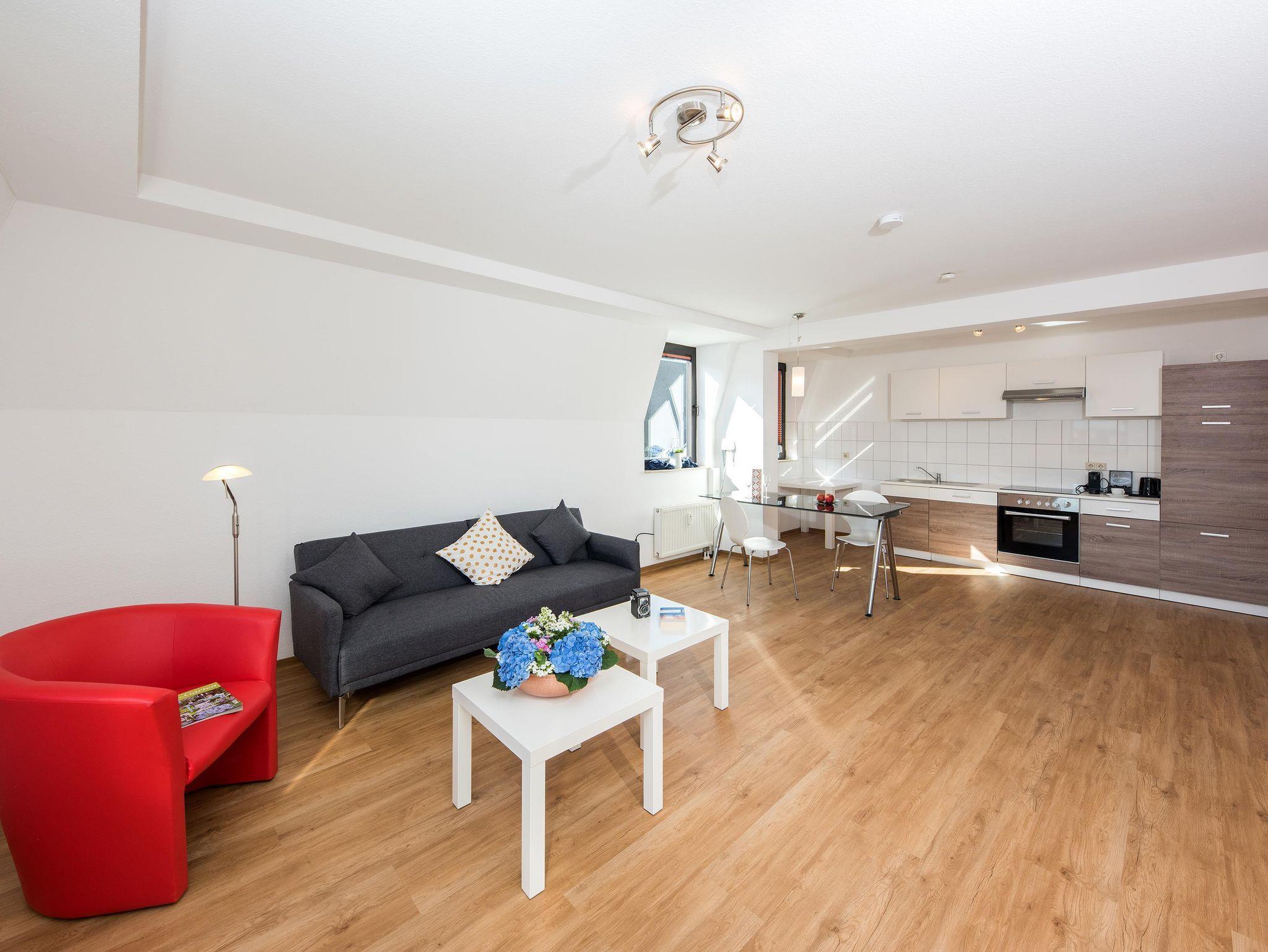 Das Wohnzimmer verfügt über einen Essbereich, Sofa und eine voll ausgestattete Küche. Auf Wunsch steht ein Schlafsofa (gegen Aufpreis) für zusätzliche Gäste bereit. Das Bad verfügt über eine Dusche. Außerdem gehören ein TV, W-LAN Zugang sowie eine Nespressomaschine zur Ausstattung.