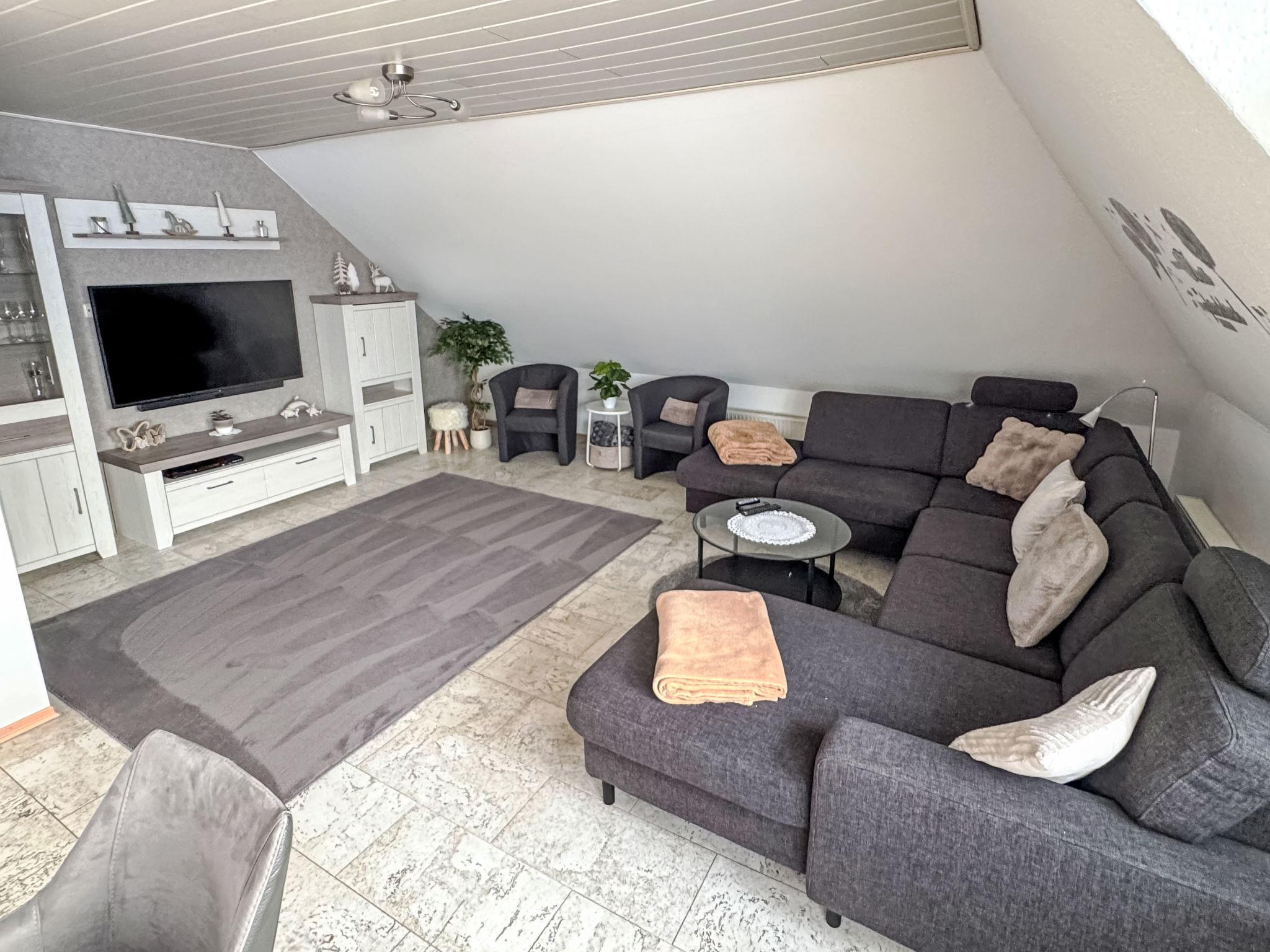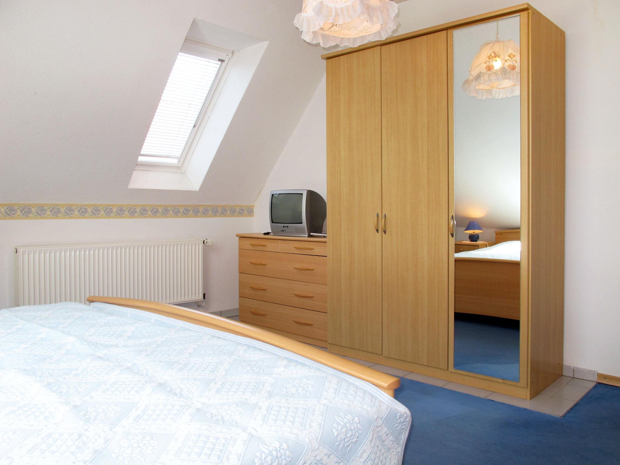 4-room apartment 140 m2 on 2 levels. Cosy furnishings: upper floor: living room with sloping ceilings with cable TV and radio. 2 rooms with sloping ceilings, each room with 1 double bed (2 x 90 cm, length 200 cm). Open kitchen (4 hot plates, oven, toaster, kettle, microwave, electric coffee machine). Bath/WC. Top floor: 1 room with sloping ceilings with 2 beds. Shower/WC. Facilities: children's high chair, baby cot. Internet (WiFi, free). Please note: non-smokers only. Smoke alarm.