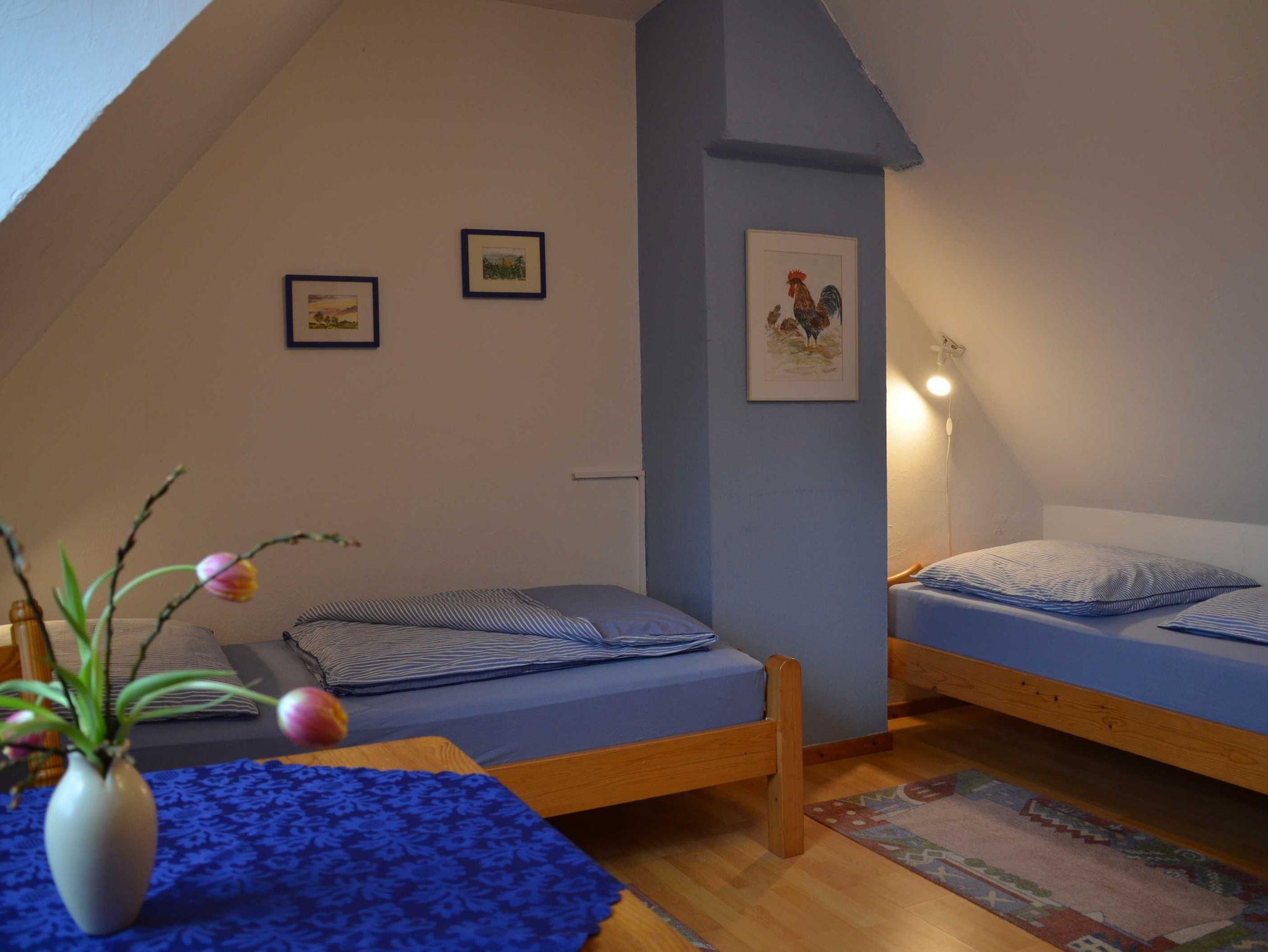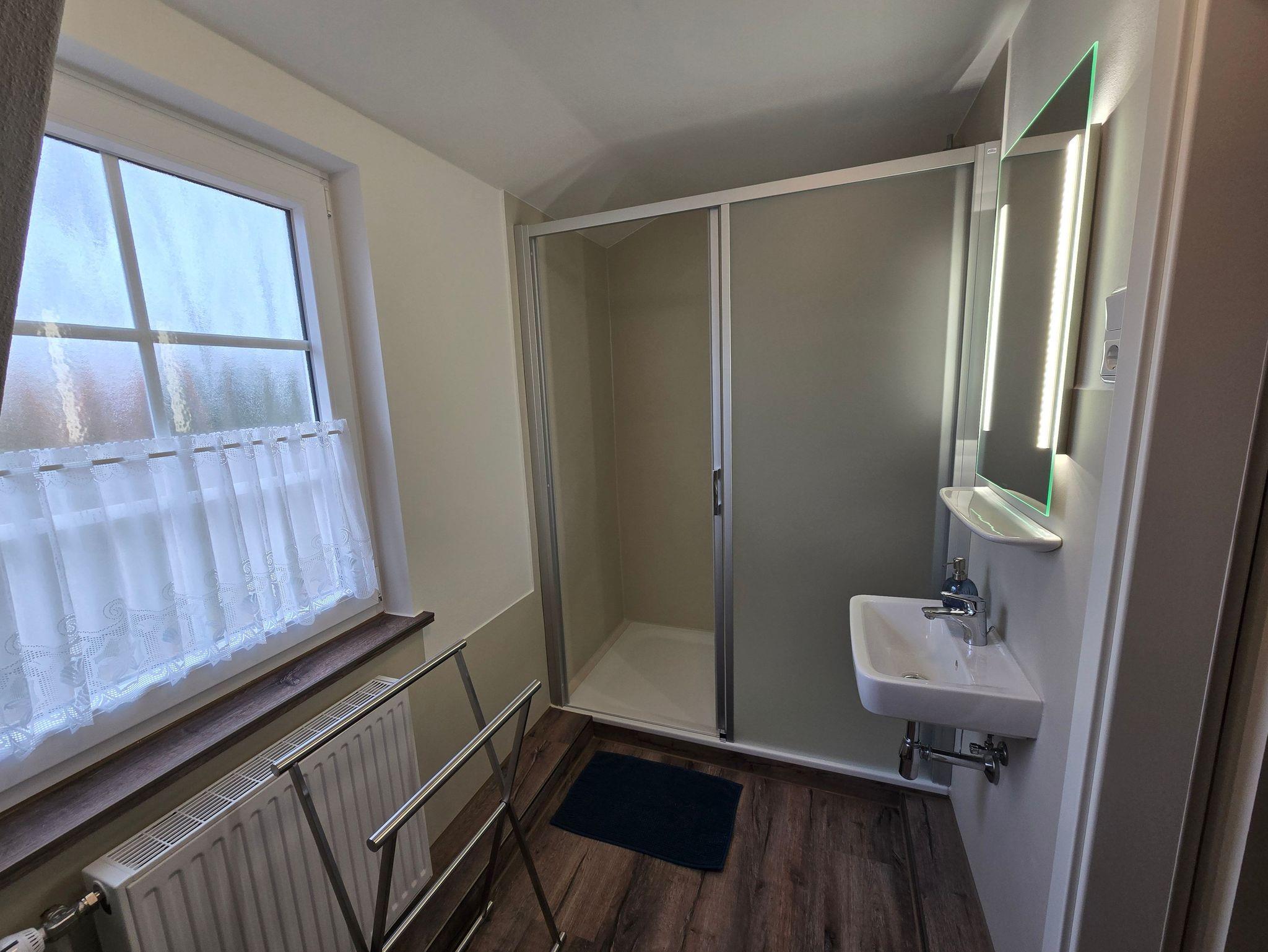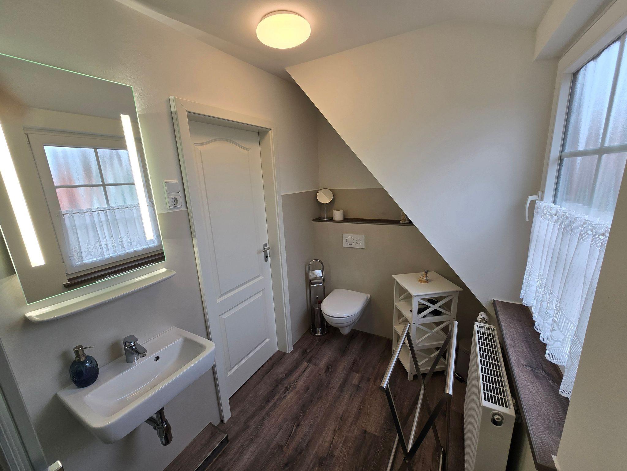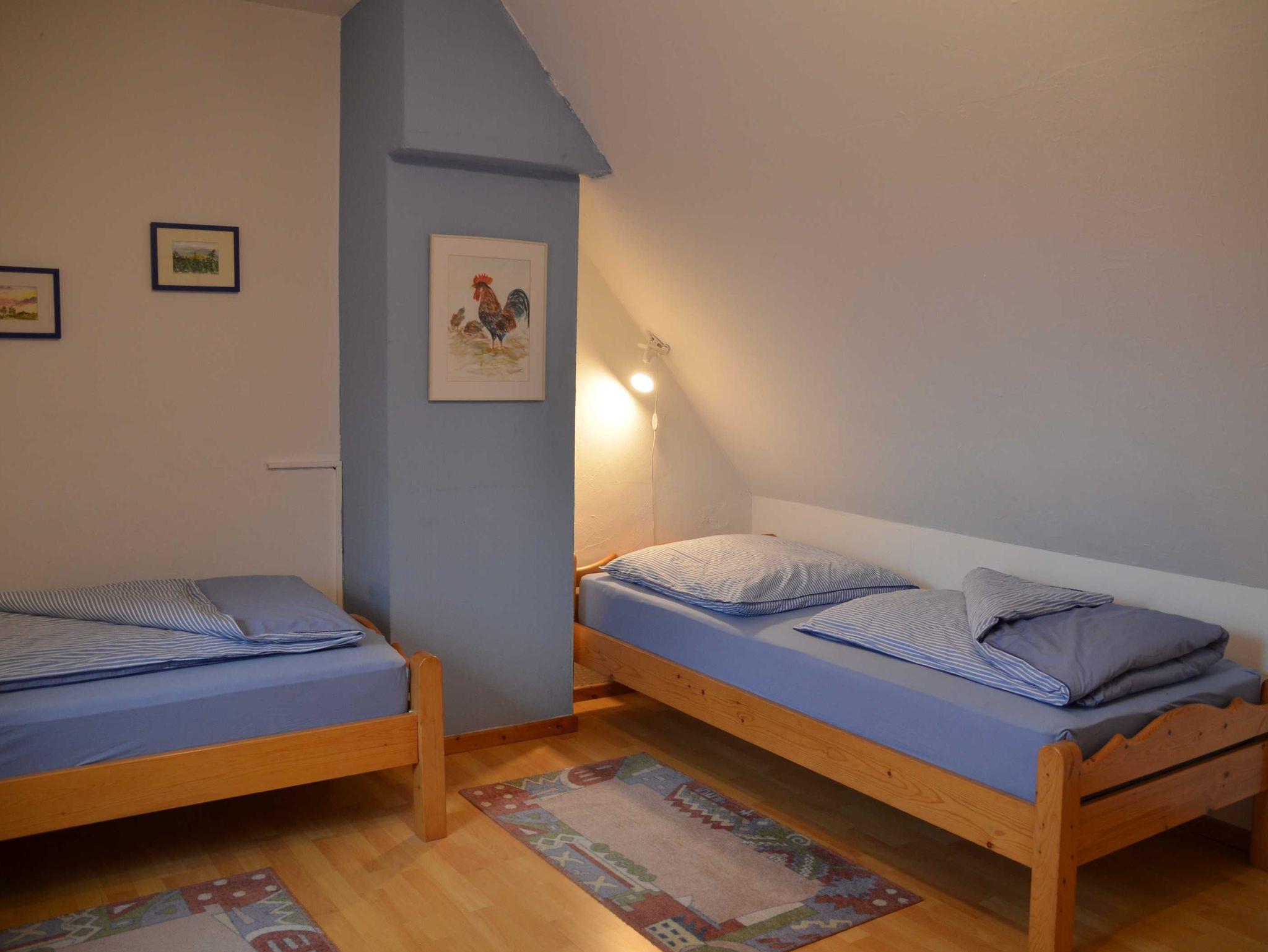 Im Obergeschoss befinden sich die beiden behaglichen Schlafräume (ein Doppelbett und zwei Einzelbetten) sowie ein Badezimmer mit Dusche. Ein Babybett steht für unsere kleinsten Gäste bereit. Für den praktischen Komfort sorgt der im Haus gelegene Waschraum mit Waschmaschine und Trockner. Dieser Raum ist zudem abschließbar und bietet Ihnen die Möglichkeit, Fahrräder sicher unterzustellen. Ein eigener Stellplatz gehört selbstverständlich zur Wohnung dazu.