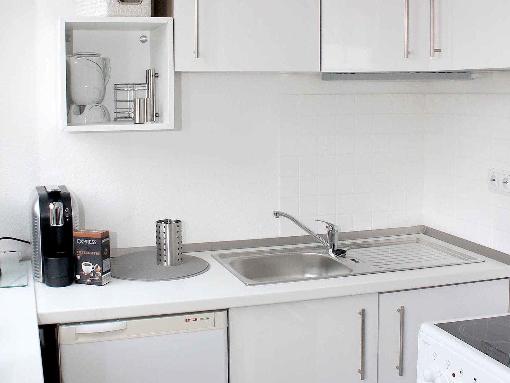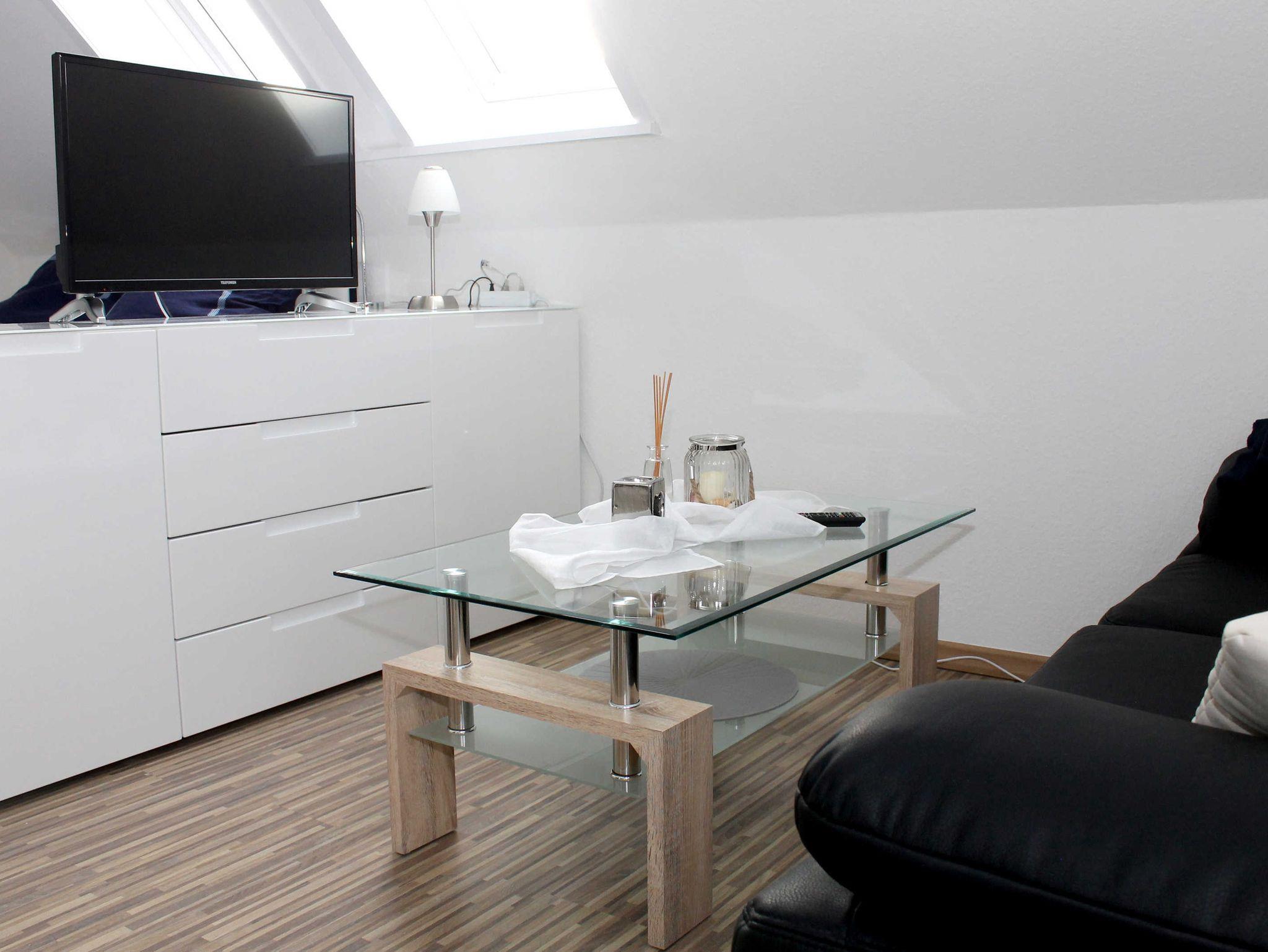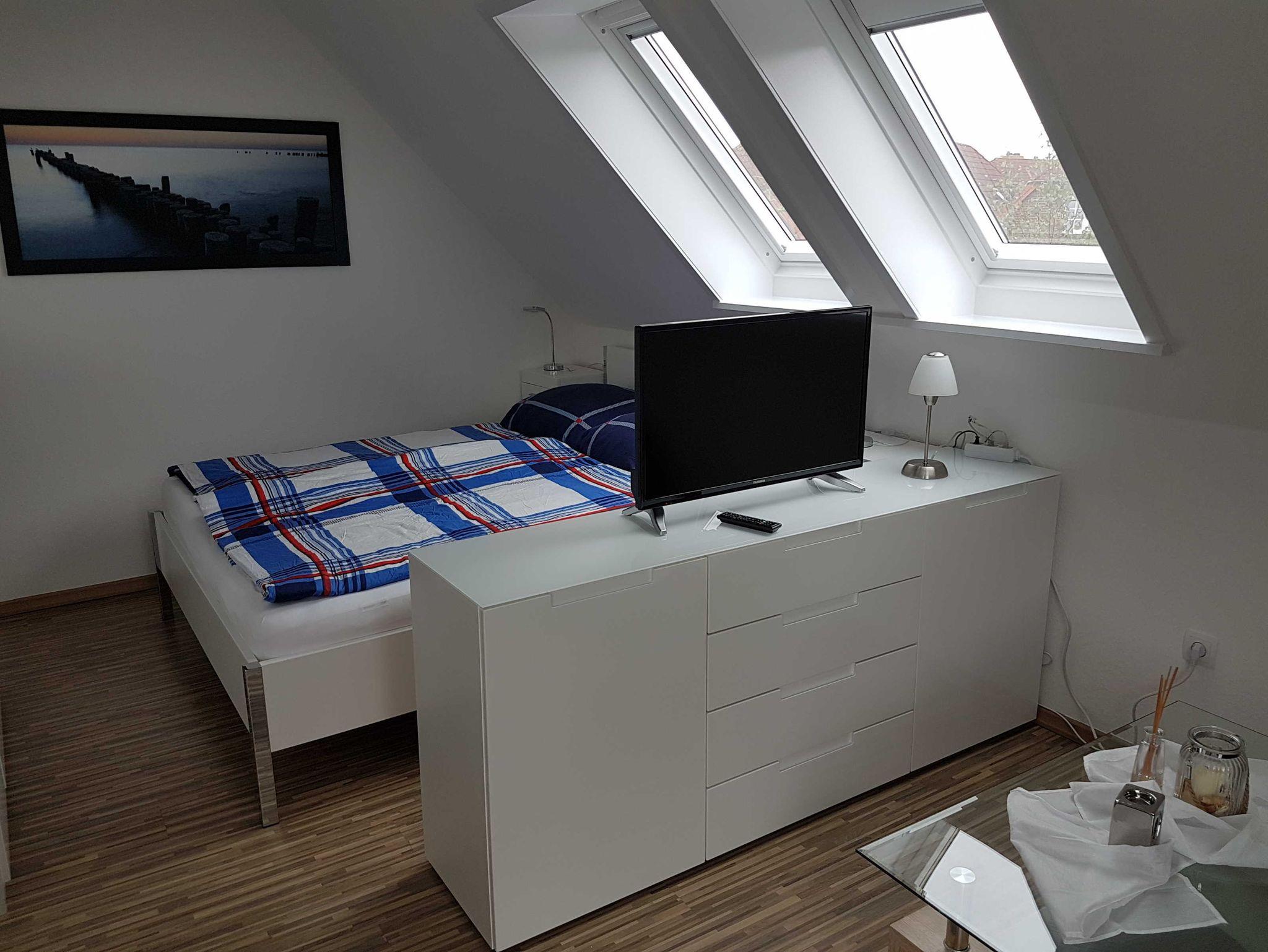 Die Wohnung befindet sich im 1.OG eines gepflegten 3 Familienhauses. Der kombinierte Wohn - Schlafraum verfügt über 1 Doppelbett 1,60 m breit, Couch, Esstisch für 2 Personen. Das Sideboard mit Flachbildschirm stellt eine kleine Trennung Zwischen Wohnen & Schlafen da. Den Fernseher kann man sowohl zum Schlaf -als auch zum Wohnbereich ausrichten. Die separate Kochecke verfügt über einen Kühlschrank mit kleinem Gefrierteil, 4 Flammen Ceran Kochfeld und Backofen, Spülmaschine. Küchenutensilien des täglichen Bedarfs, Wasserkocher, Toaster, Kaffeemaschine etc. sind selbstverständlich ausreichend vorhanden. Das Tageslichtbad ist hell, freundlich mit einer Dusche ausgestattet. Ein Parkplatz gehört zur Ferienwohnung, ebenso ein Abstellraum für Fahrräder.