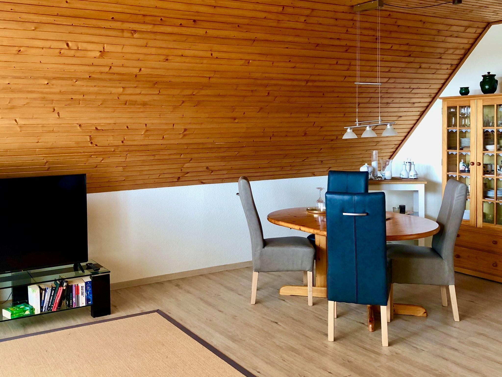 Der großzügige Wohn- und Essbereich ist mit einem gemütlichem Sofa (mit Schlaffunktion, Liegefläche 1,40 x 1,80 m), Sessel, großem Flachbild-Fernseher sowie einem Esstisch mit vier Stühlen ausgestattet. Von dort gelangen Sie auch auf den Balkon/Loggia mit Gartenmöbeln.