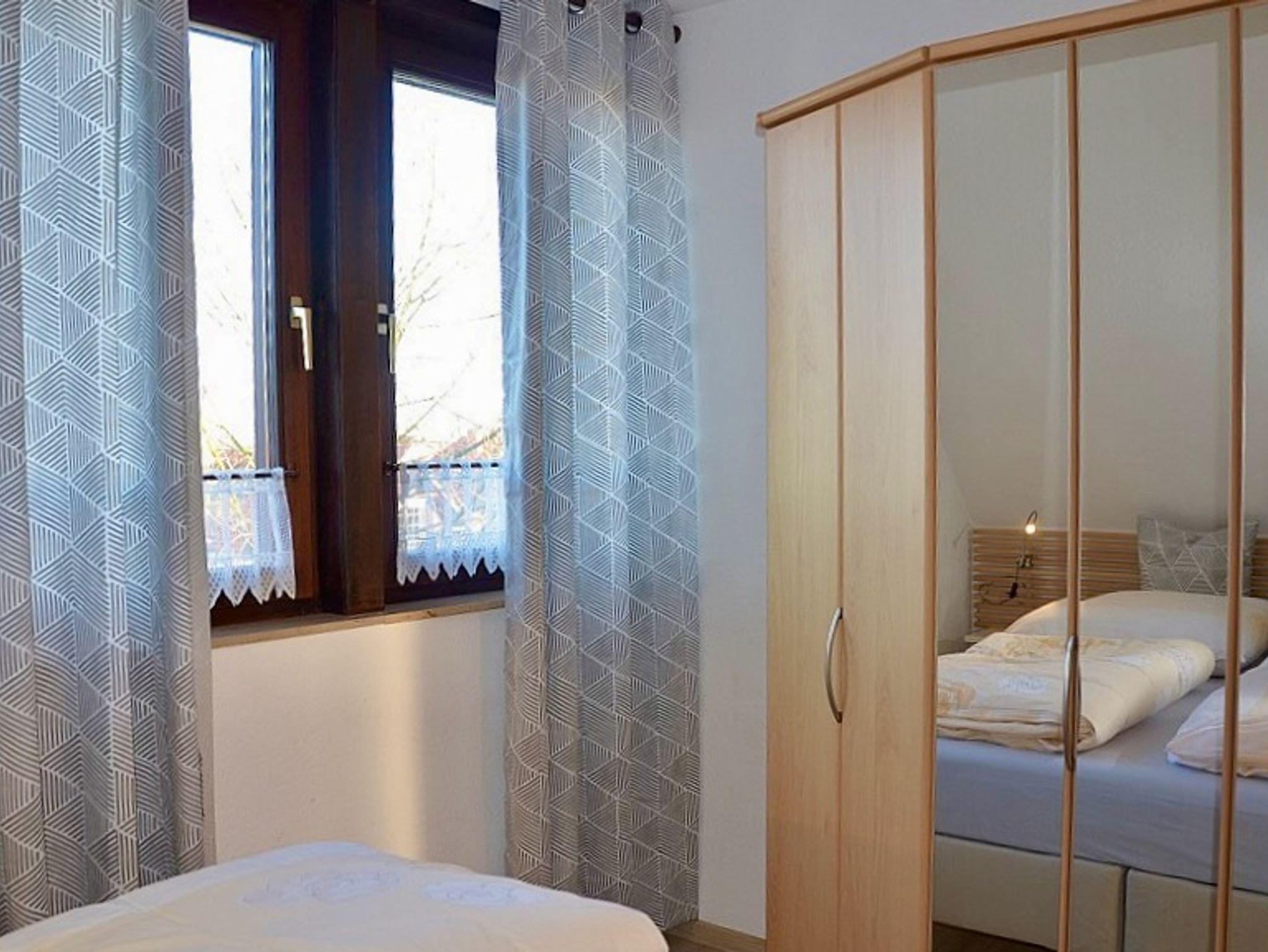 Das Schlafzimmer ist mit einem Boxspringbett (Liegefläche 1,60 x 2,00 m) und einem großen Kleiderschrank eingerichtet.